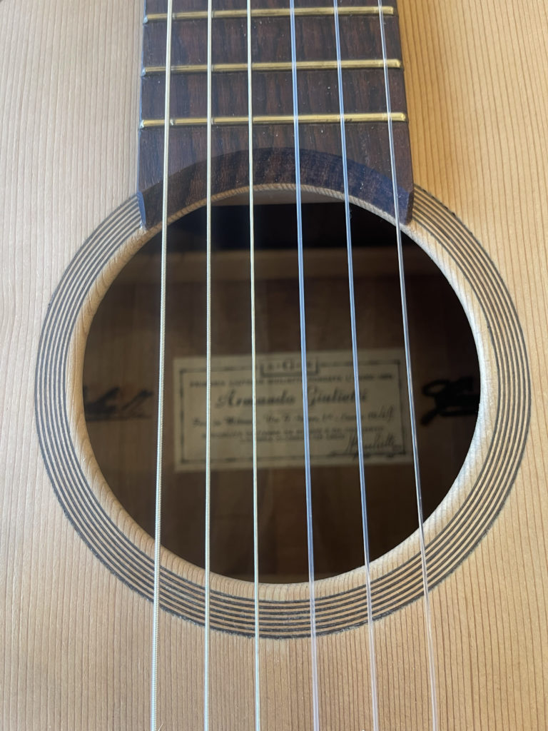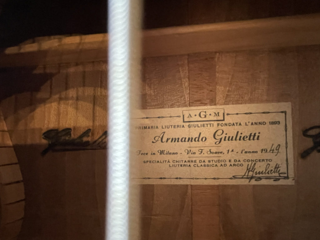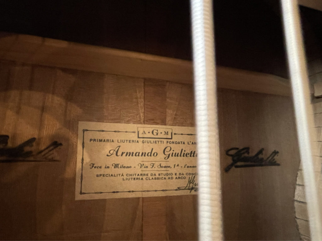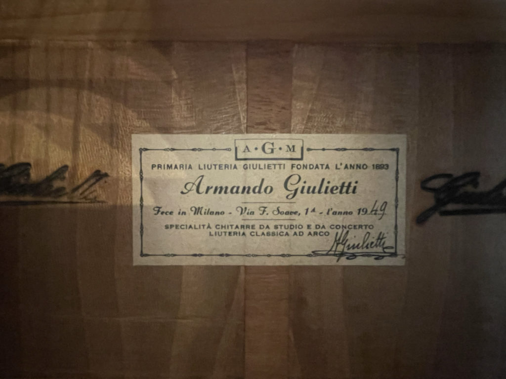 It has a warm, full tone, is well balanced, and very comfortable to play. The instrument is handmade and comes from the Milanese workshop of Armando Giulietti, who identifies himself on the label as a specialist in study and concert guitars as well as in classical string instruments.