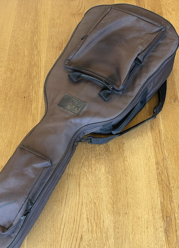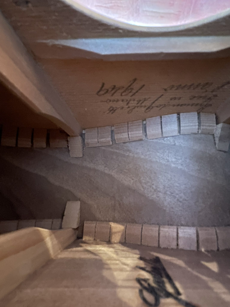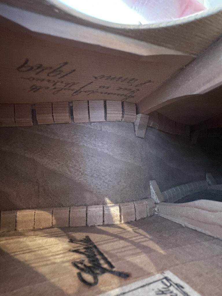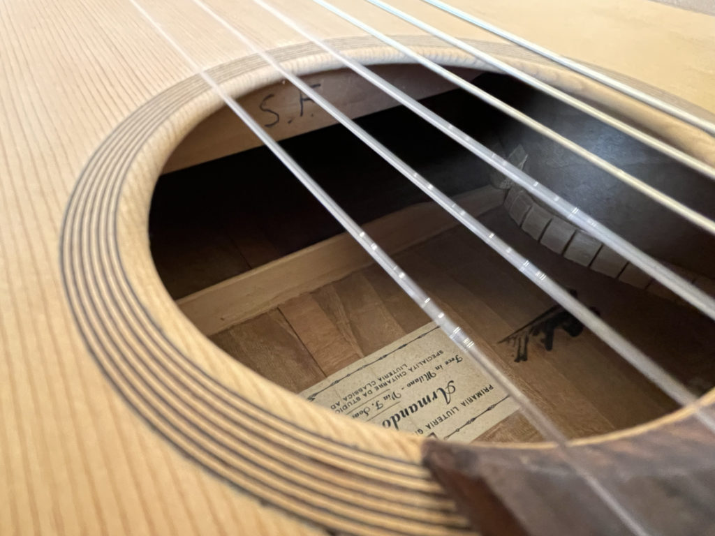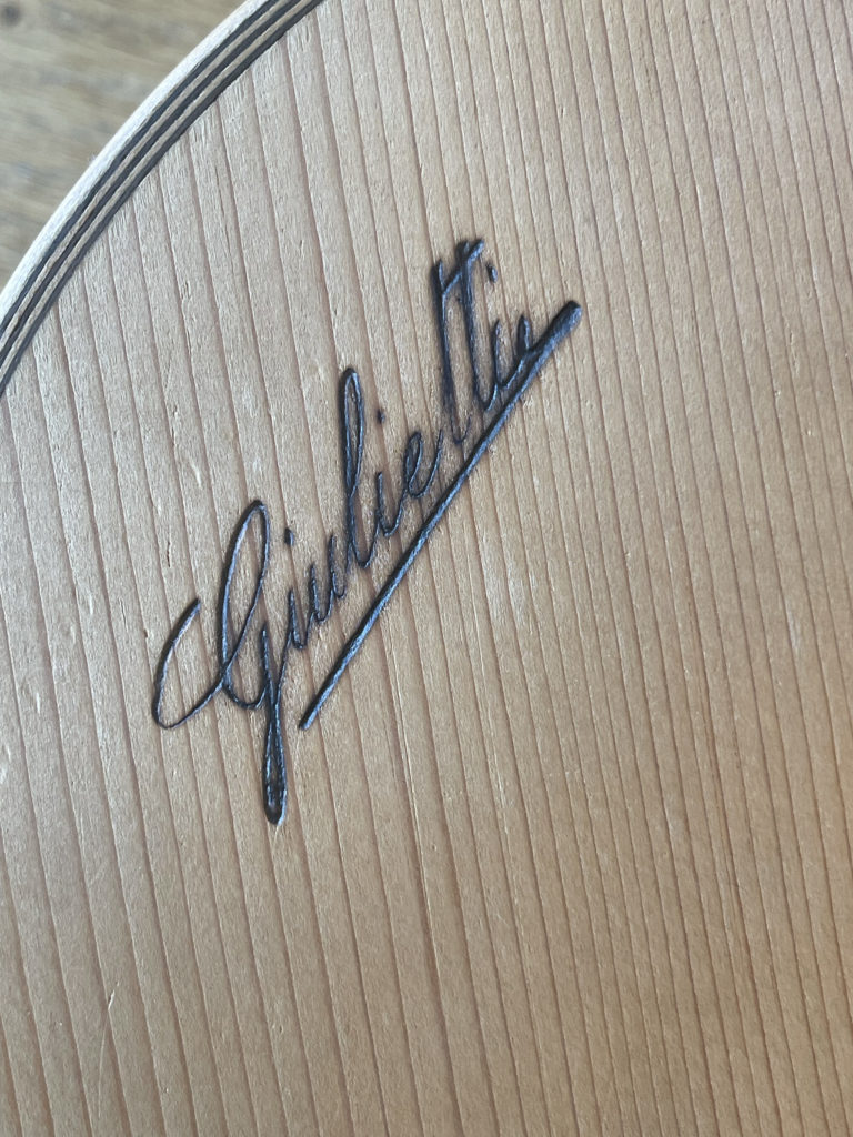 It has a warm, full tone, is well balanced, and very comfortable to play. The instrument is handmade and comes from the Milanese workshop of Armando Giulietti, who identifies himself on the label as a specialist in study and concert guitars as well as in classical string instruments.