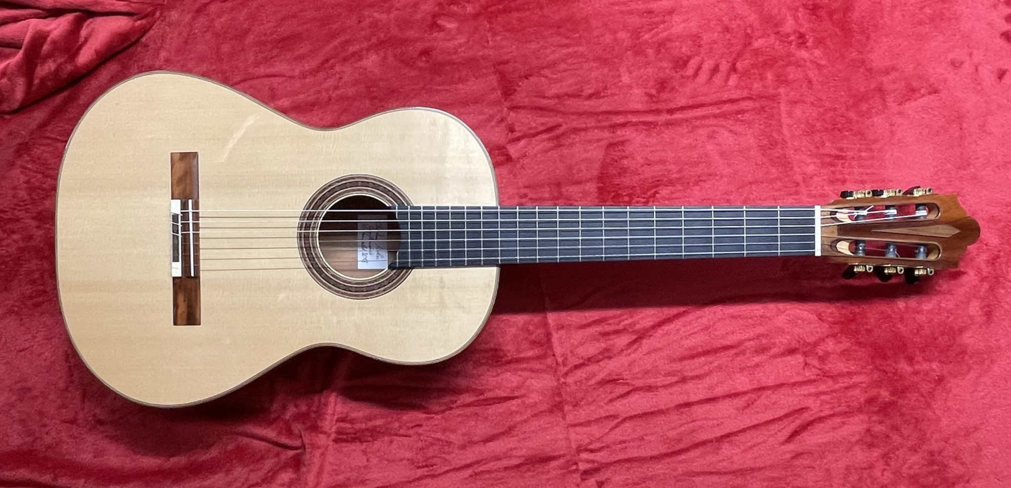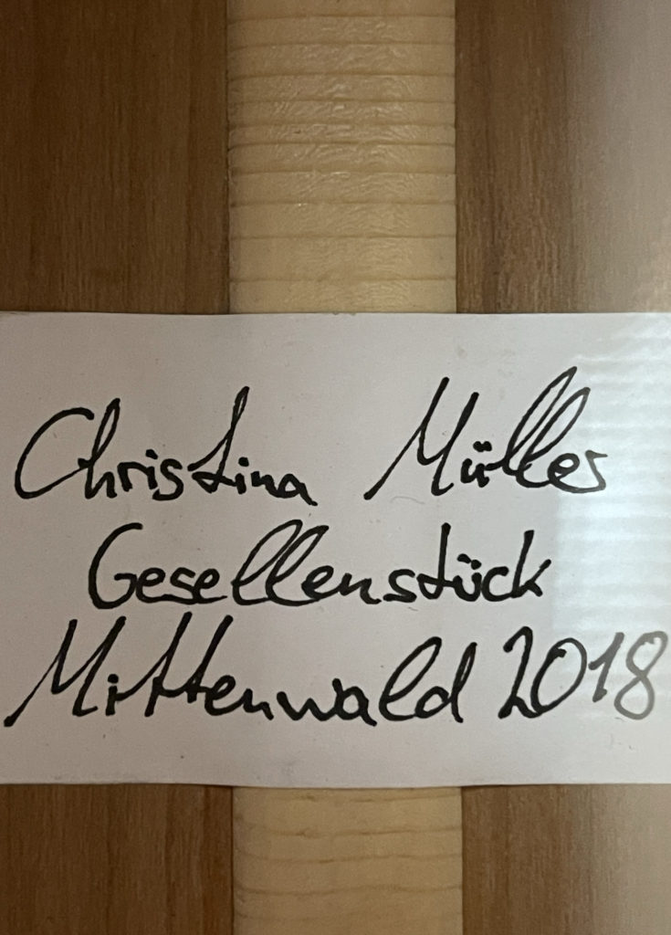 Diese Gitarre ist das Gesell:innenstück von Christina Müller und der Abschluss der Ausbildung an der staatlichen Berufsfachschule für Musikinstrumentenbau in Mittenwald. Sie ist angelehnt an ein Modell von Daniel Friederich und ausschließlich aus europäischen Hölzern gebaut. Die Gitarre wurde einige Jahre von einem Gitarrenschüler des Kreuzchor Dresden gespielt und weist deshalb leichte Gebrauchsspuren auf, was zum Preis von 3000.- CHF führt.