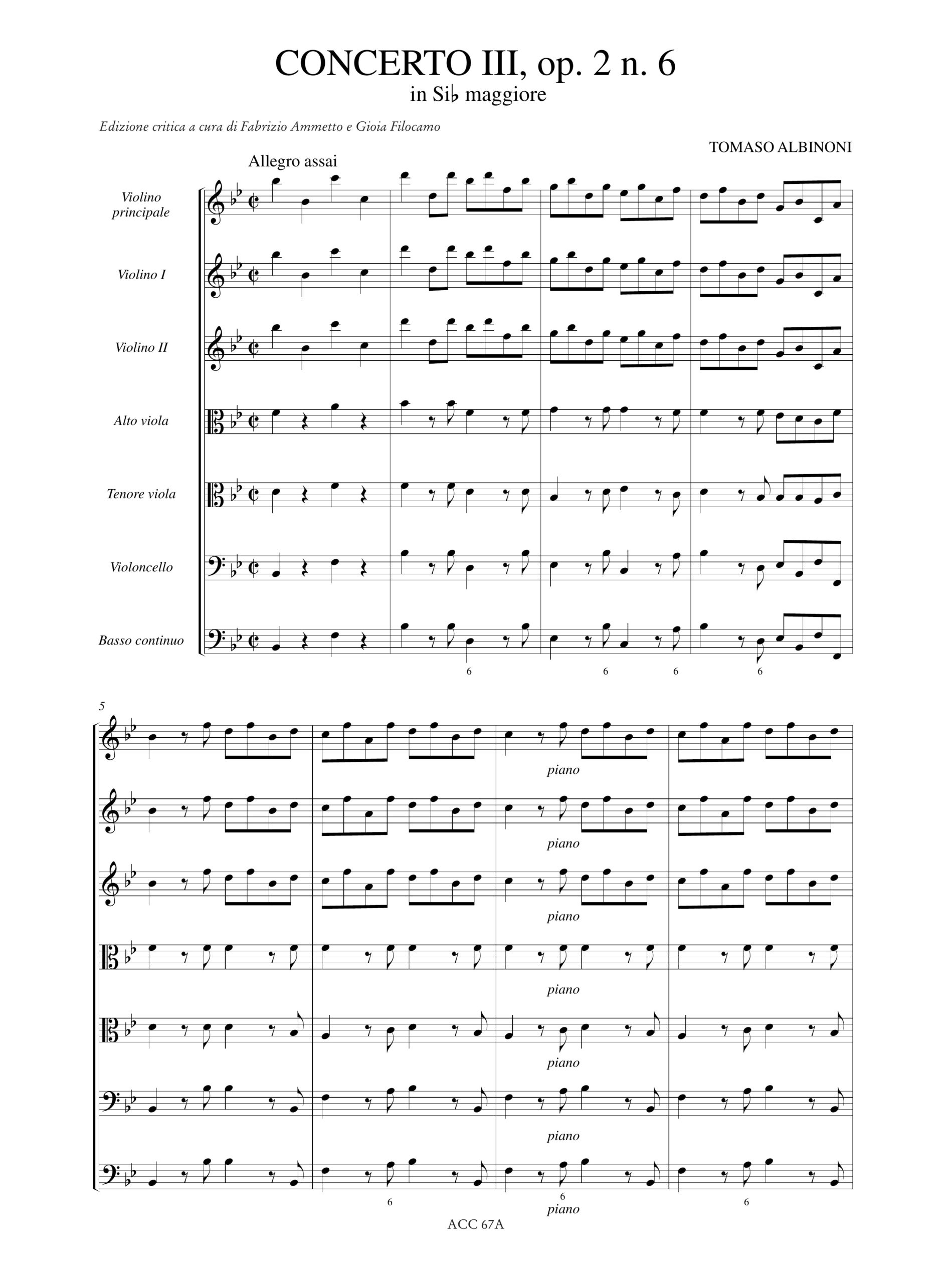 Albinoni, Tomaso: 6 Concerti ‘a cinque’, Op. 2 per Violino principale, 2 Violini, 2 Viole, Violoncello e Basso Continuo – Vol. III: Concerto III in Si bemolle maggiore, Op. 2 N. 6 [Partitura]