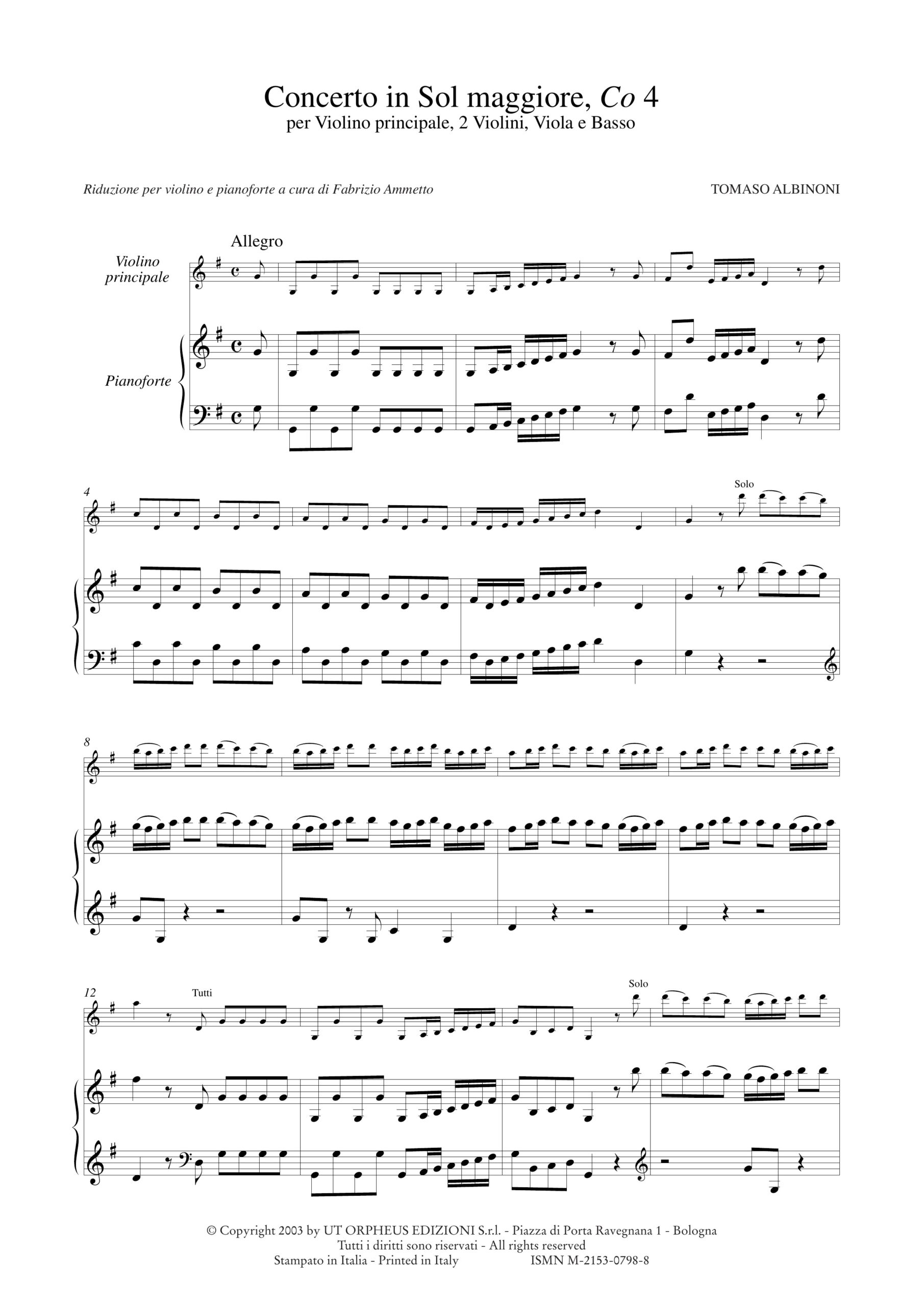 Albinoni, Tomaso: Concerti per Violino senza numero d’opus per Violino principale, 2 Violini, Viola e Basso – Vol. III: Concerto in Sol maggiore, Co 4 [Riduzione Violino e Pianoforte]