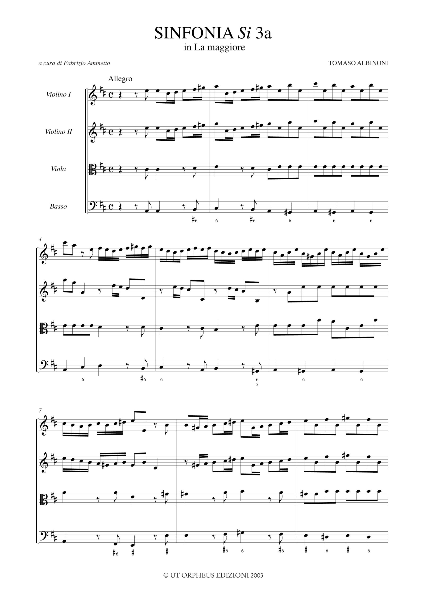 Albinoni, Tomaso: Sinfonie a quattro senza numero d’opus per 2 Violini, Viola e Basso – Vol. III: Sinfonia in La maggiore, Si 3a [Partitura]