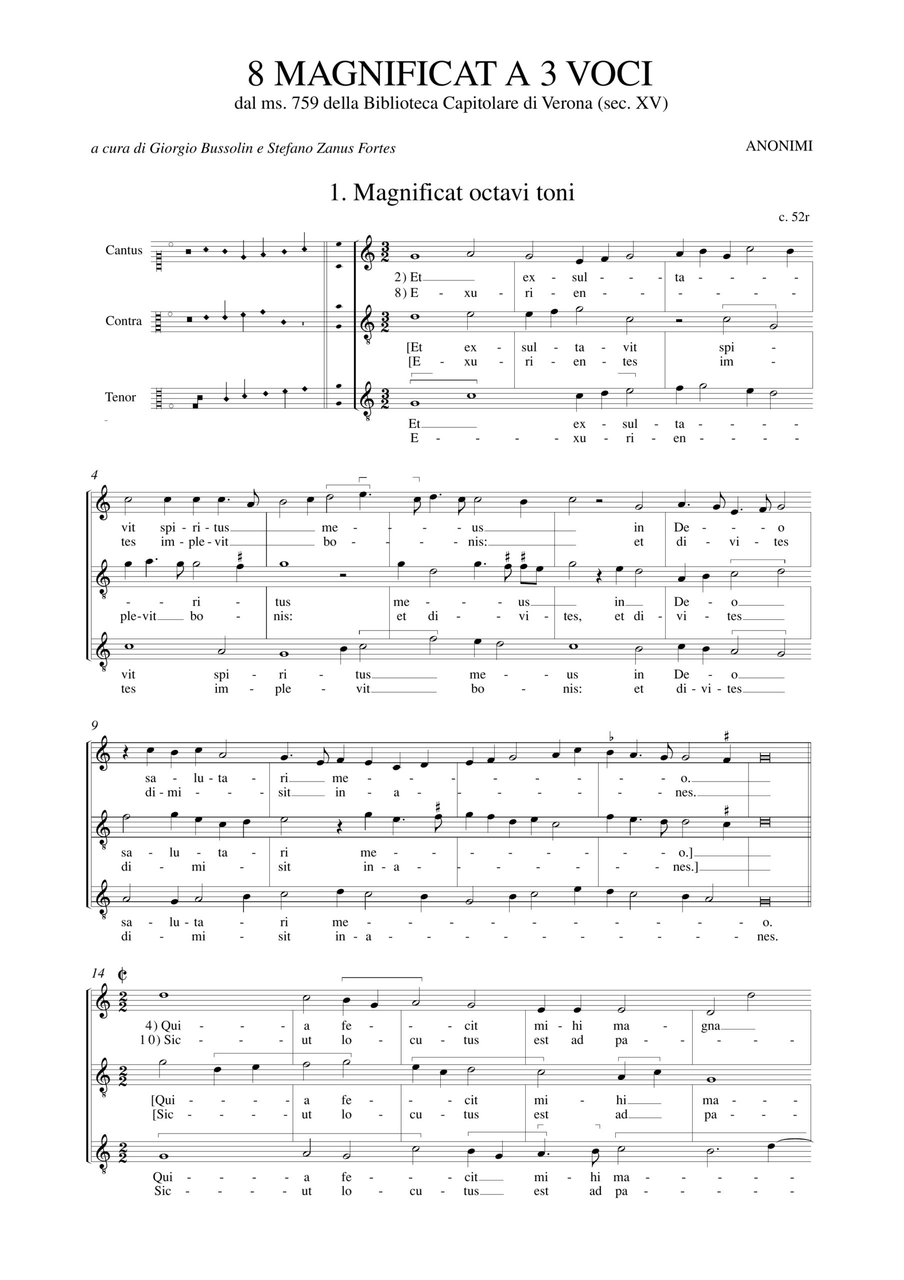 Anonimi: 8 Magnificat a 3 voci dal ms. 759 della Biblioteca Capitolare di Verona (sec. XV) [Partitura]