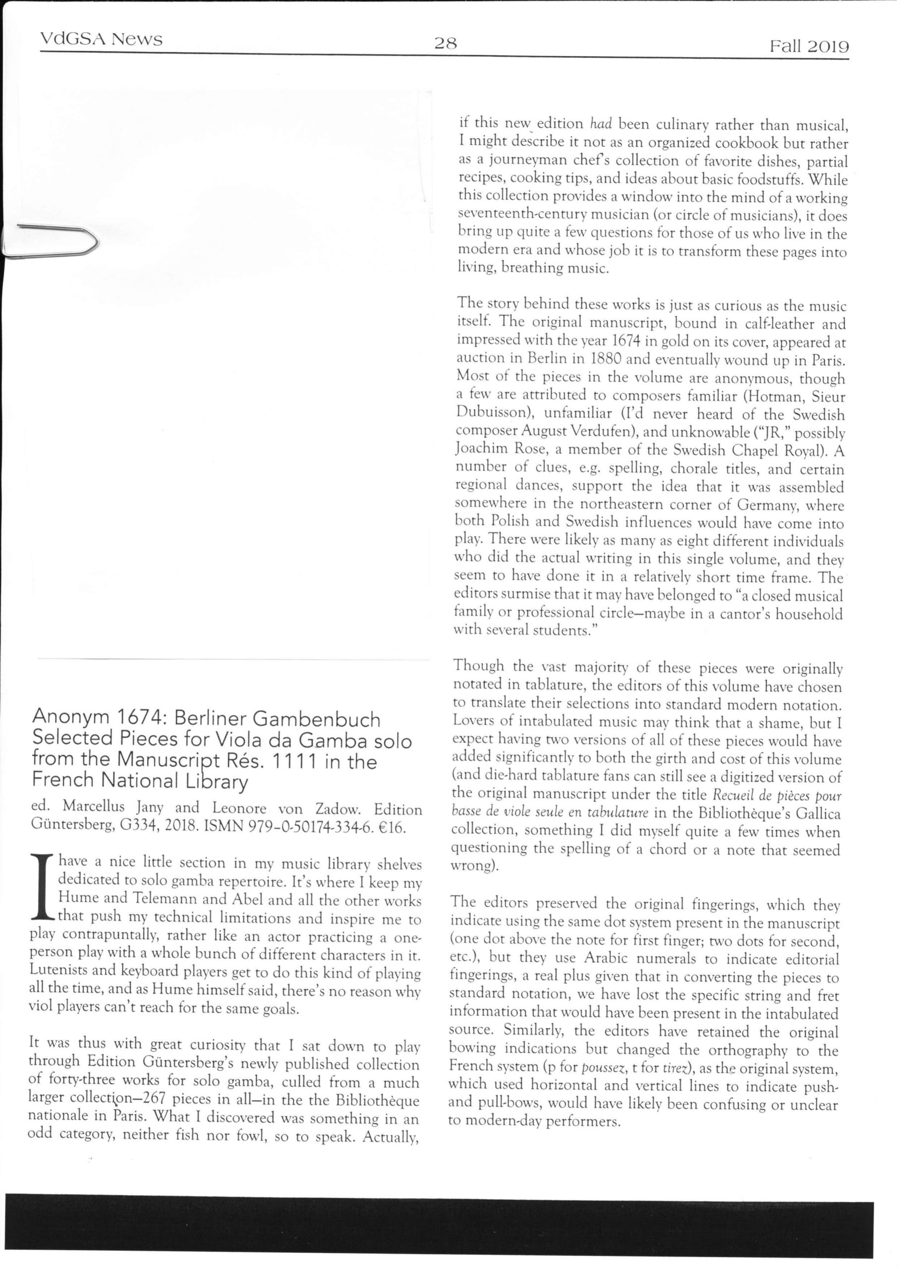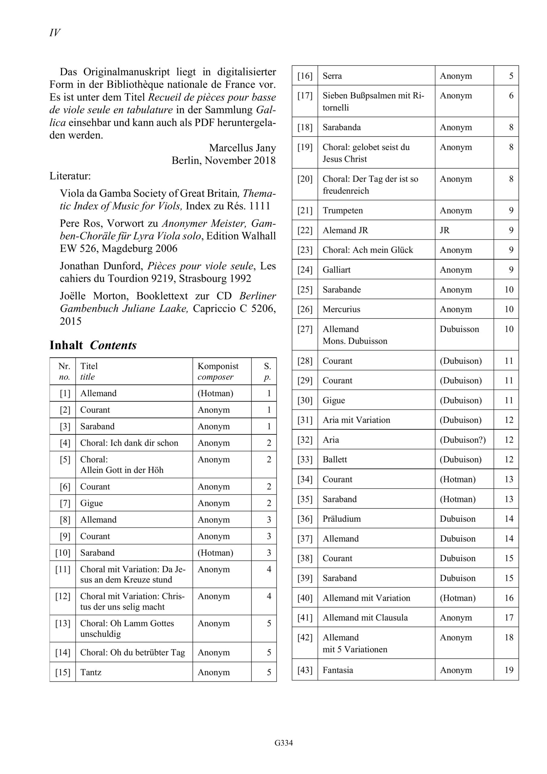 Anonym, Berliner Gambenbuch, Ausgewählte Stücke für Viola da Gamba solo aus dem Manuskript Rés. 1111 der französischen Nationalbibliothek in Paris, VdG, Alt-/Bassschlüssel, 28 S., ISMN 979-0-50174-334-6