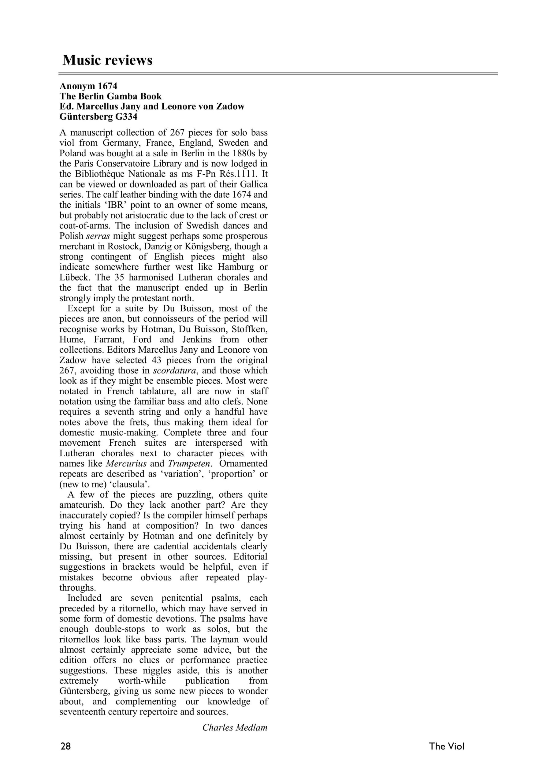 Anonym (1674) Berliner Gambenbuch – Ausgewählte Stücke für Viola da Gamba solo aus dem Manuskript Rés. 1111 der französischen Nationalbibliothek in Paris