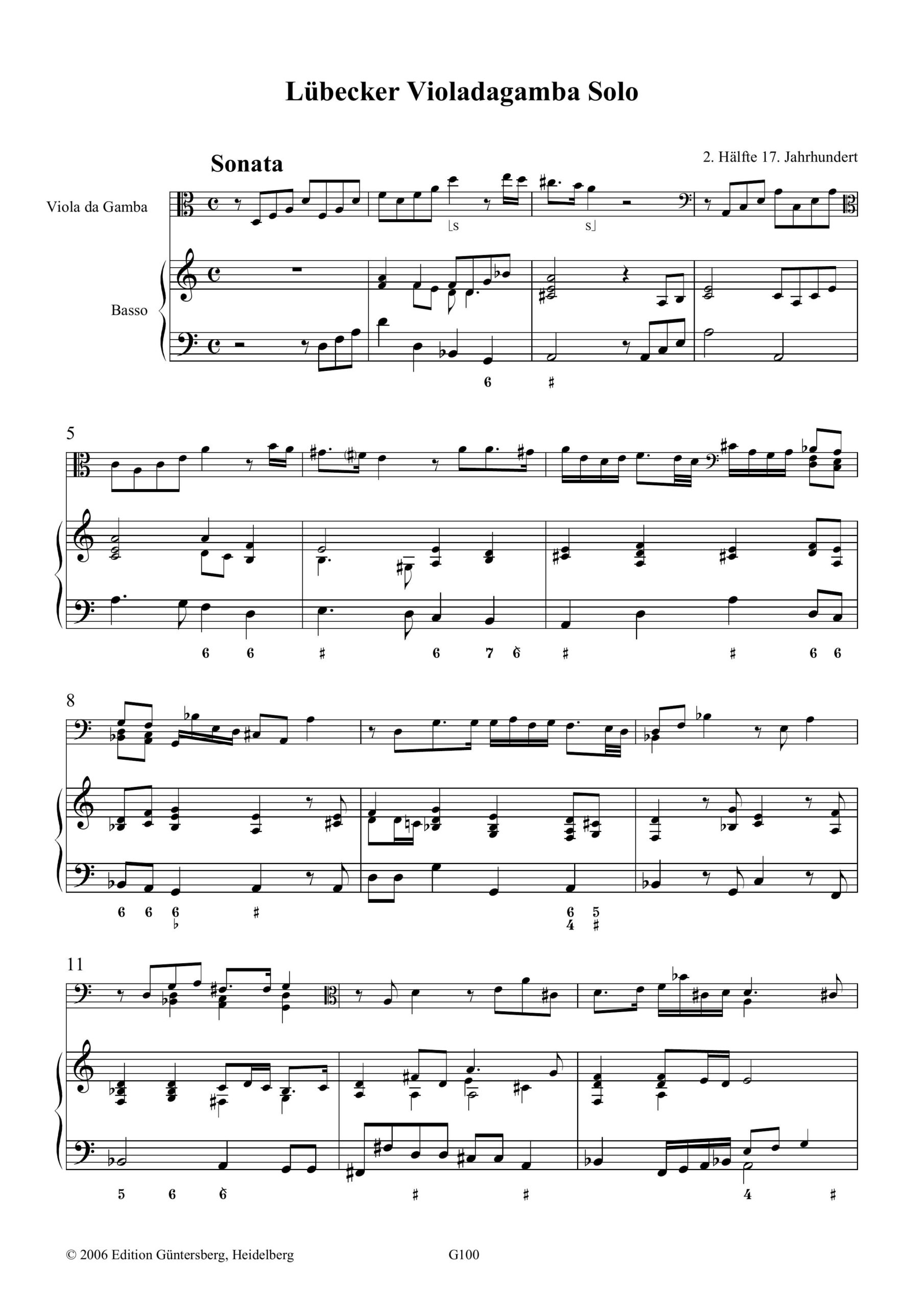 Anonym, Lübecker Violadagamba Solo, Erstdruck, VdG+Bc, Partitur mit Aussetzung, 2 Stimmen, 2. Partitur, 24 S., ISMN 979-0-50174-100-7