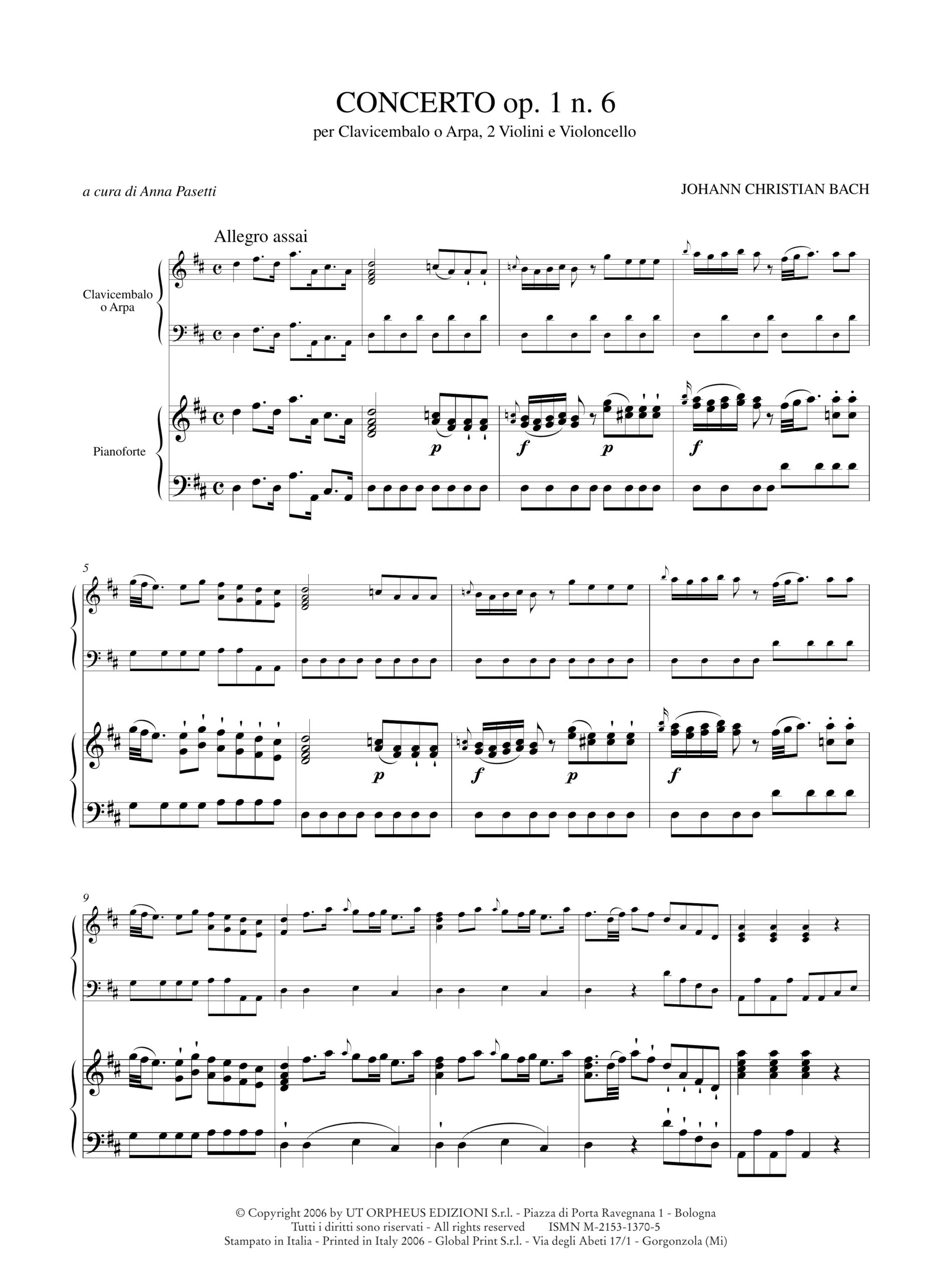 Bach, Johann Christian: Concerto Op. 1 N. 6 per Clavicembalo o Arpa, 2 Violini e Violoncello [Riduzione Clavicembalo/Arpa e Pianoforte]