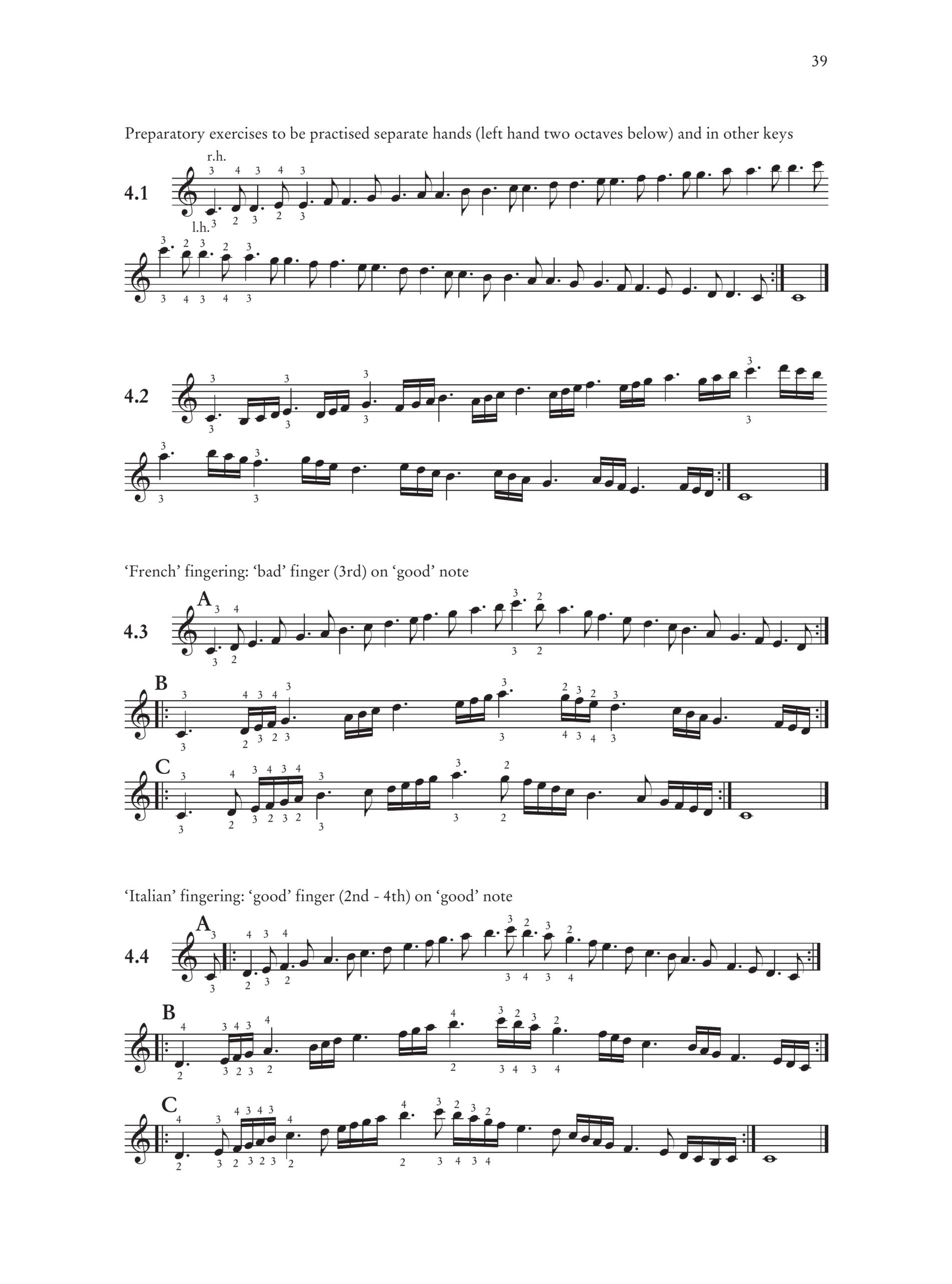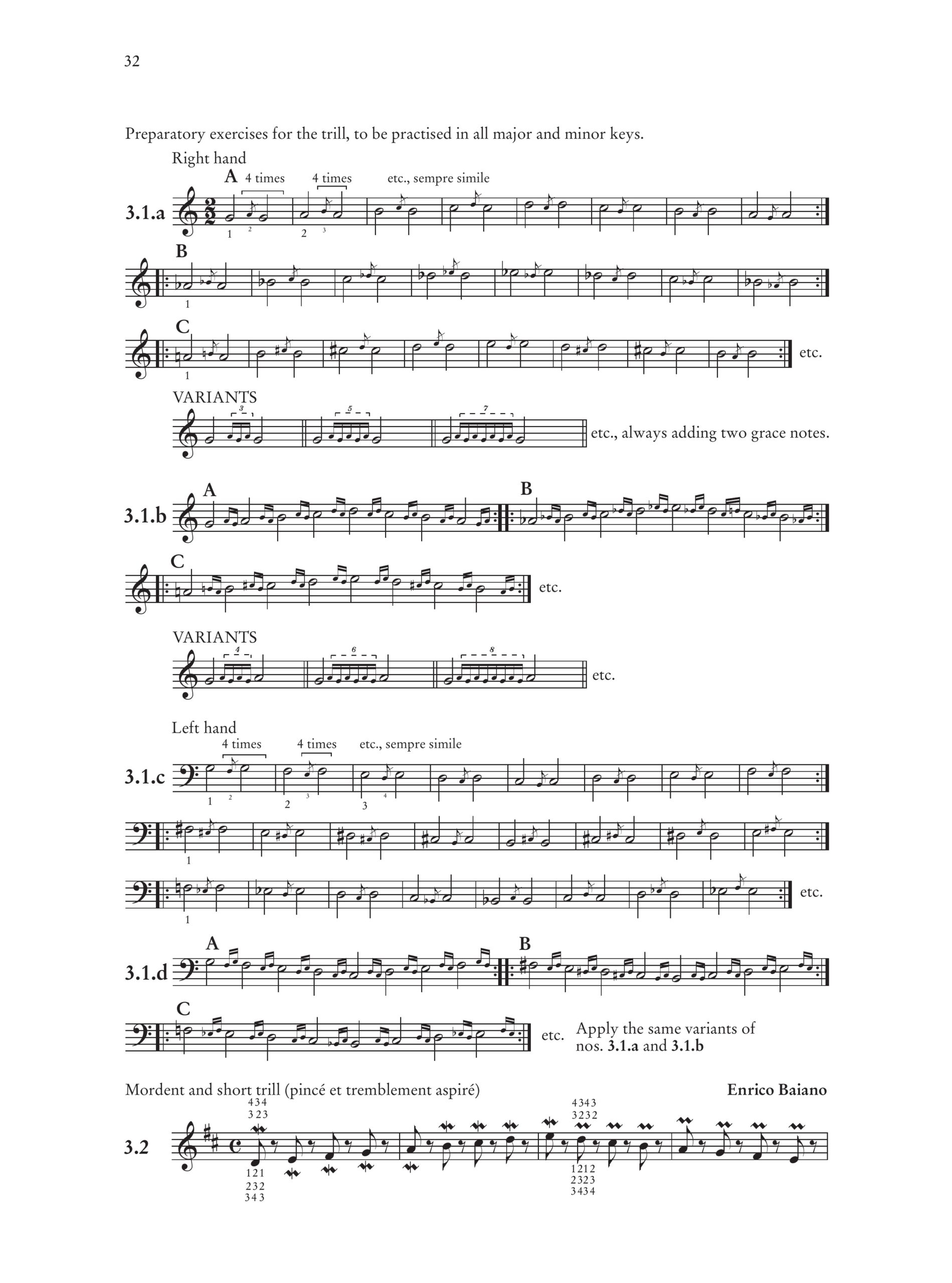 The principles outlined here can be applied with just a few modifications to the clavichord and the fortepiano. The student will find three types of musical excerpts: purely technical exercises, which isolate the specific movement to be mastered; short fragments – what François Couperin styled évolutions – in which the movement is practised in a more authentic context; and studies which are more complex in scope. The author has chosen not to start from the elementary stage, since this is dealt with in other methods, but rather to go in some detail into the intermediate and advanced levels. The material has been largely transcribed or adapted from the harpsichord repertoire; in some cases Baiano has composed it himself. Except when it comes to scales, the author has deliberately avoided quoting from the recognised manuals. In the historical literature technical instructions tend to be of a general nature, while Baiano’s aim here is to ‘take students by the hand’ and help them gradually to acquire (or perfect) the fundamental mechanisms which are indispensable for successful harpsichord playing.