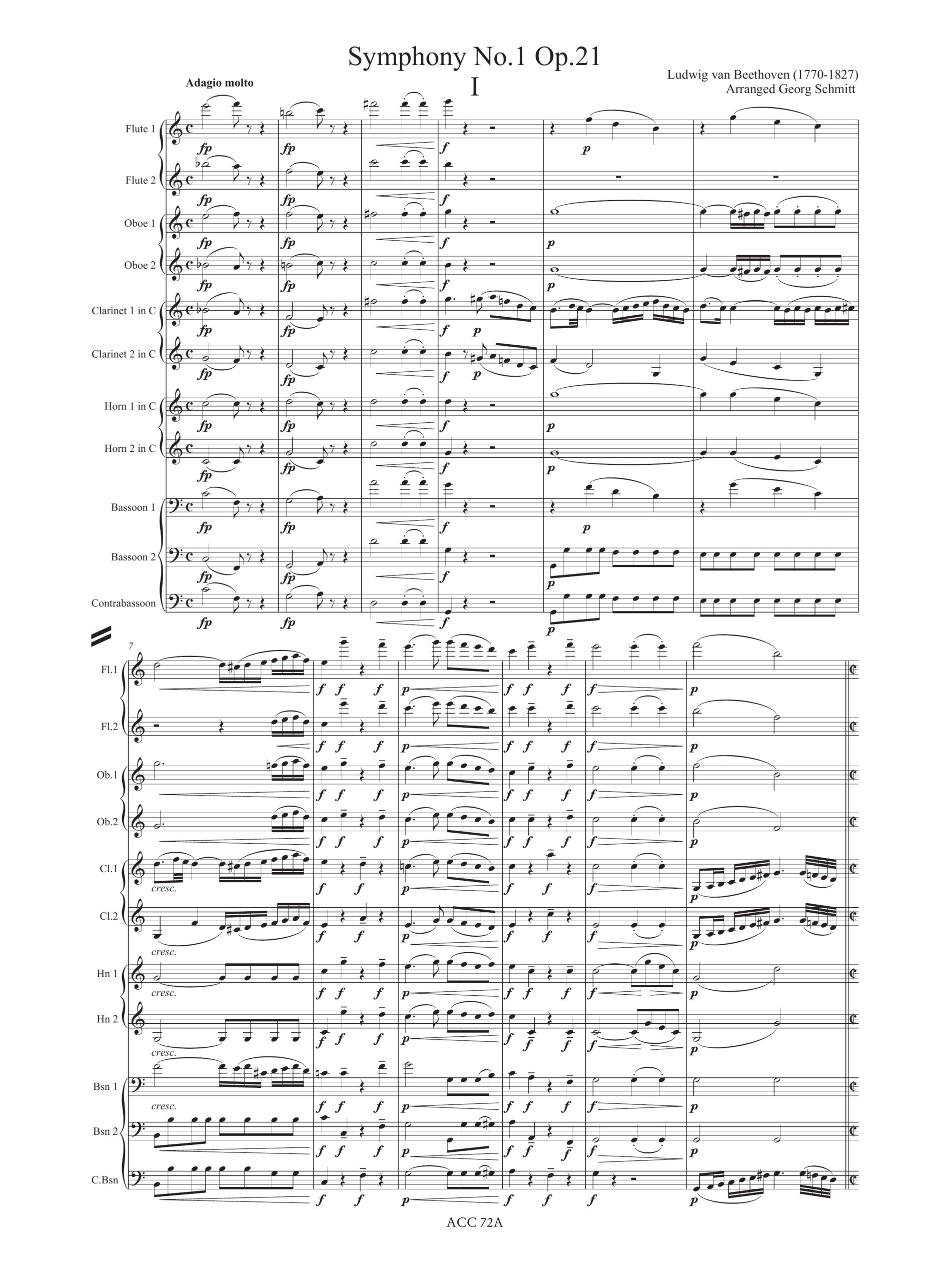 Beethoven, Ludwig van: Sinfonia N. 1 Op. 21 (trascr. Georg Schmitt – Öhringen 1817) per 2 Flauti, 2 Oboi, 2 Clarinetti, 2 Corni, 2 Fagotti e Controfagotto [Partitura]