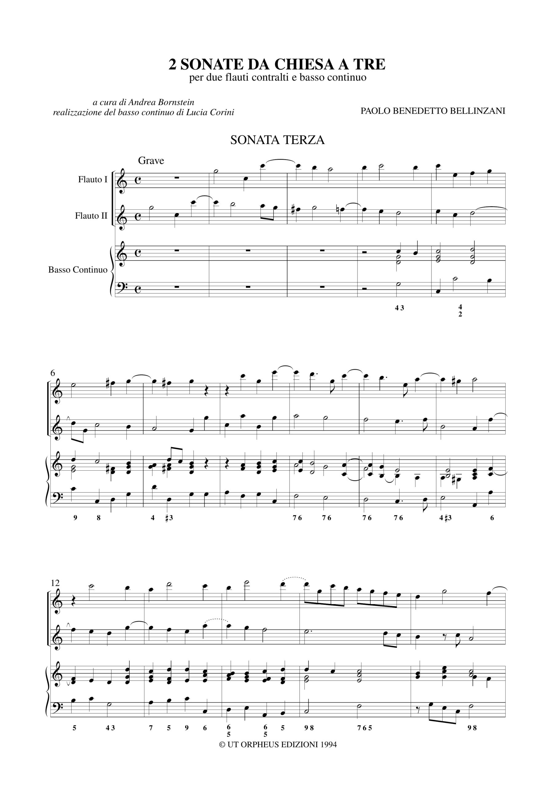 Bellinzani, Paolo Benedetto: 2 Sonate da chiesa a tre ad imitazione di quelle di Arcangelo Corelli per 2 Flauti Dolci Contralti e Basso Continuo