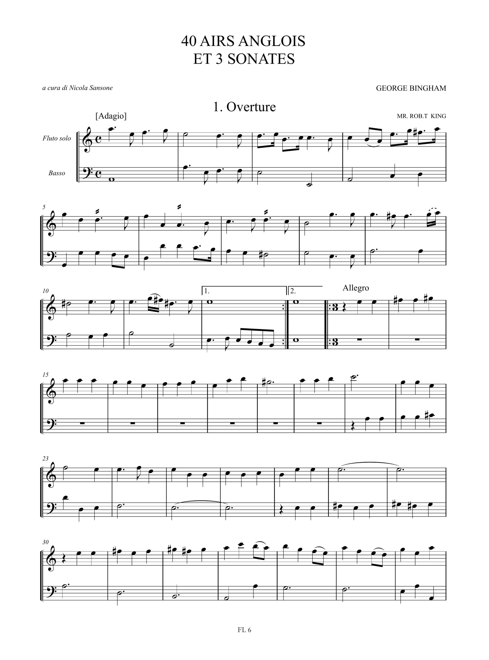 Bingham, George: 40 Airs Anglois et 3 Sonates per Flauto Dolce Contralto e Basso Continuo (Nn. 1-40 e 43) e 2 Flauti Dolci Contralti (Nn. 41 e 42)