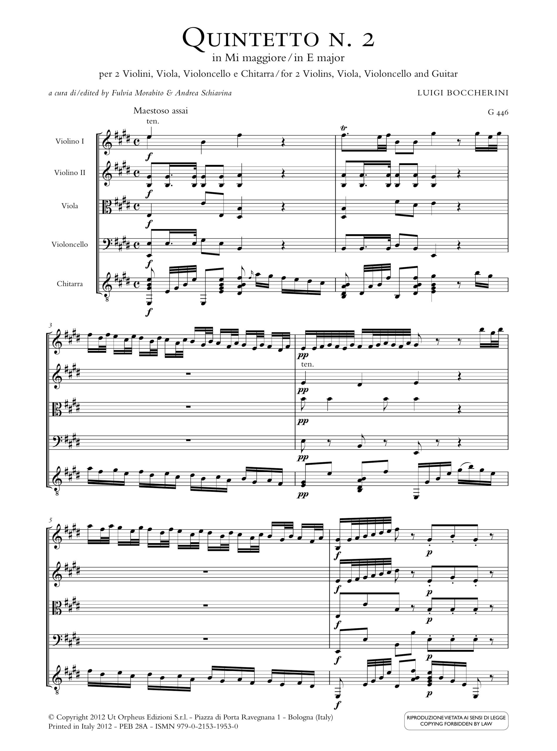 Boccherini, Luigi: Quintetto N. 2 in Mi maggiore (G 446) per 2 Violini, Viola, Violoncello e Chitarra [Partitura]