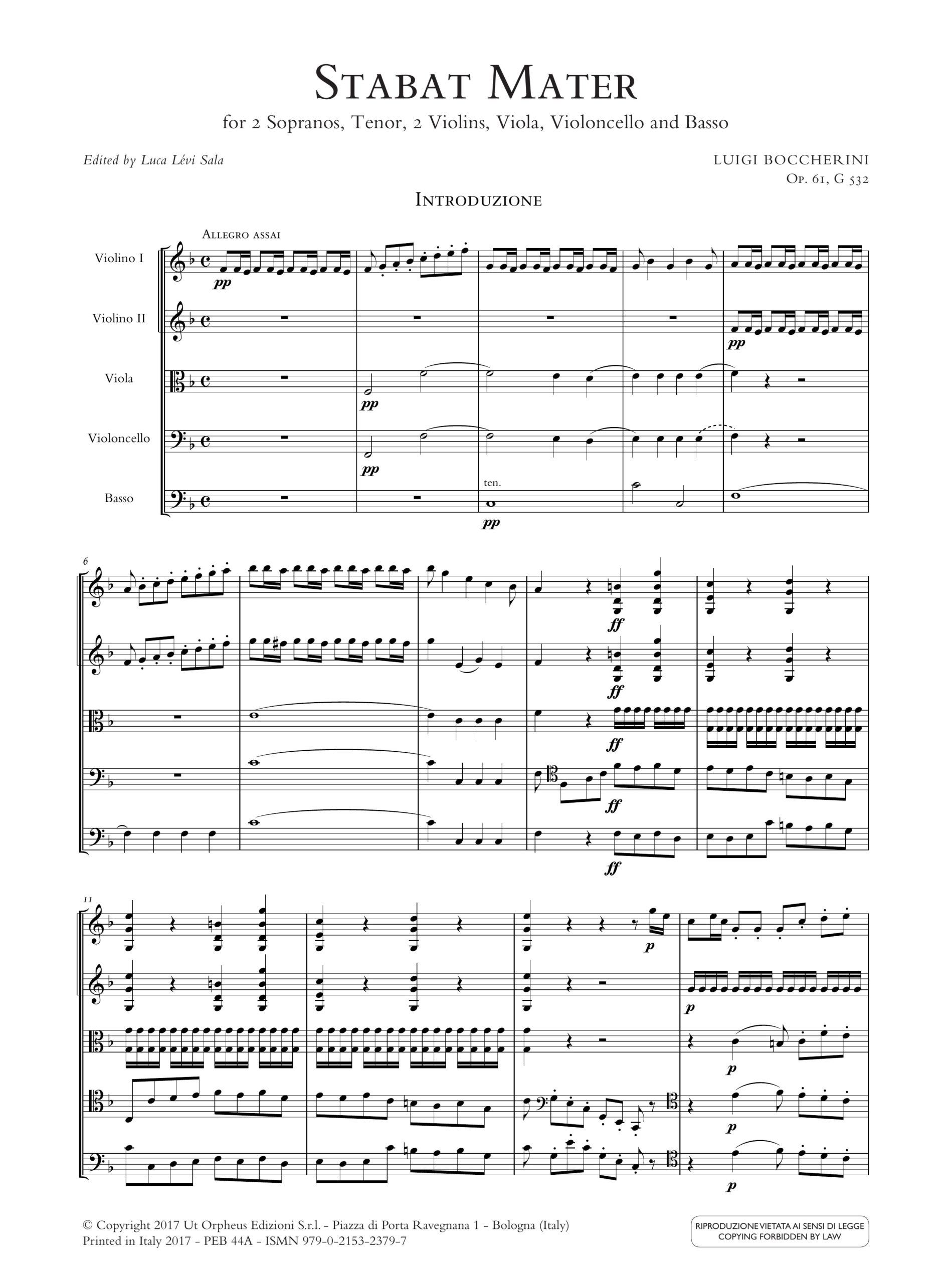 Autore: Luigi Boccherini (1743-1805) Curatore : Luca Lévi Sala Data pubblicazione : 21/2/2017 Collana : Luigi Boccherini – Opera Omnia Tipologia : Partitura Pagine : pp. 108 Formato : 230×310 mm Rilegatura : Brossura (copertina morbida) ISMN : 979-0-2153-2379-7 Codice : PEB 44A | Curatore: Luca Lévi Sala | Data pubblicazione: 21/2/2017