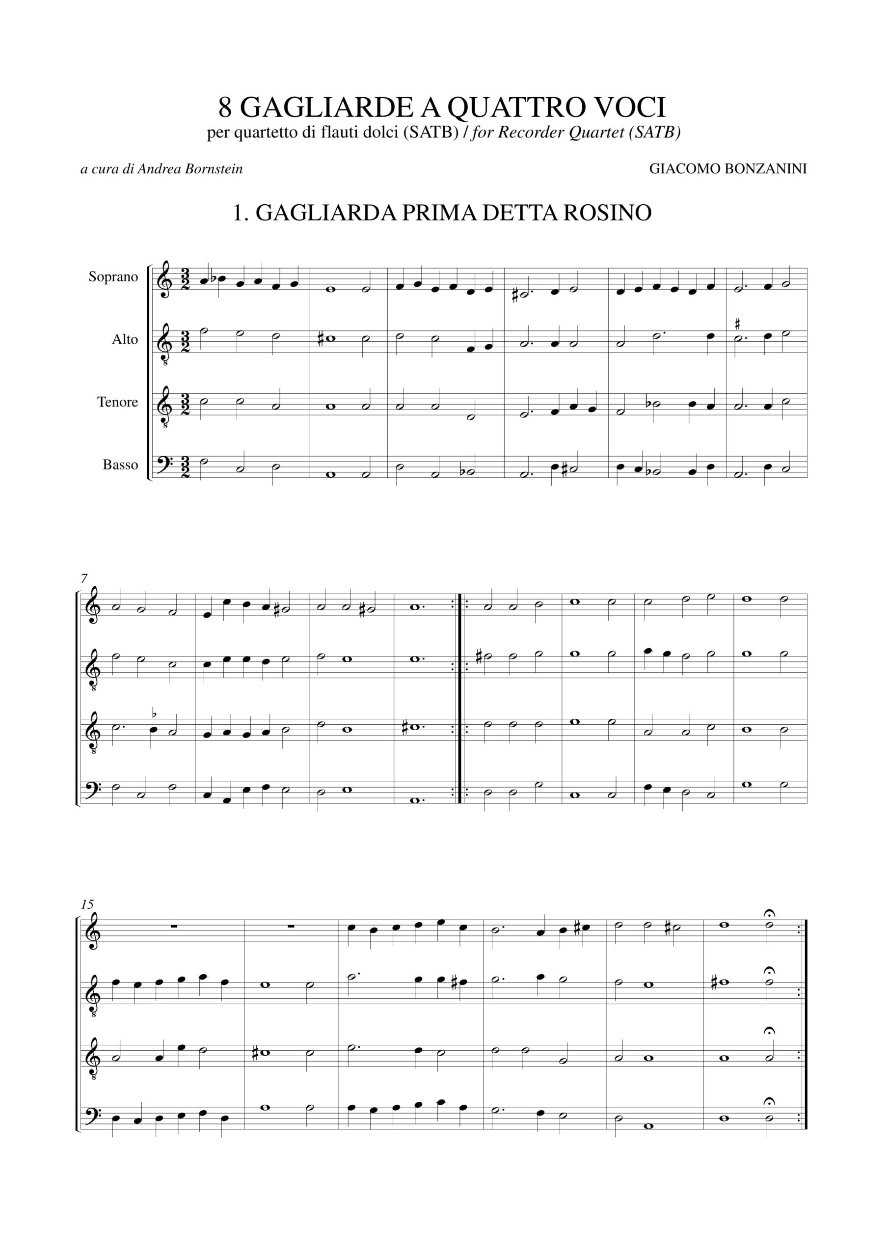 Bonzanini, Giacomo: 8 Gagliarde a quattro voci (Venezia 1616) per Quartetto di Flauti Dolci (SATB)