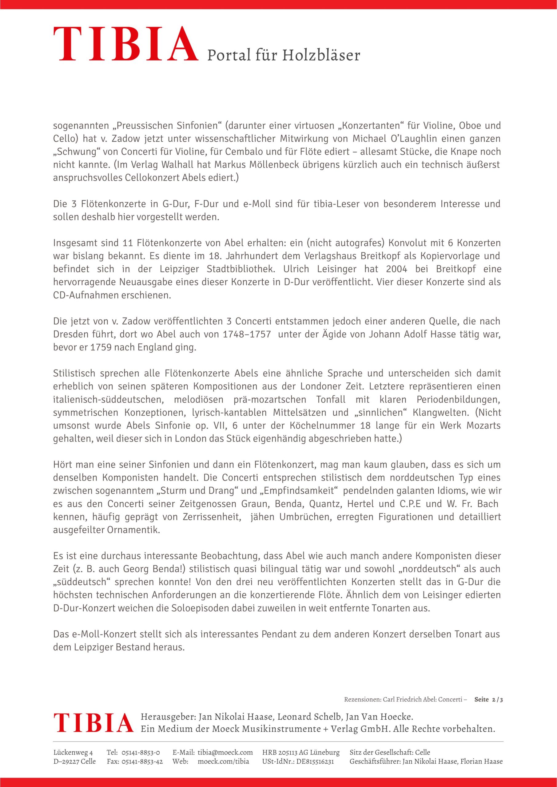 Dieses bisher unveröffentlichte Flötenkonzert Abels stammen höchstwahrscheinlich aus seiner Dresdener Zeit, d. h. es ist vor seiner Abreise nach England im Jahr 1759 entstanden. Es ist in der Sammlung des Carl Jakob Christian Klipfel überliefert, welche sich heute in der Notenbibliothek der Sing-Akademie zu Berlin befindet. Klipfel war Amateurmusiker und Porzellanmaler in Meissen und gut mit Friedrich dem Großen bekannt, der ihn später zum Mitdirektor der Königlichen Porzellanmanufaktur Berlin machte.