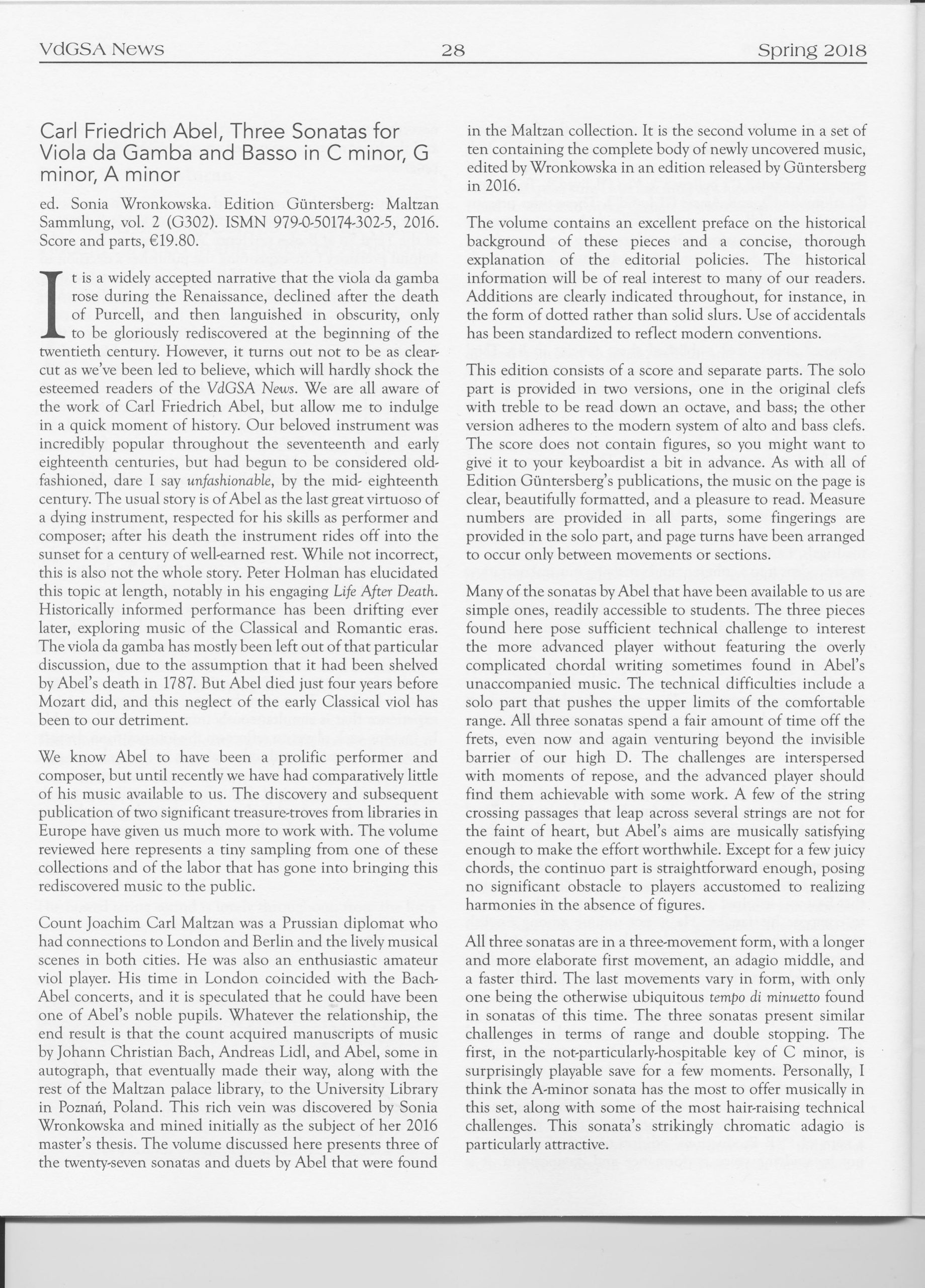 Abel, Maltzan-Sammlung, AbelWV B91–93 (A2:55A–57A), Band 2, Drei Sonaten (C-Moll, G-Moll, A-Moll), Erstausgabe, VdG+Bc, Partitur und 3 Stimmen (Violin- und Altschlüssel), 68 S., ISMN 979-0-50174-302-5