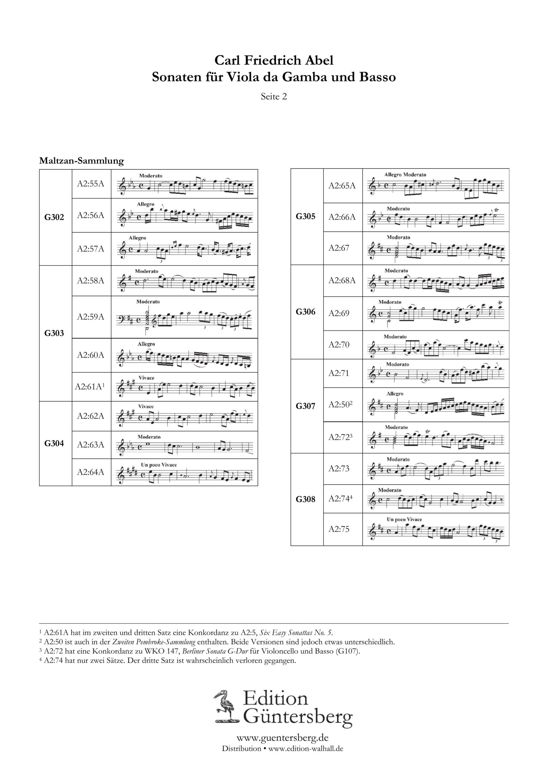 Abel, Maltzan-Sammlung, AbelWV B94–97 (A2:58A–61A), Band 3, Vier Sonaten (G-Dur, D-Dur, C-Moll, A-Dur), Erstausgabe, VdG+Bc, Partitur und 3 Stimmen (Violin- und Altschlüssel), 60 S., ISMN 979-0-50174-303-2