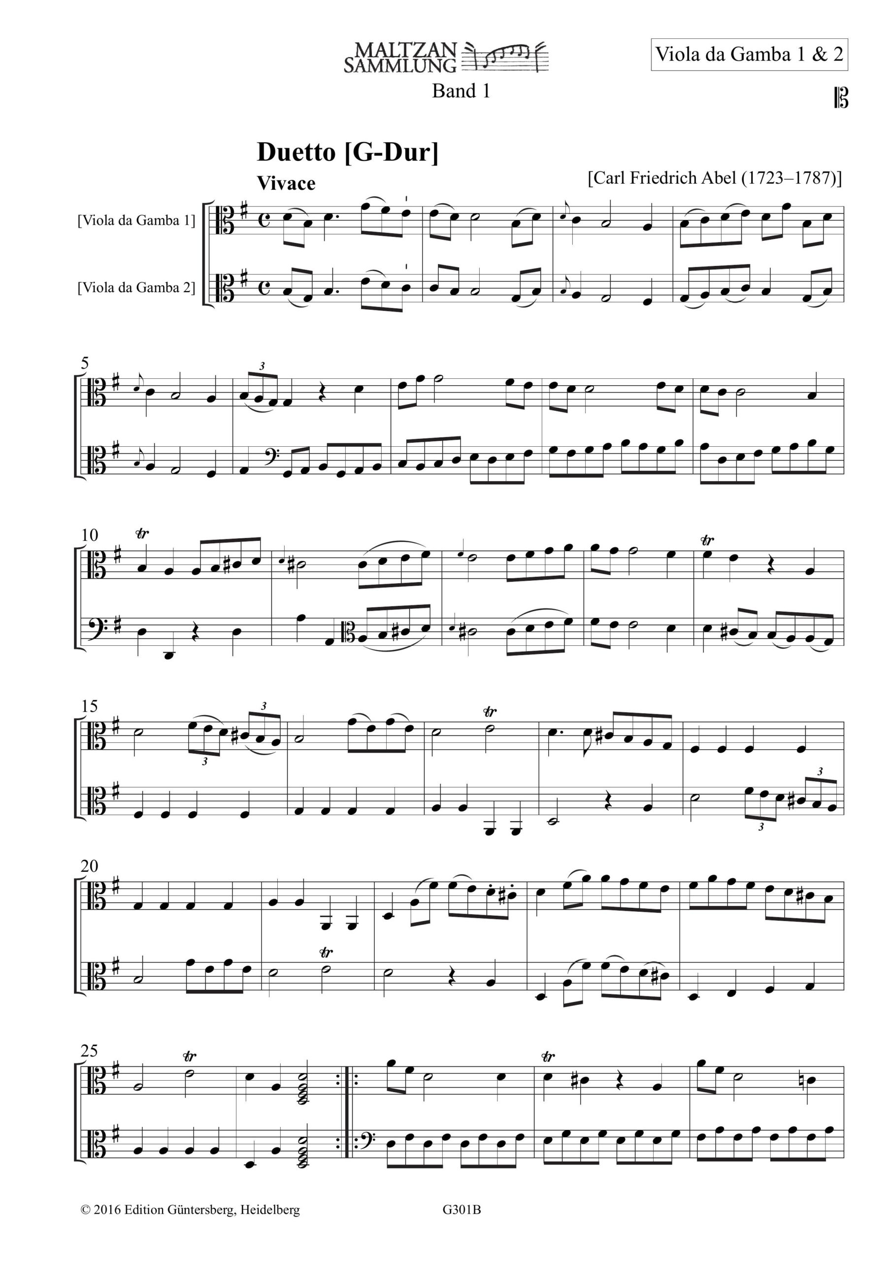 Abel, Maltzan-Sammlung, AbelWV B90 (A3:5A), Band 1, Duetto G-Dur, Erstausgabe, 2VdG, 4 Partituren (Violin- und Altschlüssel), 28 S., ebenfalls enthalten: Inhalt des Maltzan-Manuskripts, ISMN 979-0-50174-301-8