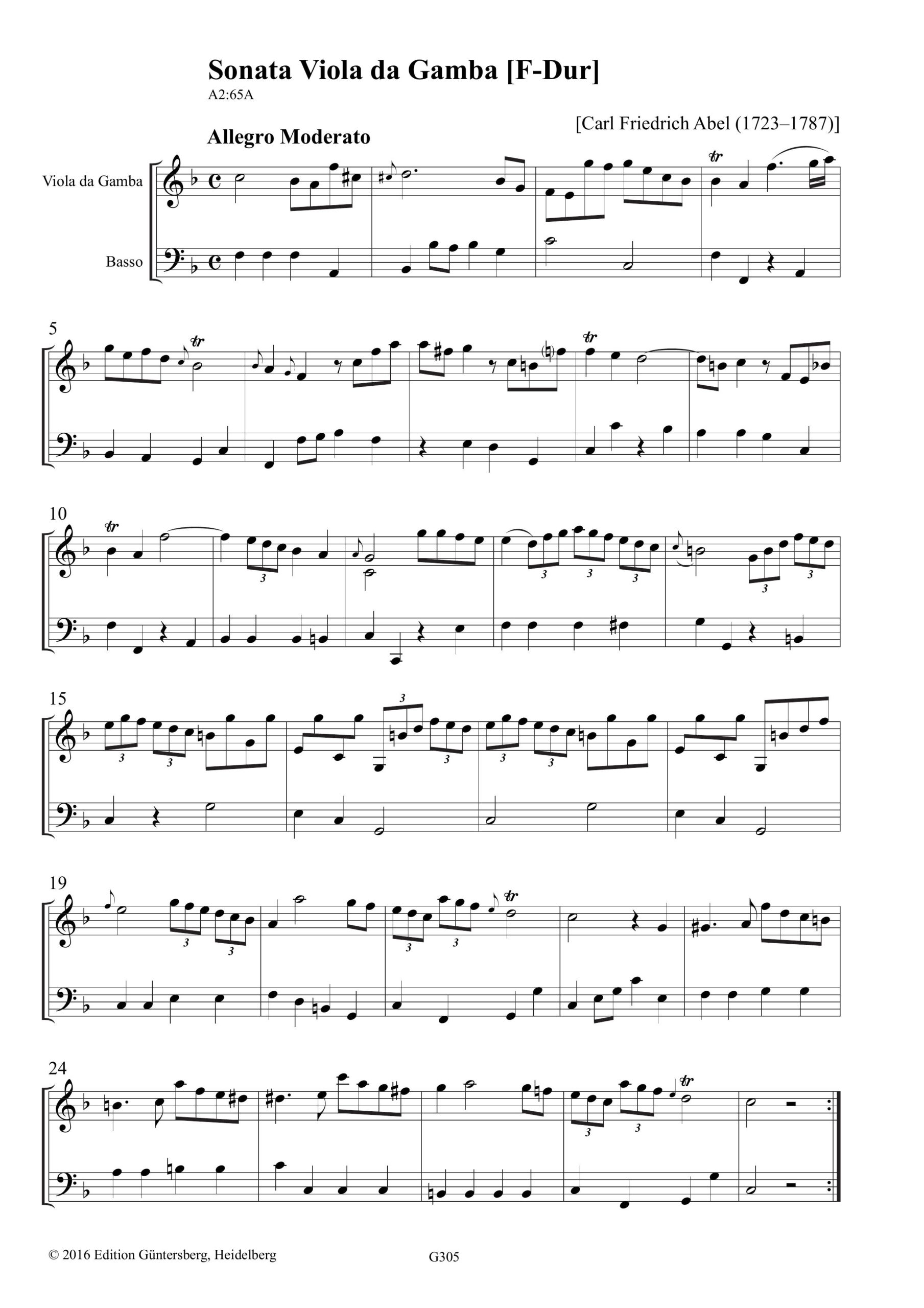 Abel, Maltzan-Sammlung, AbelWV B101–103 (A2:65A–67A), Band 5, Drei Sonaten (F-Dur, B-Dur, D-Dur), Erstausgabe, VdG+Bc, Partitur und 3 Stimmen (Violin- und Altschlüssel), 76 S., ISMN 979-0-50174-305-6