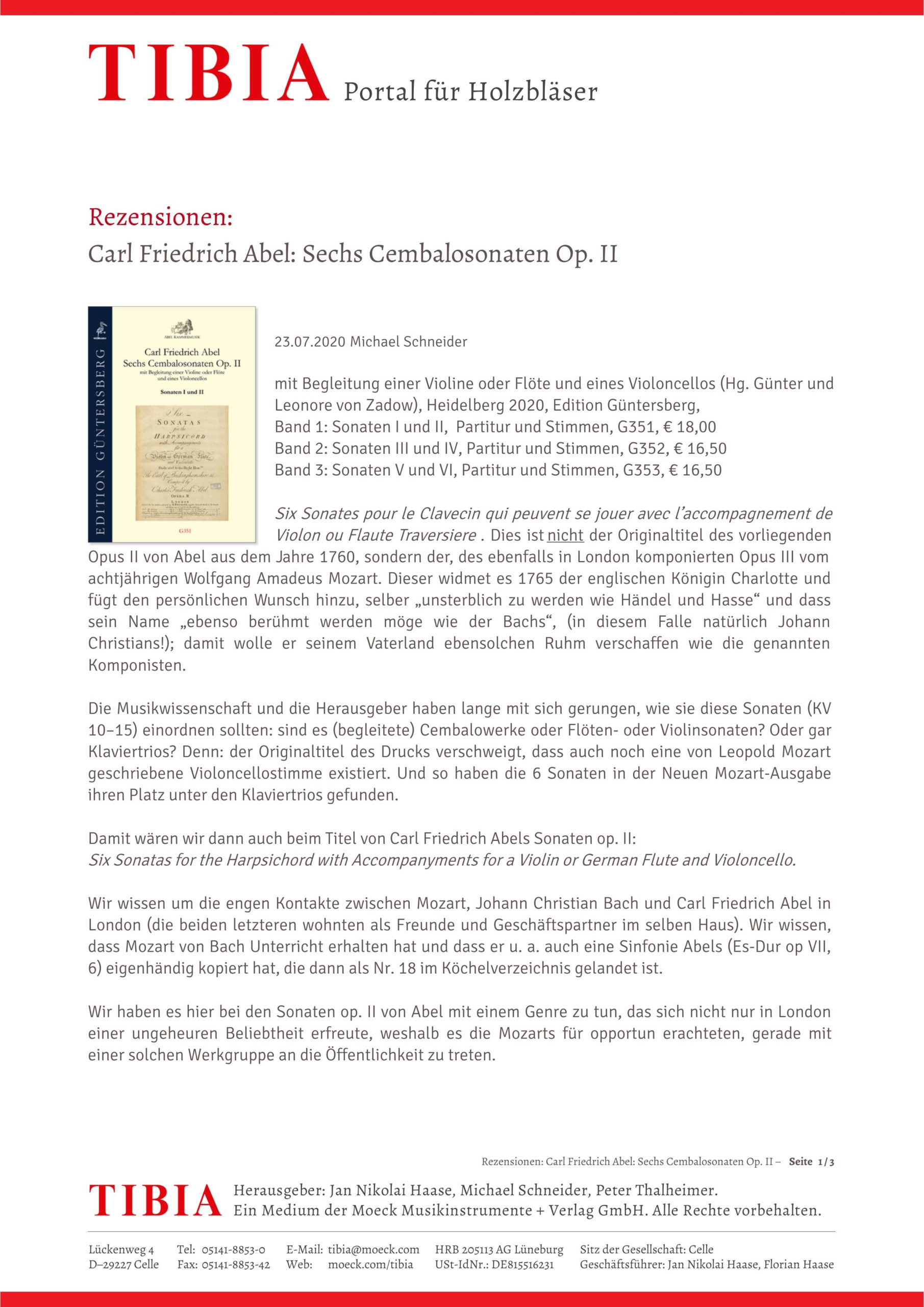 Carl Friedrich Abel (1723–1787) Sechs Cembalosonaten Op. II – mit Begleitung einer Violine/Traversflöte und eines Violoncellos