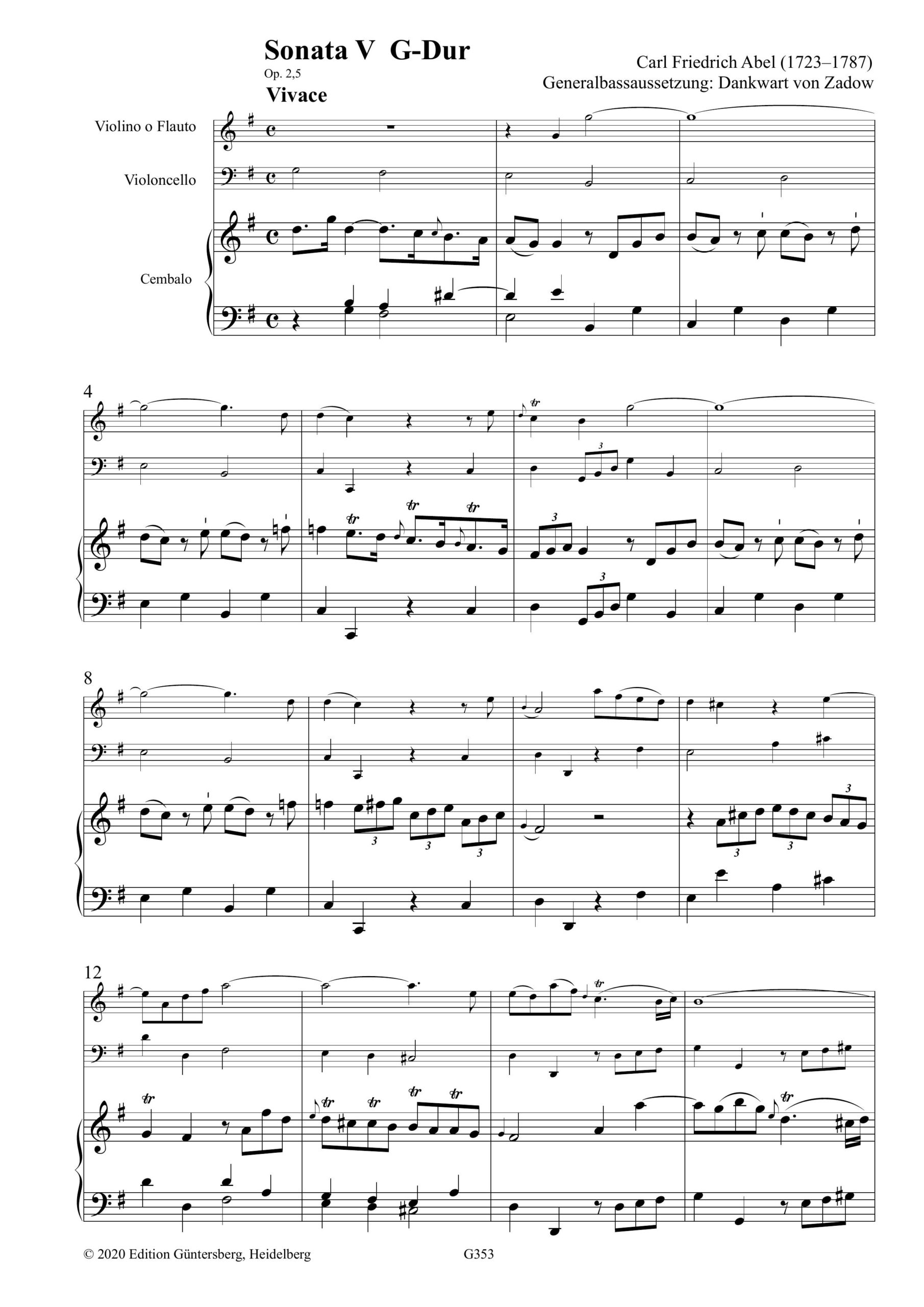 Abel, Sechs Cembalosonaten Op. II, mit Begleitung einer Violine/Traversflöte und eines Violoncellos, AbelWV C5–6, Sonaten 5–6, Cemb+V/Fl+Vc, Partitur und 3 Stimmen, 40 S., ISMN 979-0-50174-353-7