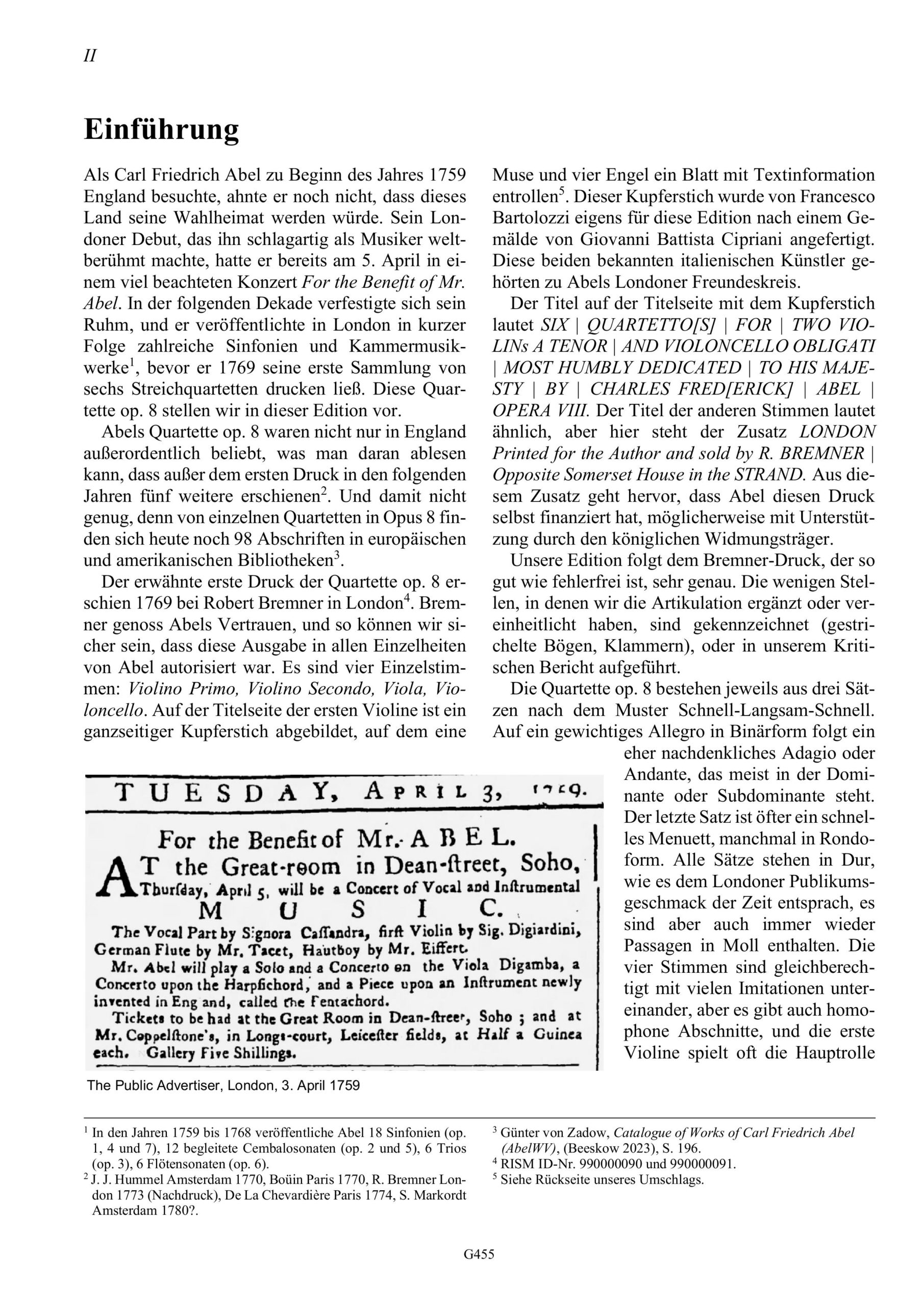 Carl Friedrich Abels Quartette op. 8 wurden im Jahr 1769 in London gedruckt. Abel war zu der Zeit einer der führenden Musiker in England und hatte dort bereits achtzehn viel beachtete Sinfonien und zahlreiche Trios und Sonaten veröffentlicht, aber noch keine Quartette. Diese sechs Quartette, die für die klassische Streichquartett-Besetzung gedacht sind, sind Abels erste Werke dieses Genres. Sie bestehen jeweils aus drei Sätzen nach dem Muster Schnell-Langsam-Schnell, wobei die langsamen Mittelsätze besonders eindrucksvoll sind. Die vier Stimmen sind gleichberechtigt mit zahlreichen Imitationen untereinander, aber es gibt auch homophone Abschnitte, und die erste Violine spielt oft die Hauptrolle als Träger von eingängigen Melodien. Von diesen Quartetten gab es im 18. Jahrhundert in den Ländern Europas eine Vielzahl von Nachdrucken und Abschriften, was deutlich zeigt wie gerne diese Stücke musiziert wurden. Wir freuen uns, dass wir diese Quartette dank einer Unterstützung durch den Kulturfonds der VG Musikedition heutigen Musikern wieder zugänglich machen können.