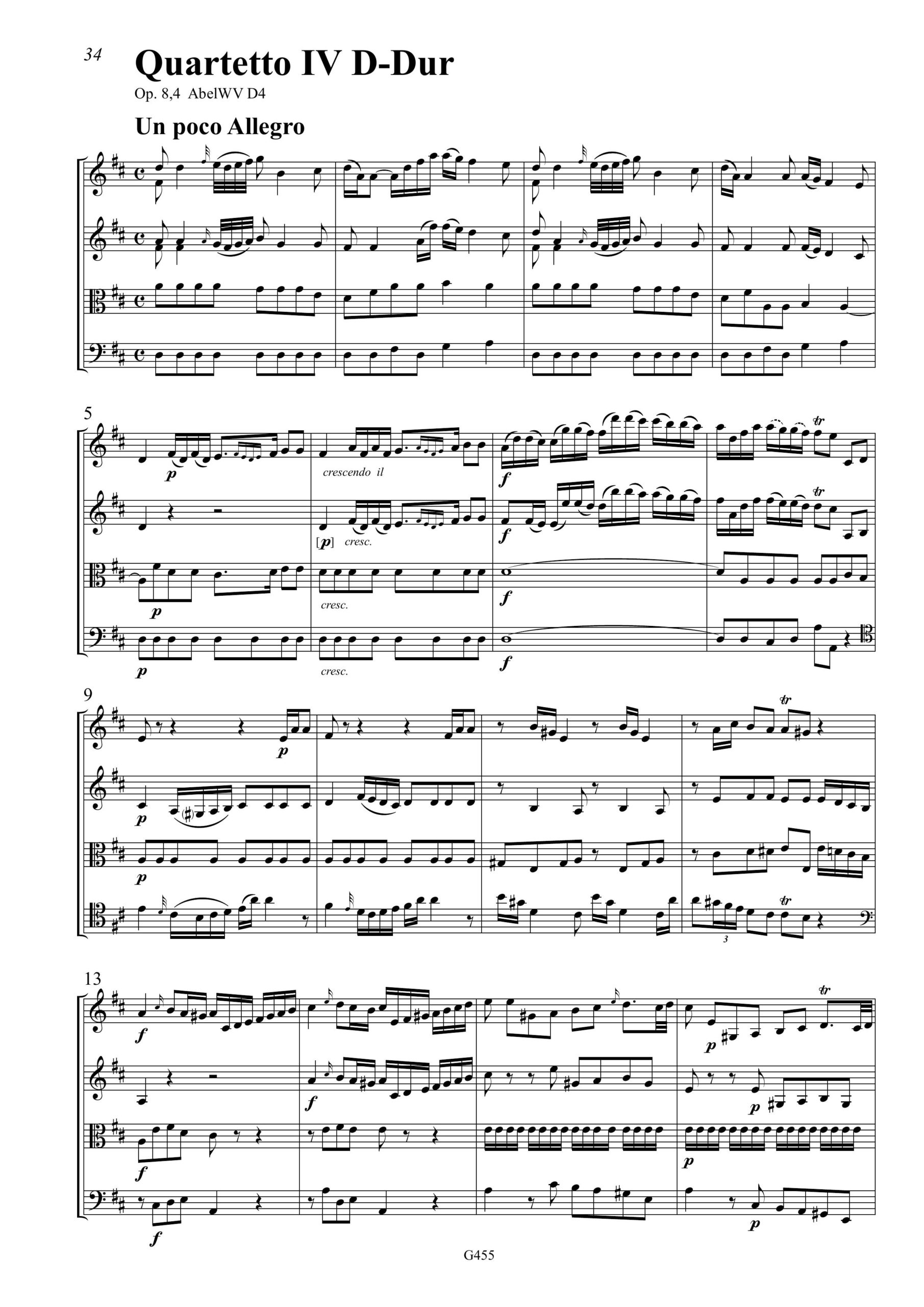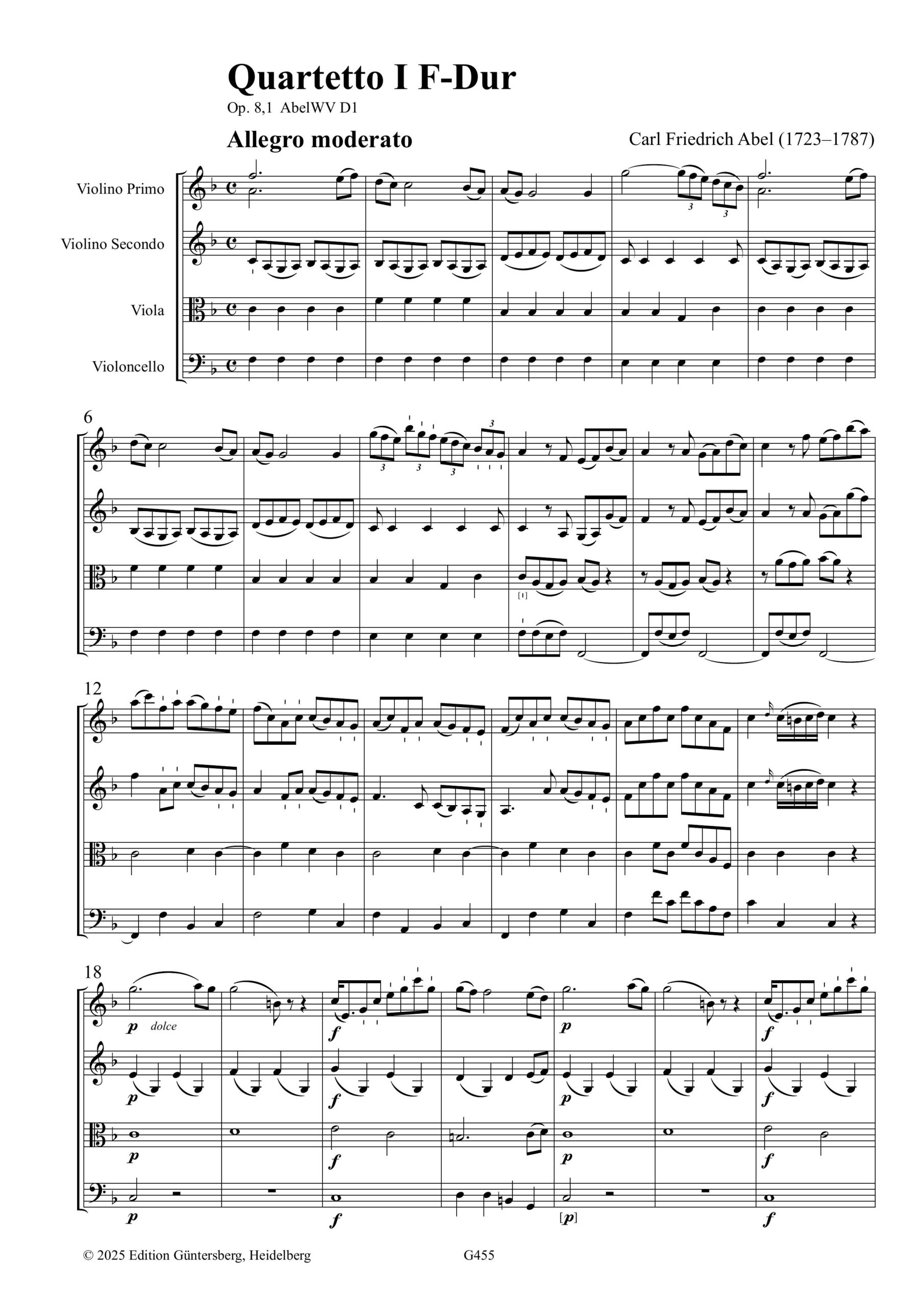 Carl Friedrich Abels Quartette op. 8 wurden im Jahr 1769 in London gedruckt. Abel war zu der Zeit einer der führenden Musiker in England und hatte dort bereits achtzehn viel beachtete Sinfonien und zahlreiche Trios und Sonaten veröffentlicht, aber noch keine Quartette. Diese sechs Quartette, die für die klassische Streichquartett-Besetzung gedacht sind, sind Abels erste Werke dieses Genres. Sie bestehen jeweils aus drei Sätzen nach dem Muster Schnell-Langsam-Schnell, wobei die langsamen Mittelsätze besonders eindrucksvoll sind. Die vier Stimmen sind gleichberechtigt mit zahlreichen Imitationen untereinander, aber es gibt auch homophone Abschnitte, und die erste Violine spielt oft die Hauptrolle als Träger von eingängigen Melodien. Von diesen Quartetten gab es im 18. Jahrhundert in den Ländern Europas eine Vielzahl von Nachdrucken und Abschriften, was deutlich zeigt wie gerne diese Stücke musiziert wurden. Wir freuen uns, dass wir diese Quartette dank einer Unterstützung durch den Kulturfonds der VG Musikedition heutigen Musikern wieder zugänglich machen können.