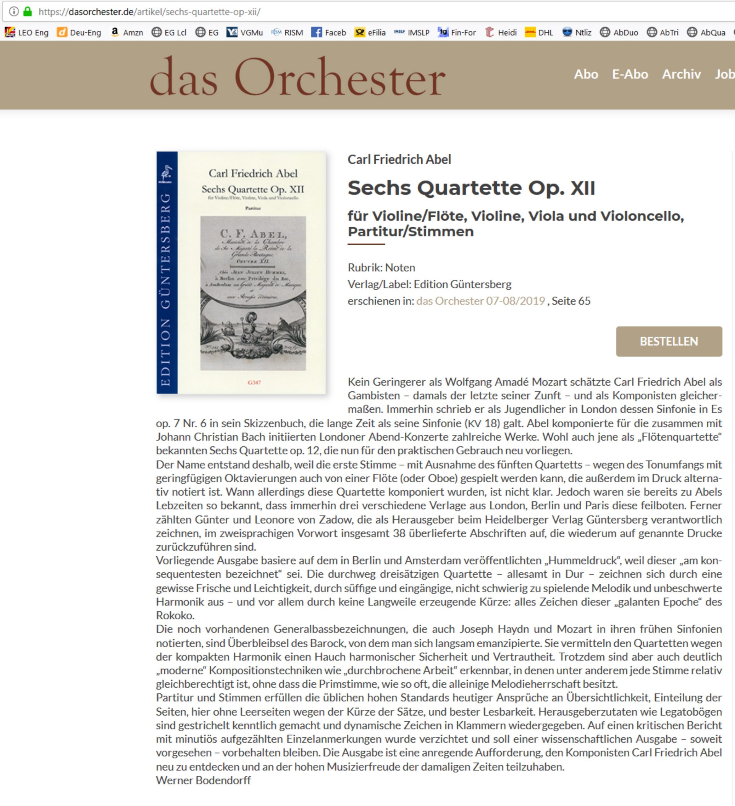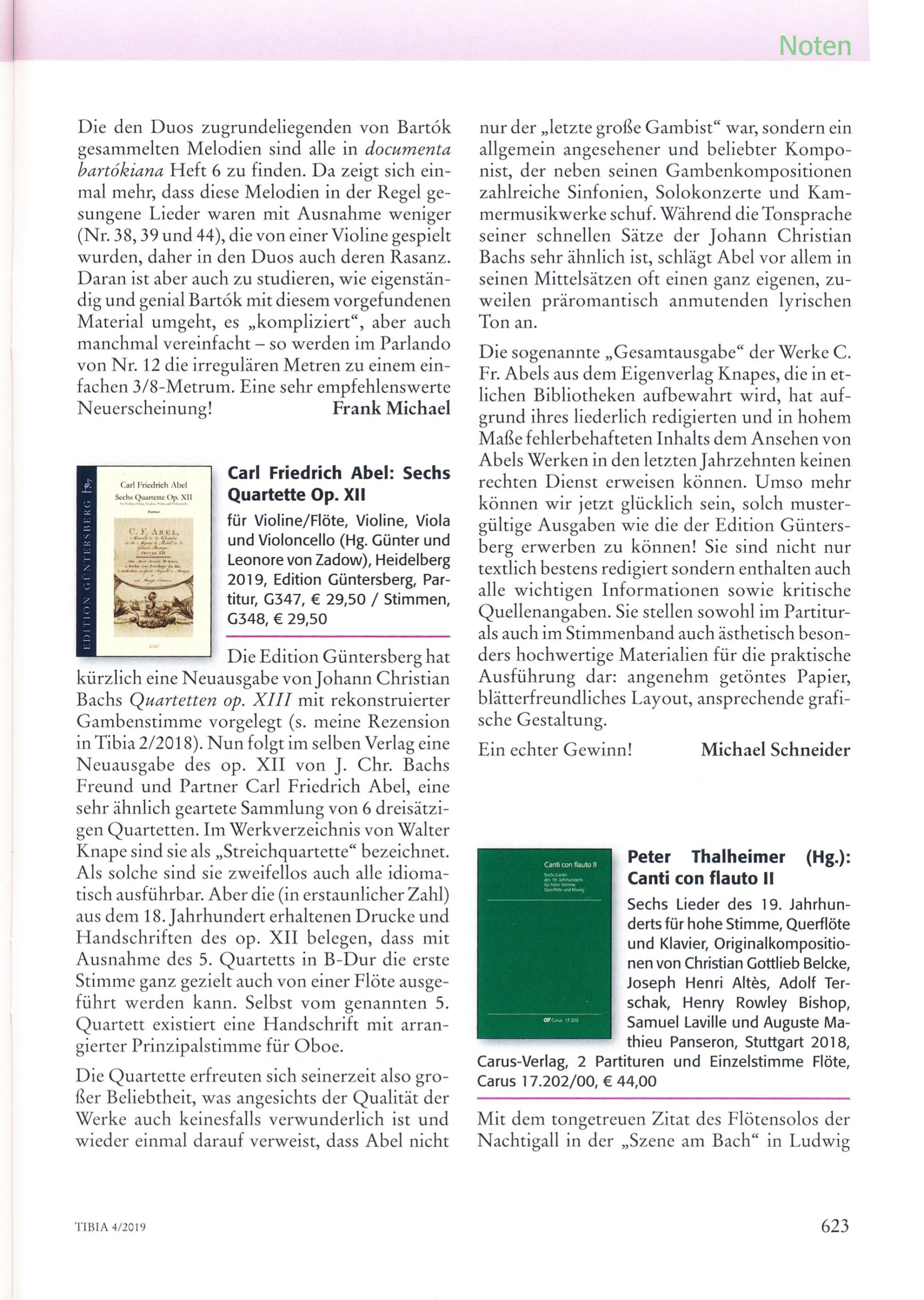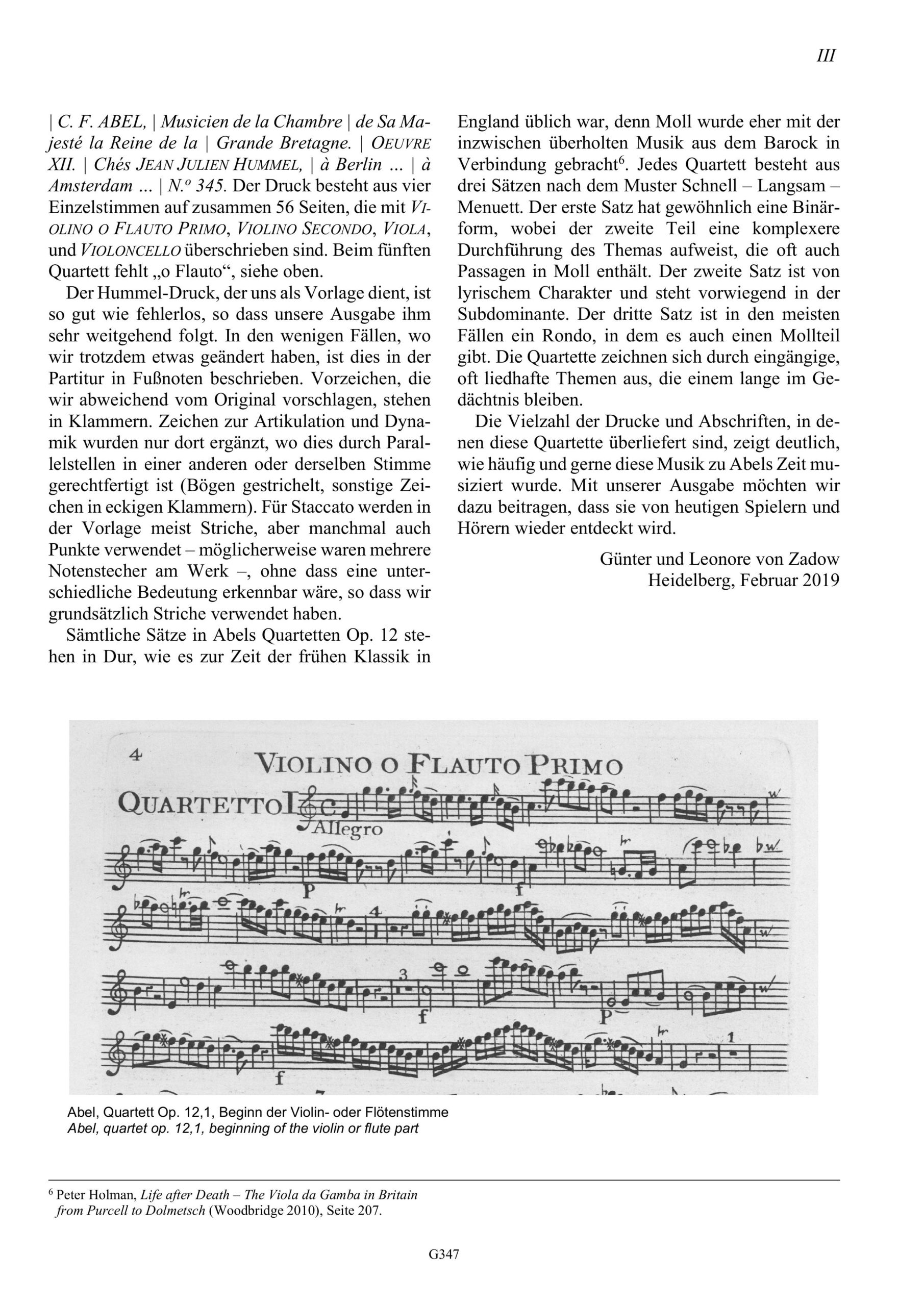 Abel, Sechs Quartette Op. XII, für Violine/Flöte, Violine, Viola und Violoncello, AbelWV D7–12, Partitur, V/Fl+V+Va+Vc, Einführung und Partitur, 76 S., ISMN 979-0-50174-347-6