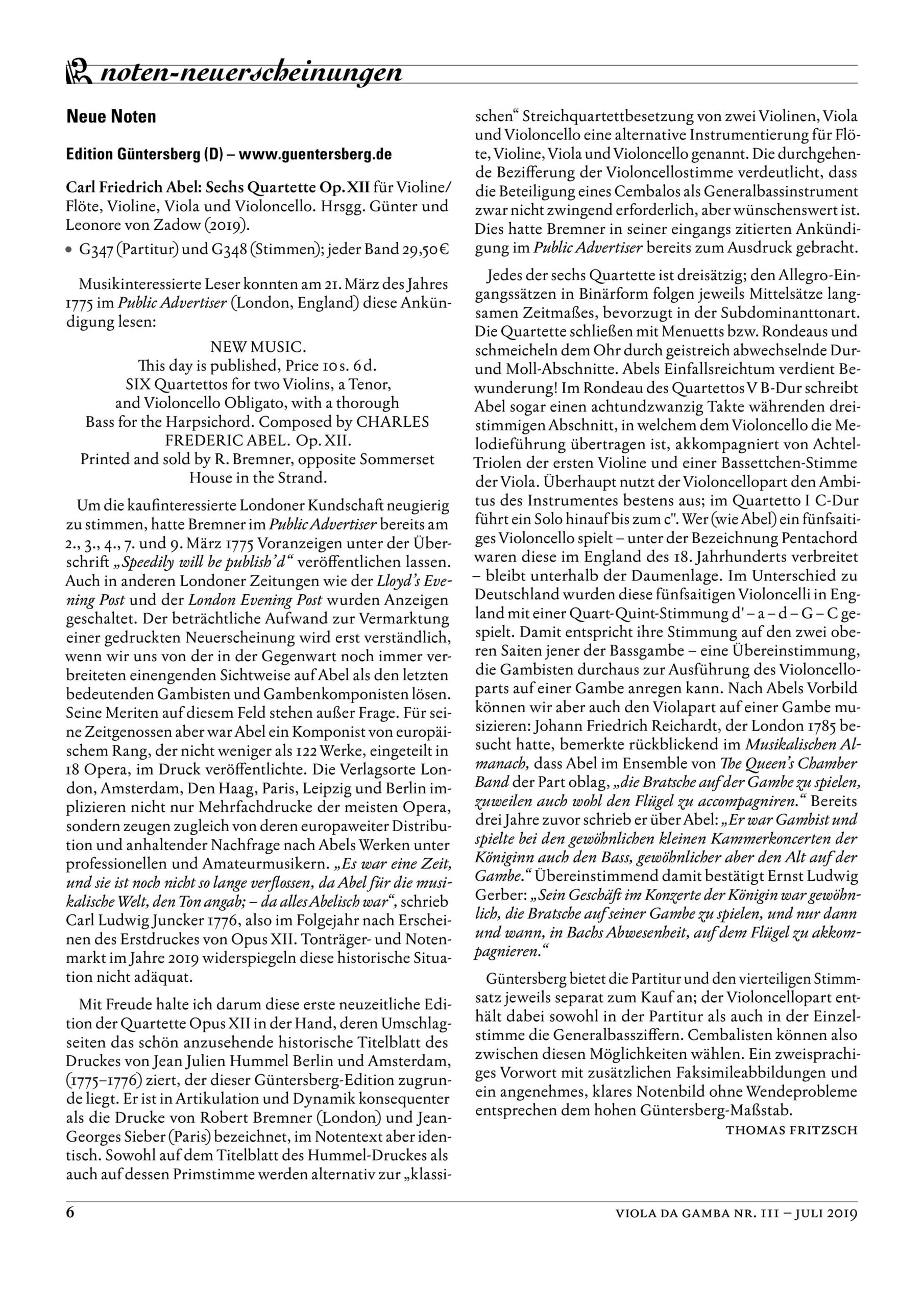Carl Friedrich Abels Quartette Op. 12 wurden zuerst 1774 in London veröffentlicht. Sie sind für Streichquartett geschrieben, die erste Stimme ist – mit Ausnahme des fünften Quartetts – jedoch auch für Flöte gedacht, so dass die Op. 12-Quartette gern auch pauschal als Flötenquartette bezeichnet werden. Sämtliche Sätze stehen in Dur, wie es zur Zeit der frühen Klassik in England üblich war, denn Moll wurde eher mit der inzwischen überholten Barockmusik in Verbindung gebracht. In vielen Sätzen kommen aber auch Passagen in Moll vor. Die Quartette zeichnen sich durch eingängige, oft liedhafte Themen aus, die einem lange im Gedächtnis bleiben. Die Vielzahl von Drucken und Abschriften, in denen diese Quartette überliefert sind, zeigt deutlich, wie häufig und gerne diese Musik zu Abels Zeit musiziert wurde. Mit unserer Ausgabe möchten wir dazu beitragen, dass sie von heutigen Spielern und Hörern wieder entdeckt wird.