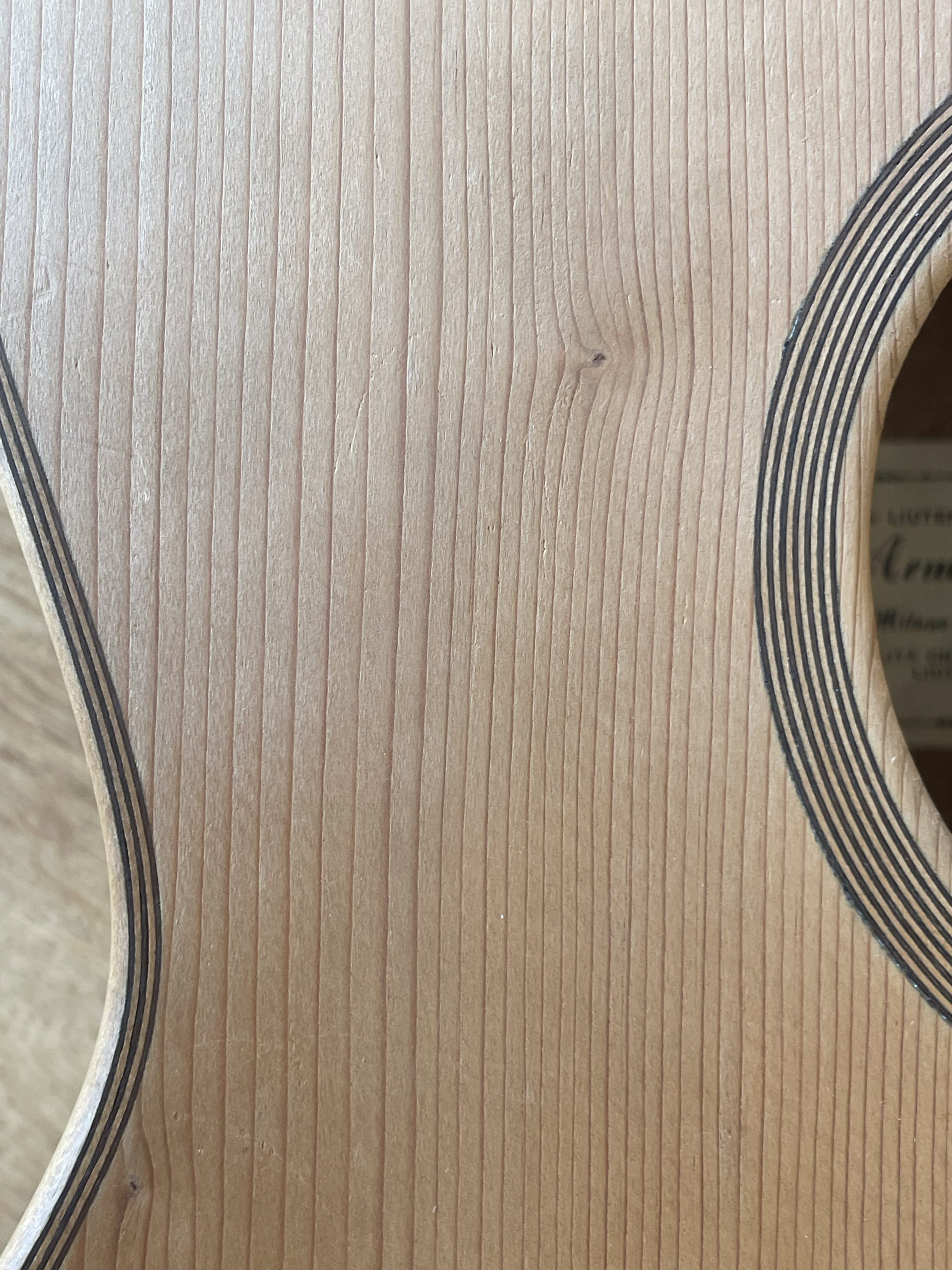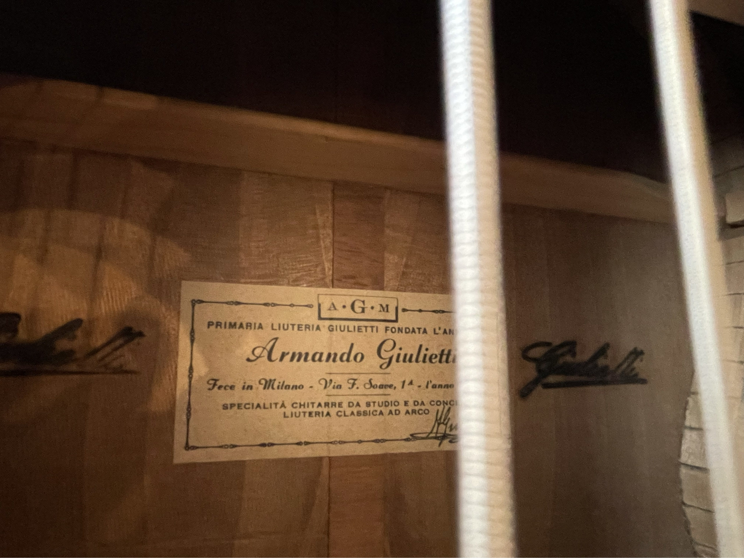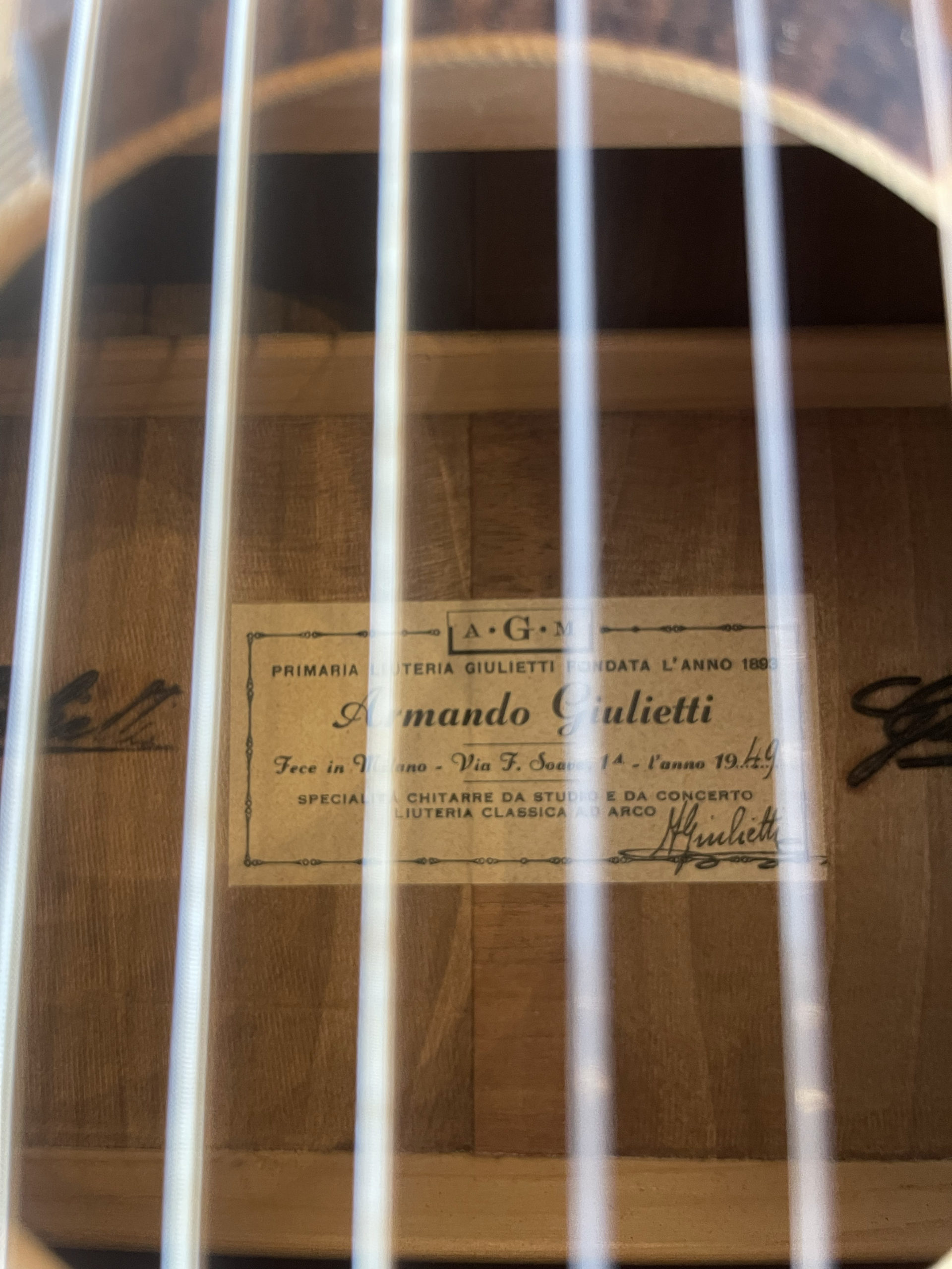 It has a warm, full tone, is well balanced, and very comfortable to play. The instrument is handmade and comes from the Milanese workshop of Armando Giulietti, who identifies himself on the label as a specialist in study and concert guitars as well as in classical string instruments.