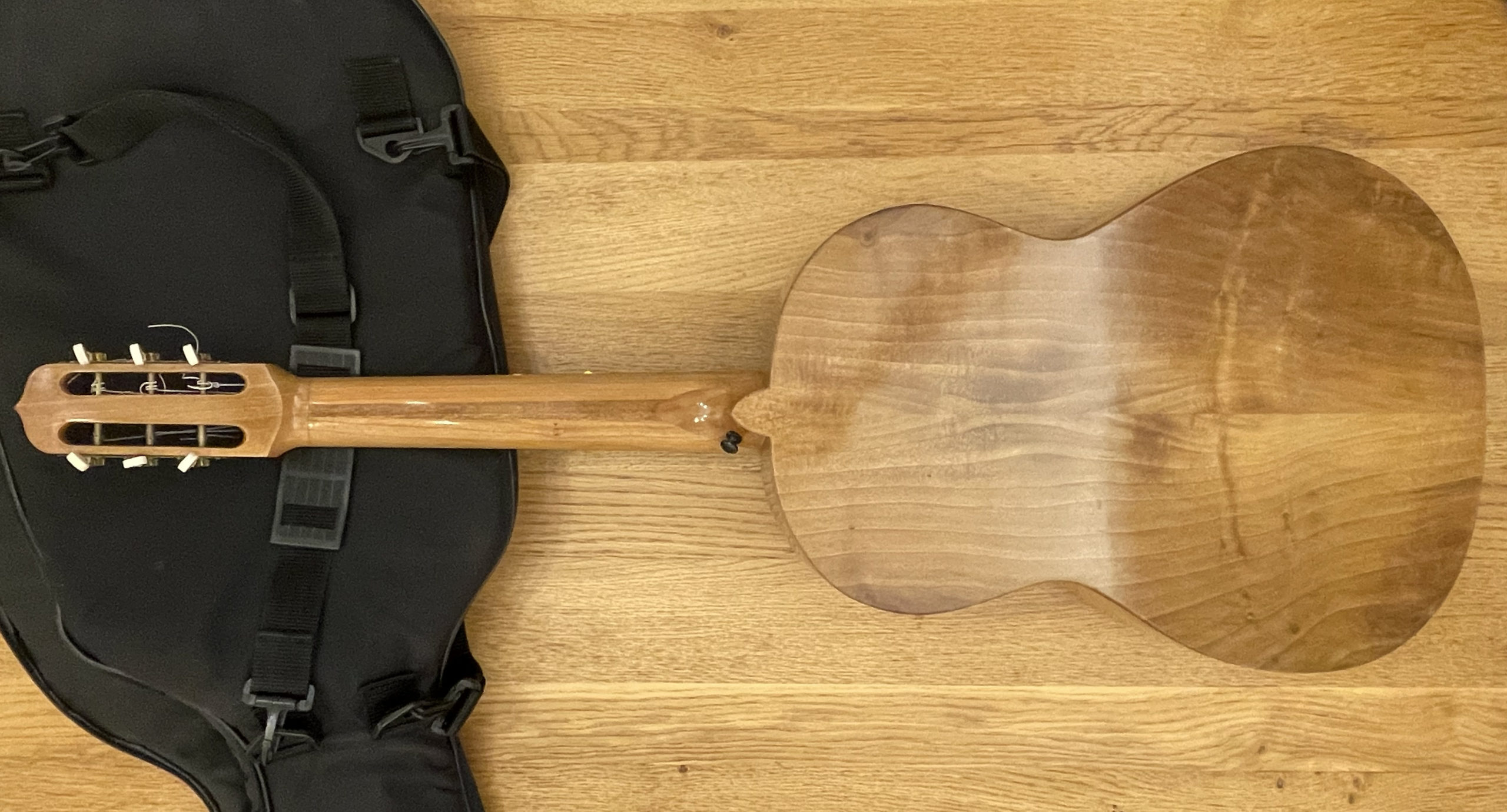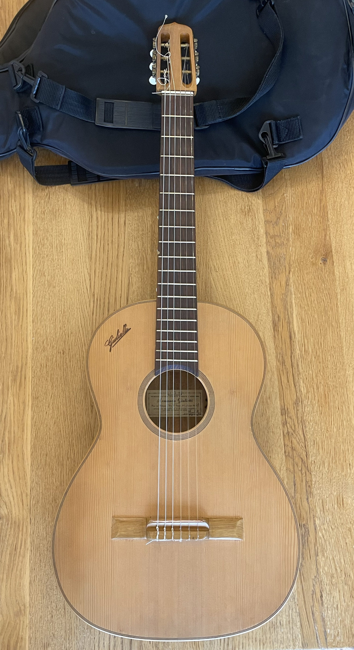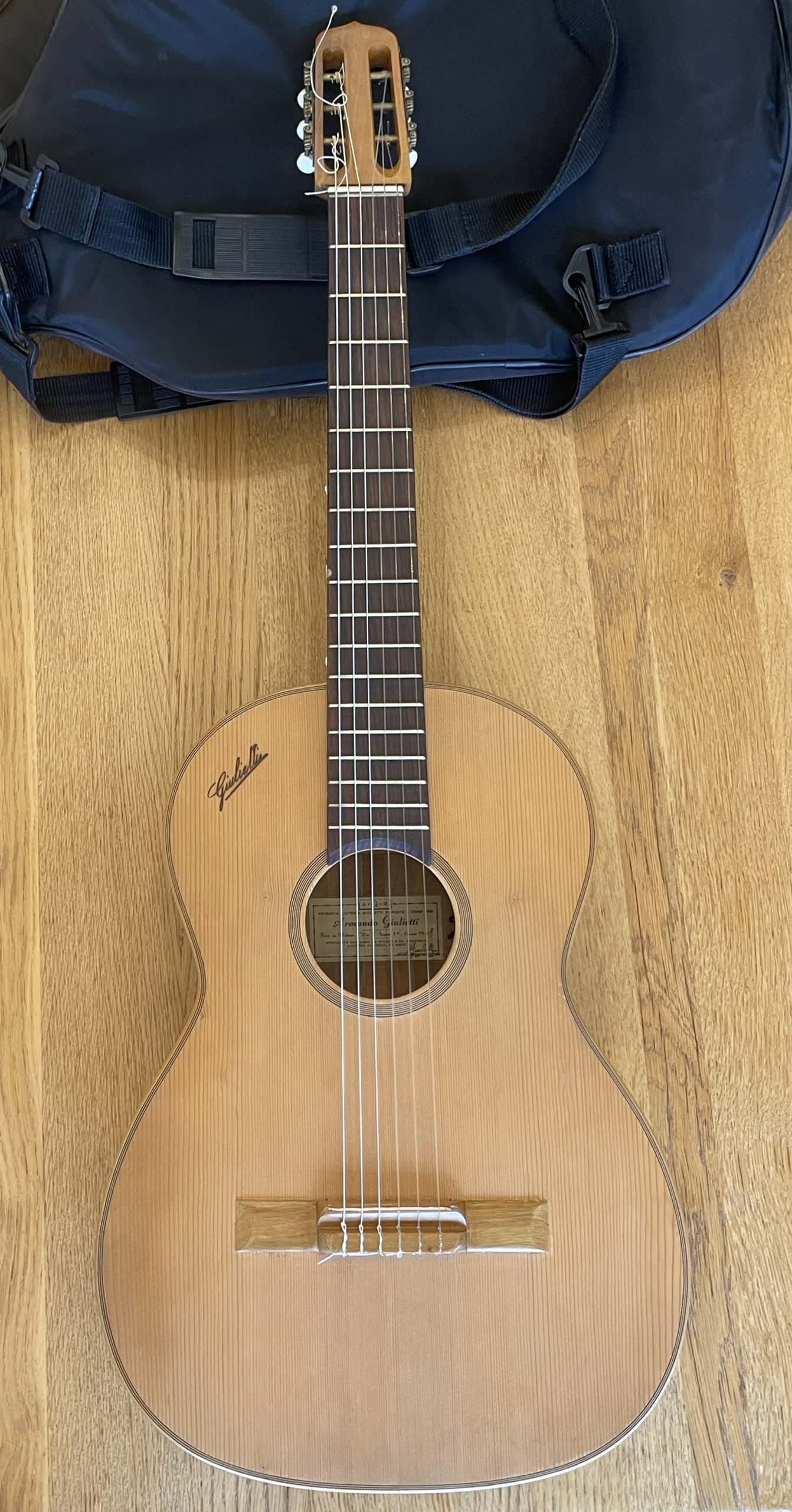 Sie hat eine warmen und vollen Ton, ist gut ausgeglichen, und sie ist sehr spielerfreundlich. Das Instrument ist handgemacht und stammt aus der Mailänder Werkstatt von Armando Giulietti, der sich auf dem Zettel ausweist als spezialisiert für Studien- und Konzertgitarren, sowie für klassische Streichinstrumente.