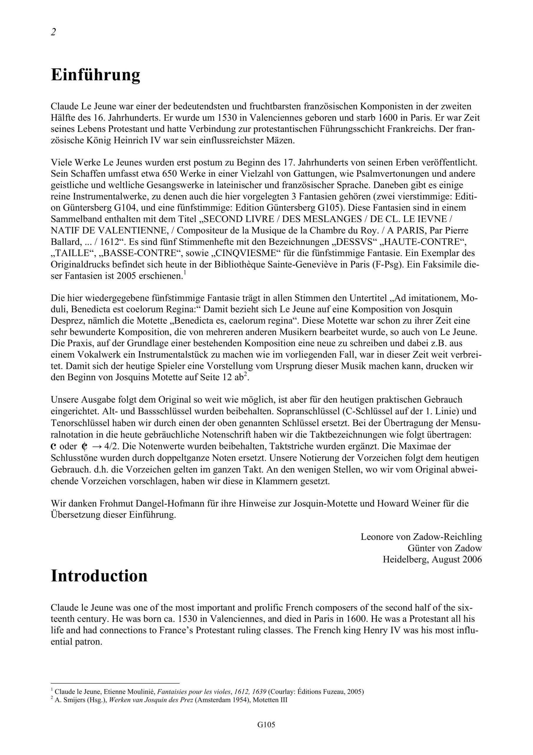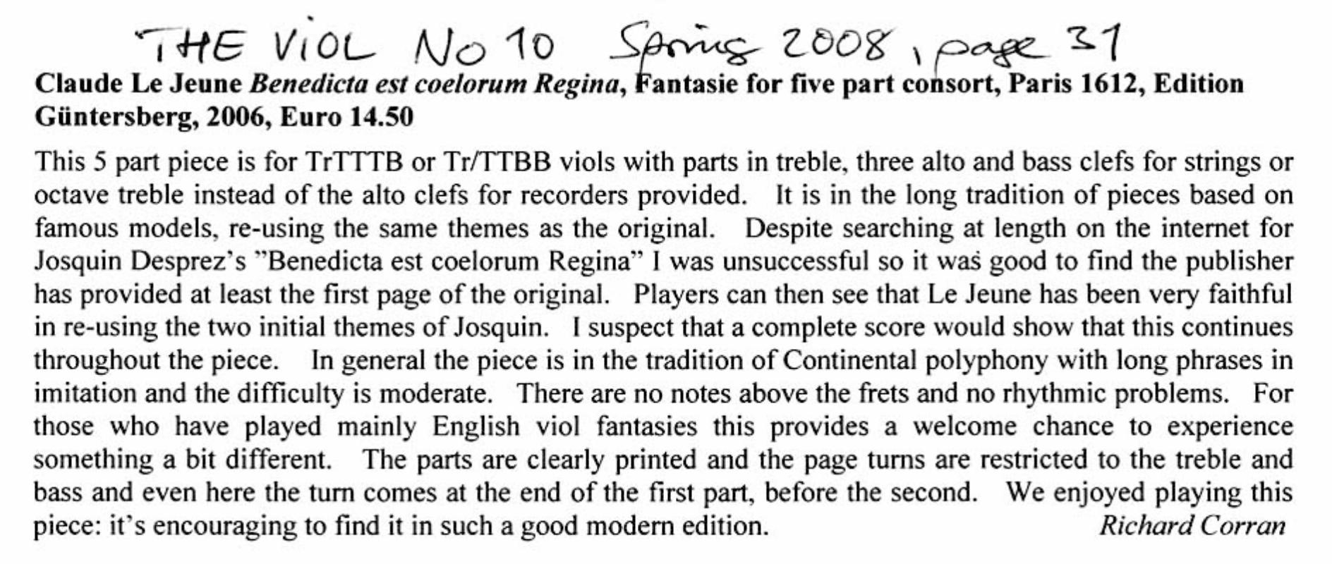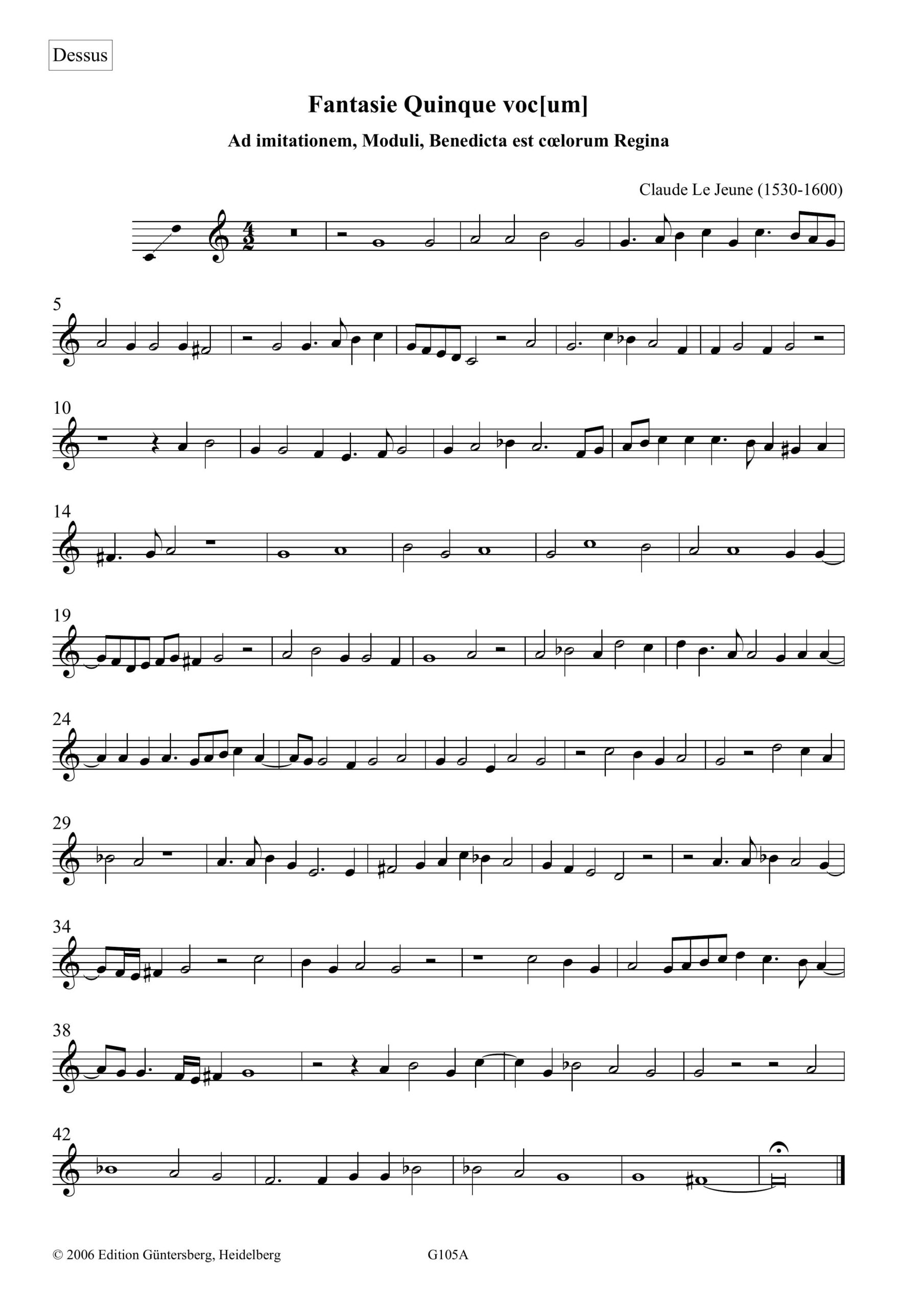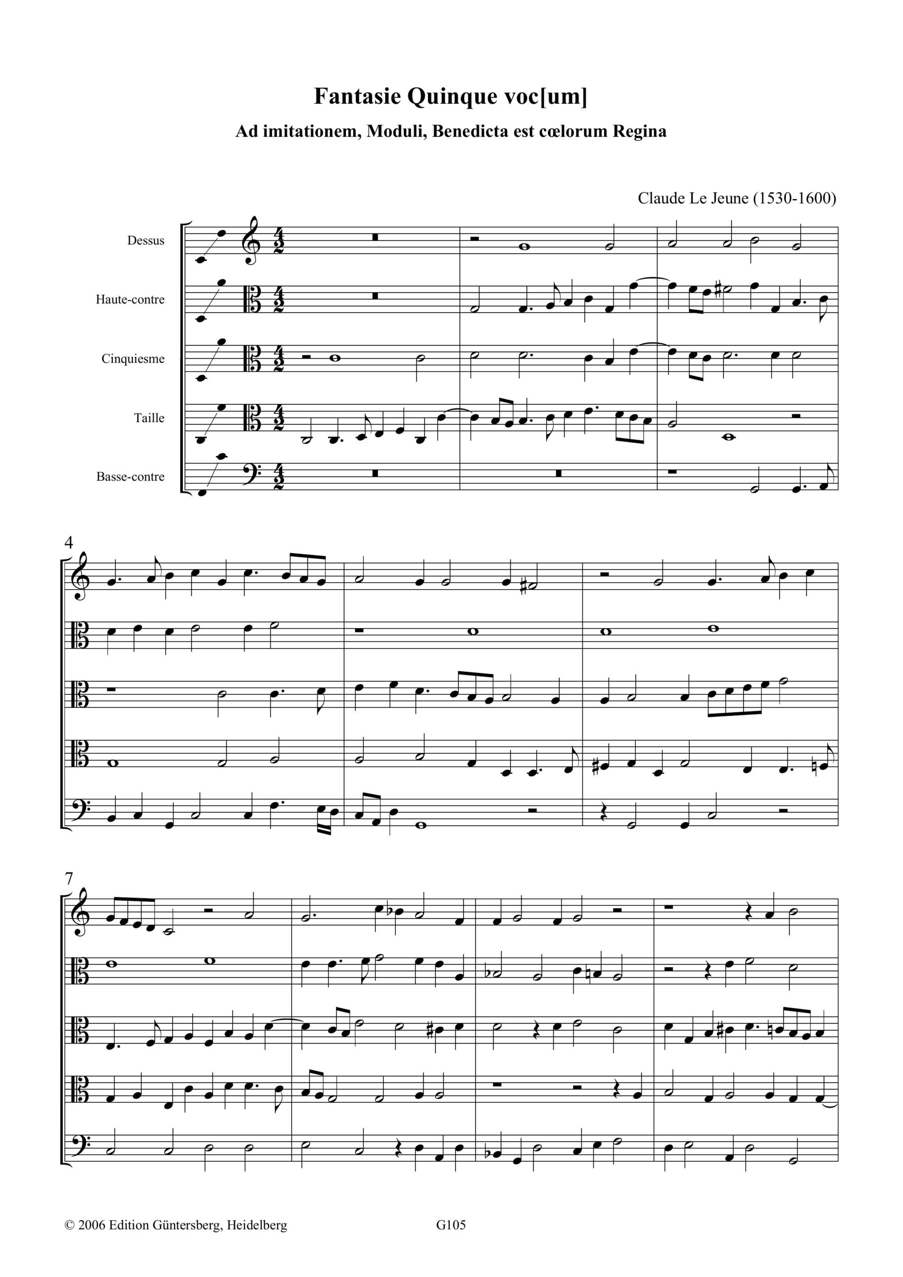 C. Le Jeune, Benedicta est coelorum Regina, Fantasie für fünfstimmiges Consort, 5Cons, Partitur und fünf Stimmen, 28 S., ISMN 979-0-50174-105-2