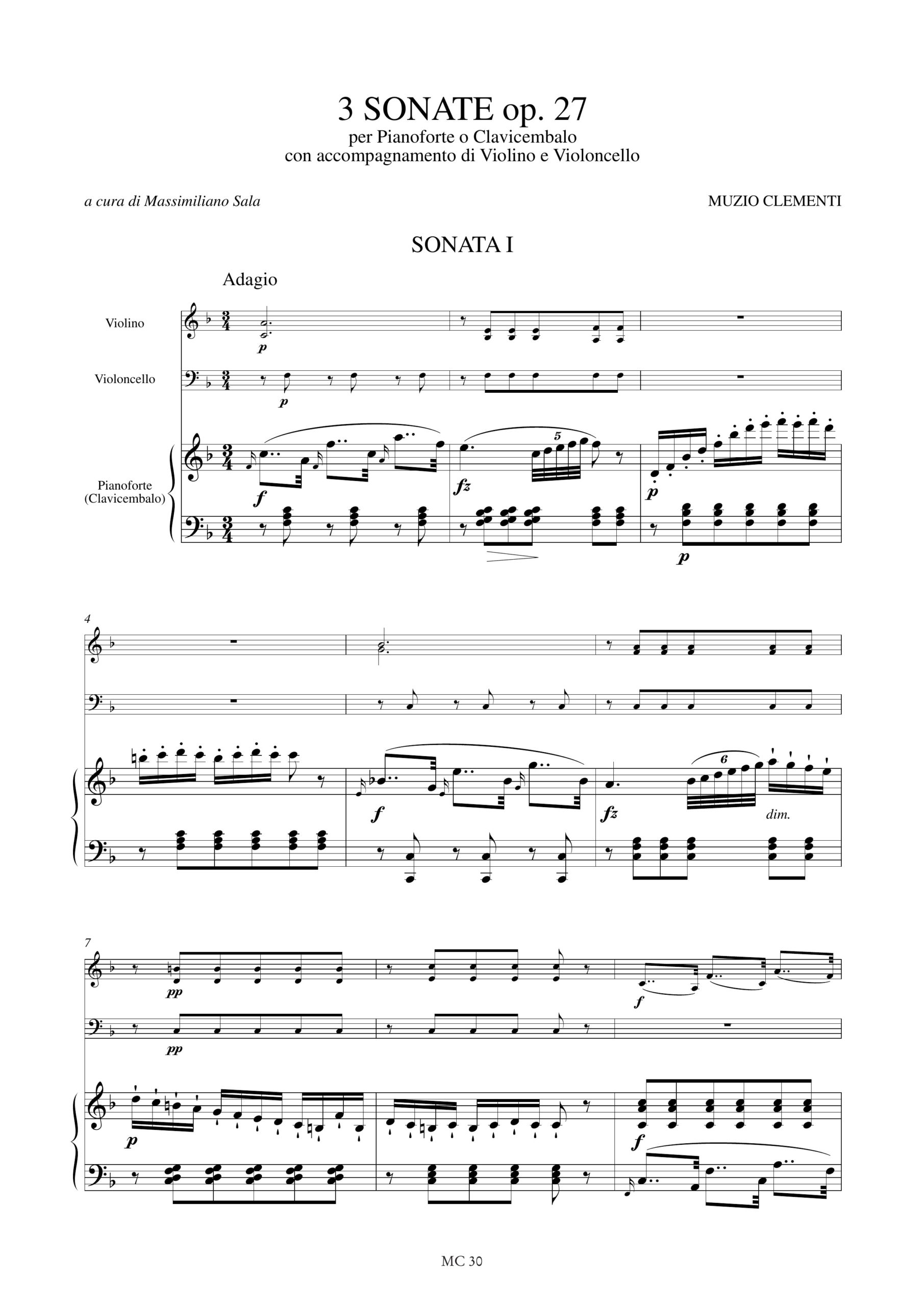 Clementi, Muzio: 3 Sonate Op. 27 per Pianoforte o Clavicembalo con accompagnamento di Violino e Violoncello