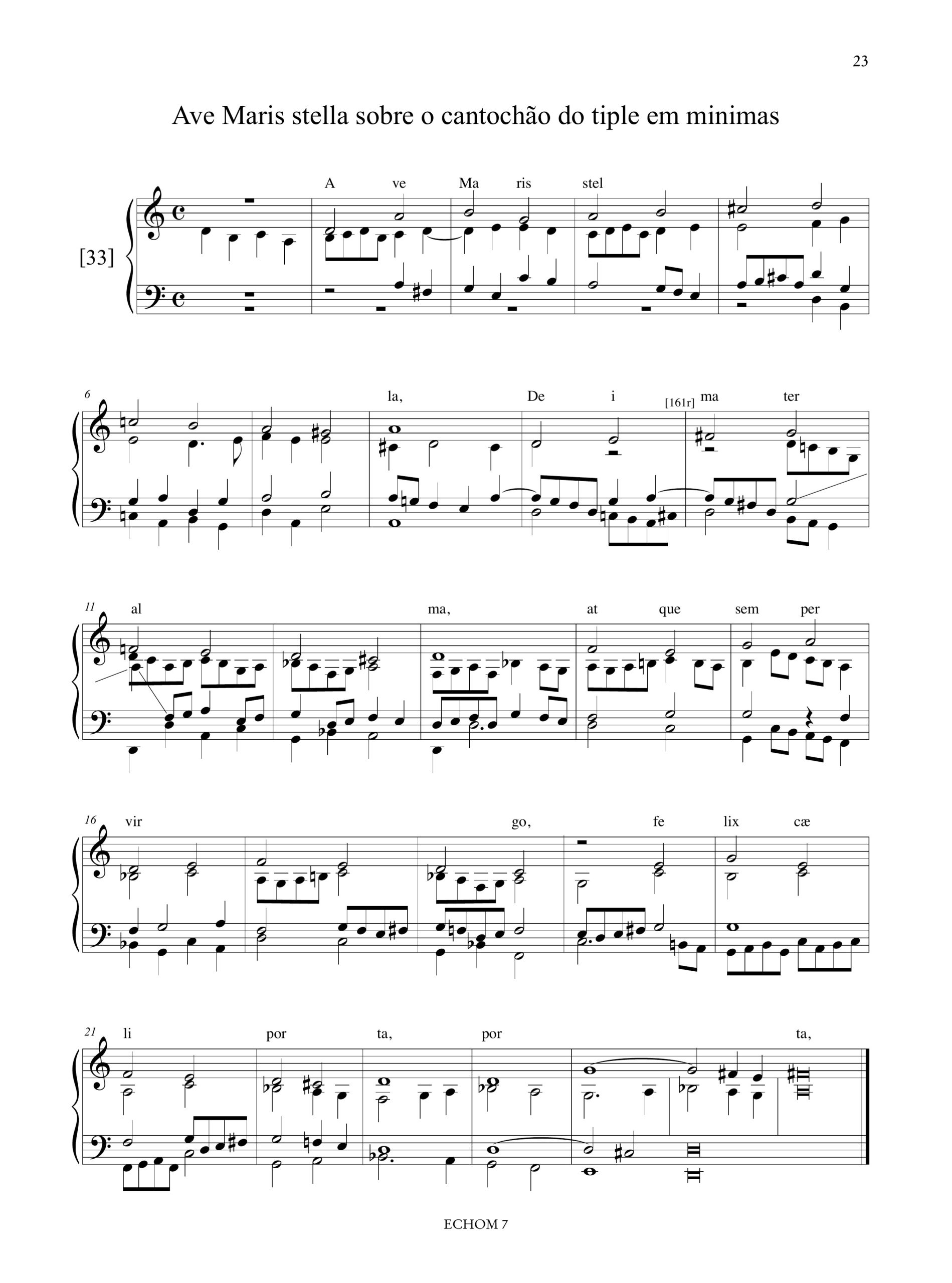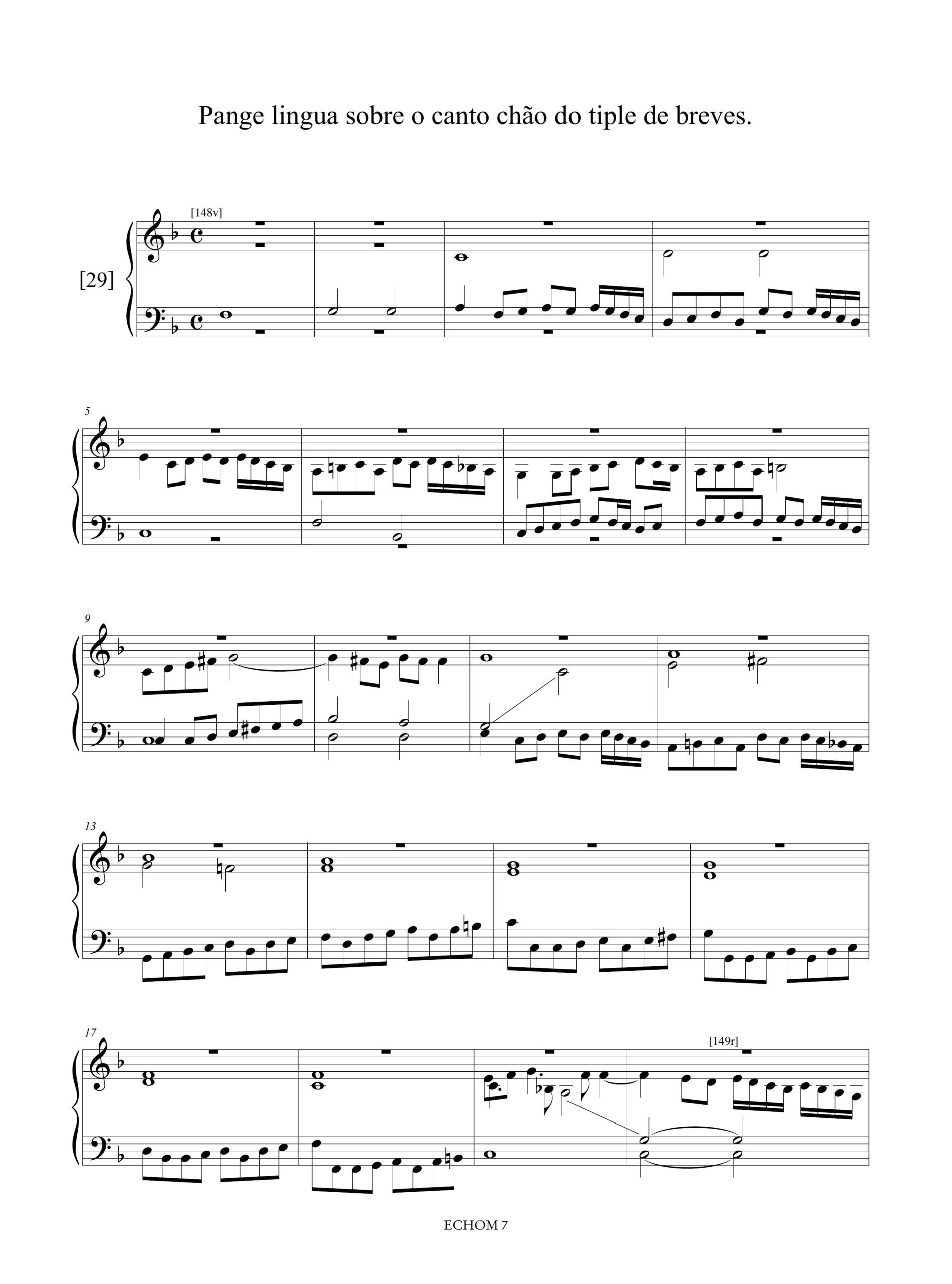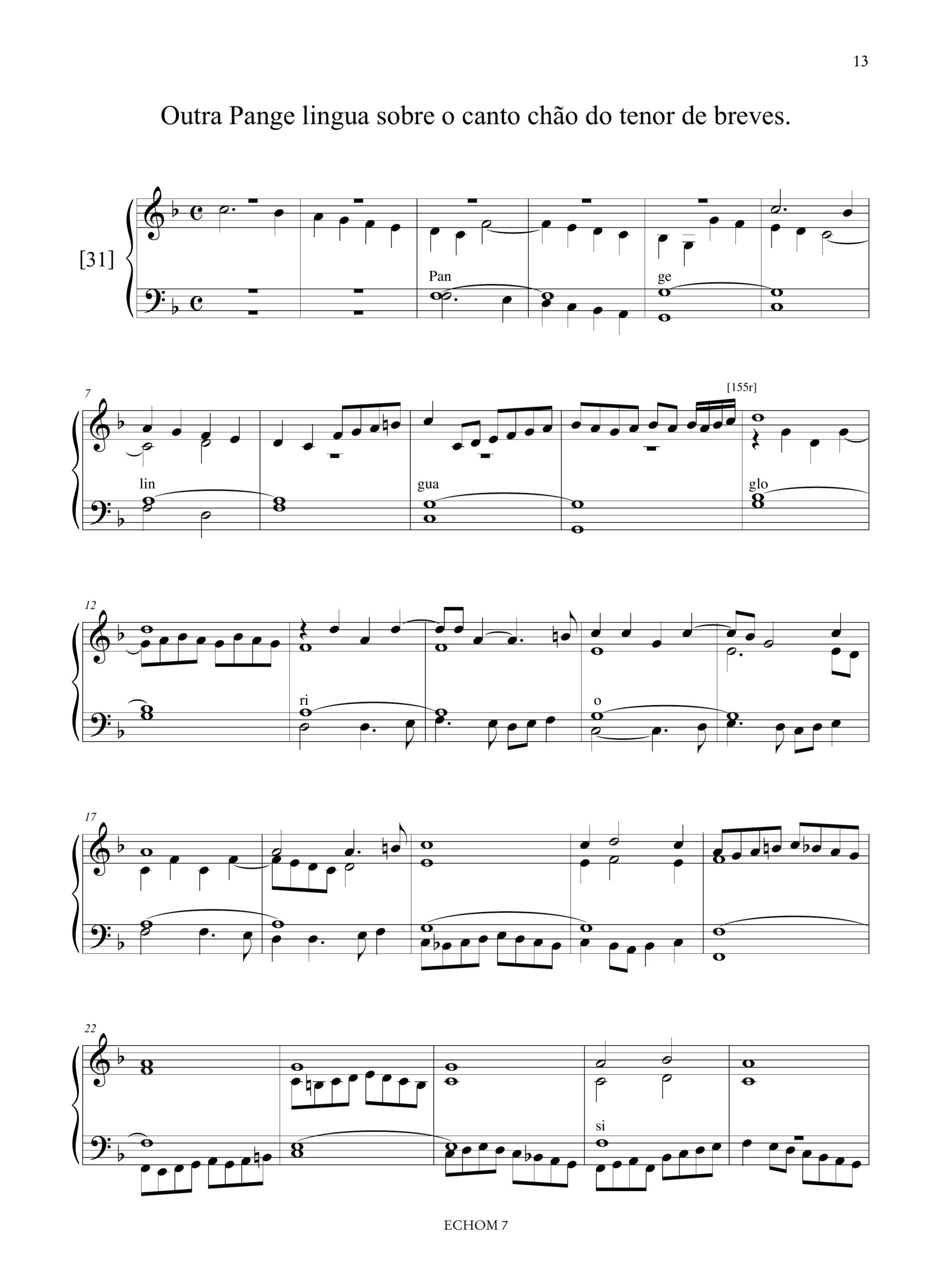 (Versi da cantare all’organo), che utilizzano cinque righi (quattro per l’organo e uno per la linea da cantare). Il testo musicale è preceduto da una sezione introduttiva di dodici pagine che comprende la dedica di Coelho al re, la licenza di stampa, il parere tecnico dell’eminente polifonista Frei Manuel Cardoso (1566-1650), cinque poesie (di autori diversi) in lode di Coelho e della sua musica, e un