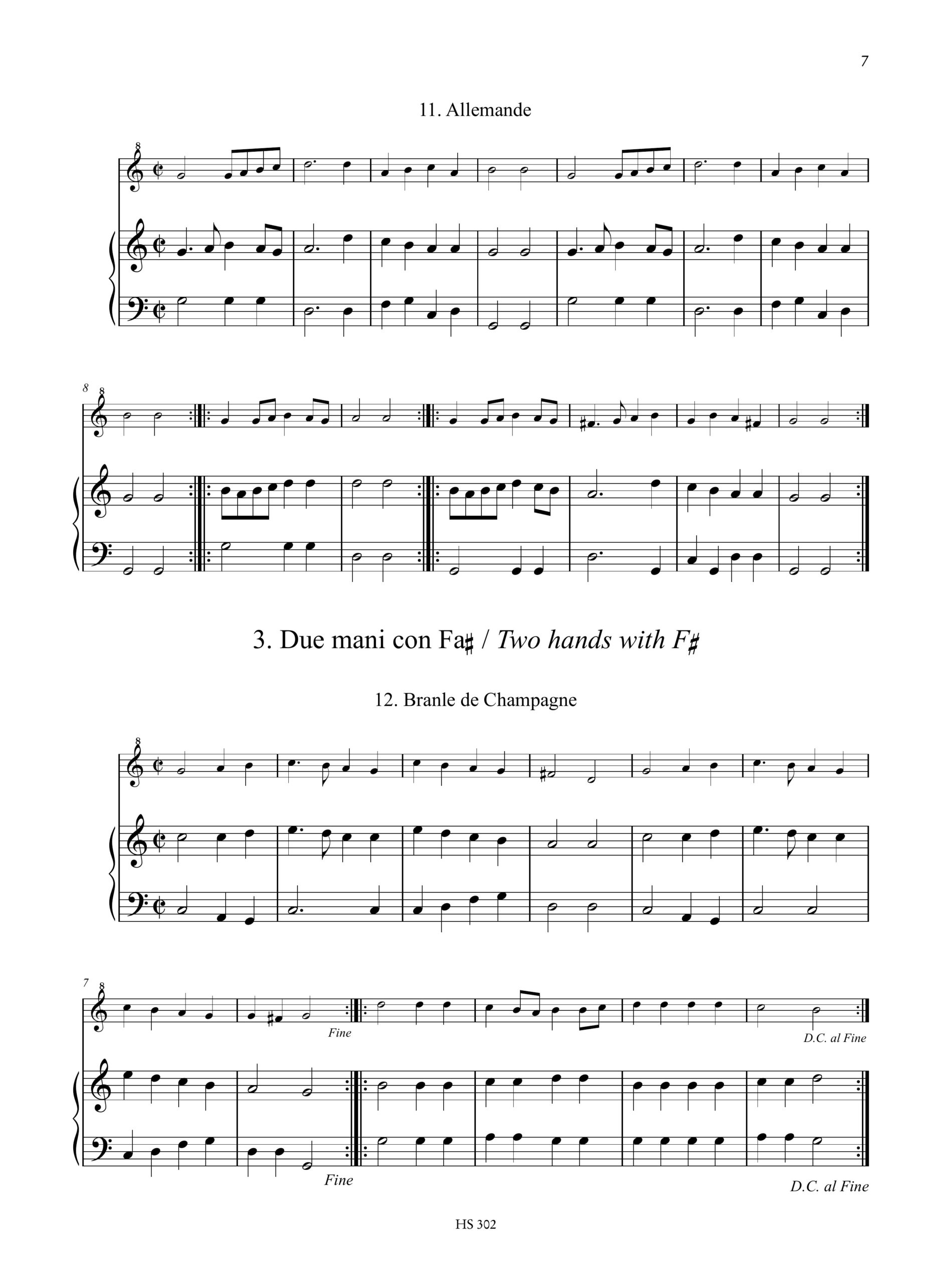 L’edizione è realizzata in modo tale che si possano eseguire i brani, tutti a quattro voci tranne alcuni a cinque, in diverse formazioni la più essenziale delle quali è in forma ridotta a tre voci di soprano, tenore e basso, queste ultime due affidate rispettivamente alla mano destra e sinistra del tastierista. Dal momento che i flauti dolci suonano all’ottava sopra, anche la parte di tenore è trasposta allo stesso modo per rendere omogeneo il suono delle tre voci superiori, mentre il basso conserva la tessitura originale. È inoltre possibile ampliare il gruppo per suonare le quattro voci al completo con l’aggiunta di un flauto contralto o tenore che esegue la parte di contralto, disponibile nella parte separata, e ulteriori due strumenti, flauti tenore e basso o altri, per eseguire le rispettive linee da soli o in raddoppio alla tastiera.