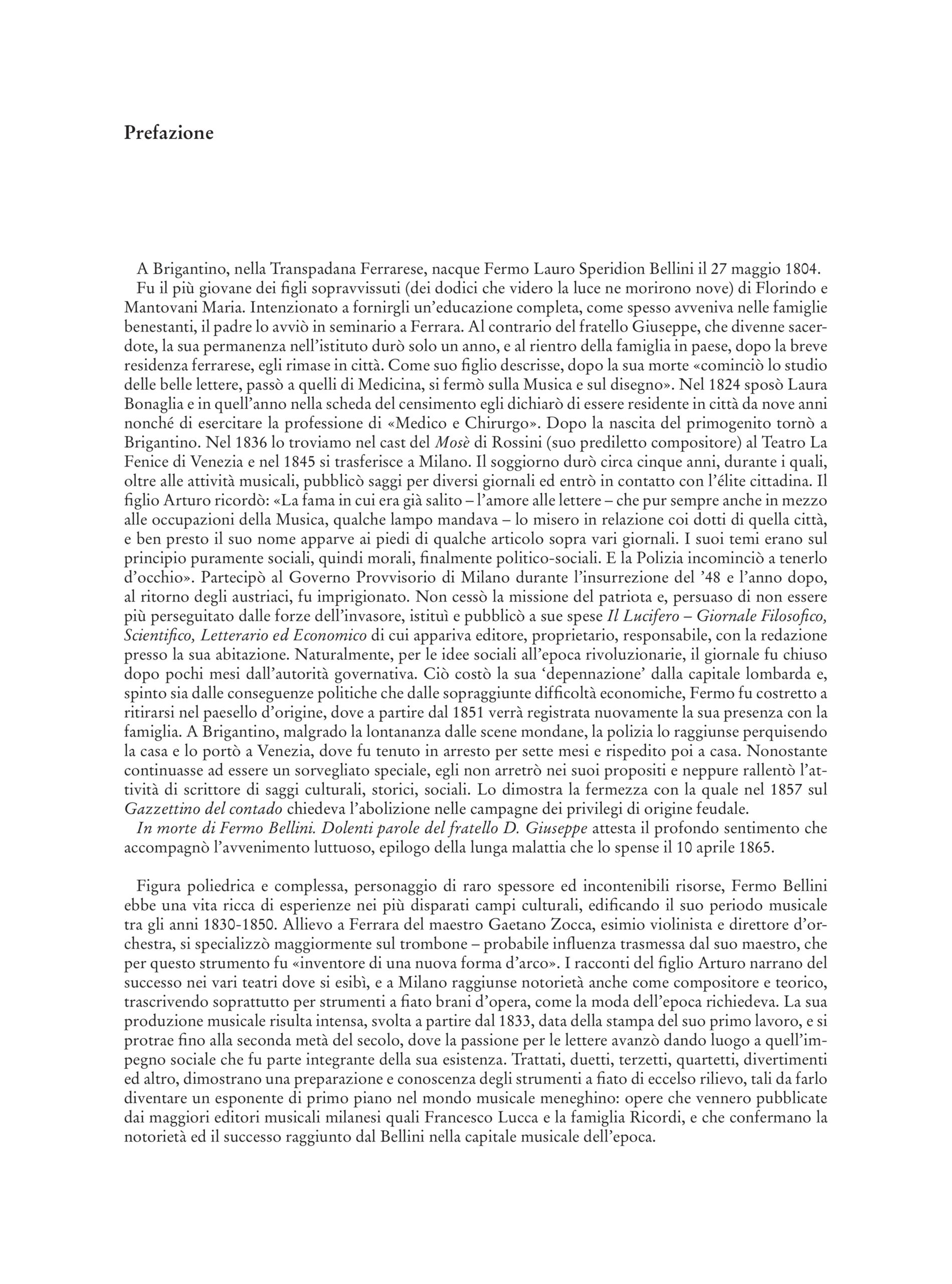Contenuto e Descrizione: Figura poliedrica e complessa, personaggio di raro spessore ed incontenibili risorse, Fermo Bellini ebbe una vita ricca di esperienze nei più disparati campi culturali, edificando il suo periodo musicale tra gli anni 1830-1850. Allievo a Ferrara del maestro Gaetano Zocca, esimio violinista e direttore d’orchestra, si specializzò maggiormente sul trombone – probabile influenza trasmessa dal suo maestro, che per questo strumento fu «inventore di una nuova forma d’arco». I racconti del figlio Arturo narrano del successo nei vari teatri dove si esibì, e a Milano raggiunse notorietà anche come compositore e teorico, trascrivendo soprattutto per strumenti a fiato brani d’opera, come la moda dell’epoca richiedeva. La sua produzione musicale risulta intensa, svolta a partire dal 1833, data della stampa del suo primo lavoro, e si protrae fino alla seconda metà del secolo, dove la passione per le lettere avanzò dando luogo a quell’impegno sociale che fu parte integrante della sua esistenza. Trattati, duetti, terzetti, quartetti, divertimenti ed altro, dimostrano una preparazione e conoscenza degli strumenti a fiato di eccelso rilievo, tali da farlo diventare un esponente di primo piano nel mondo musicale meneghino: opere che vennero pubblicate dai maggiori editori musicali milanesi quali Francesco Lucca e la famiglia Ricordi, e che confermano la notorietà ed il successo raggiunto dal Bellini nella capitale musicale dell’epoca.