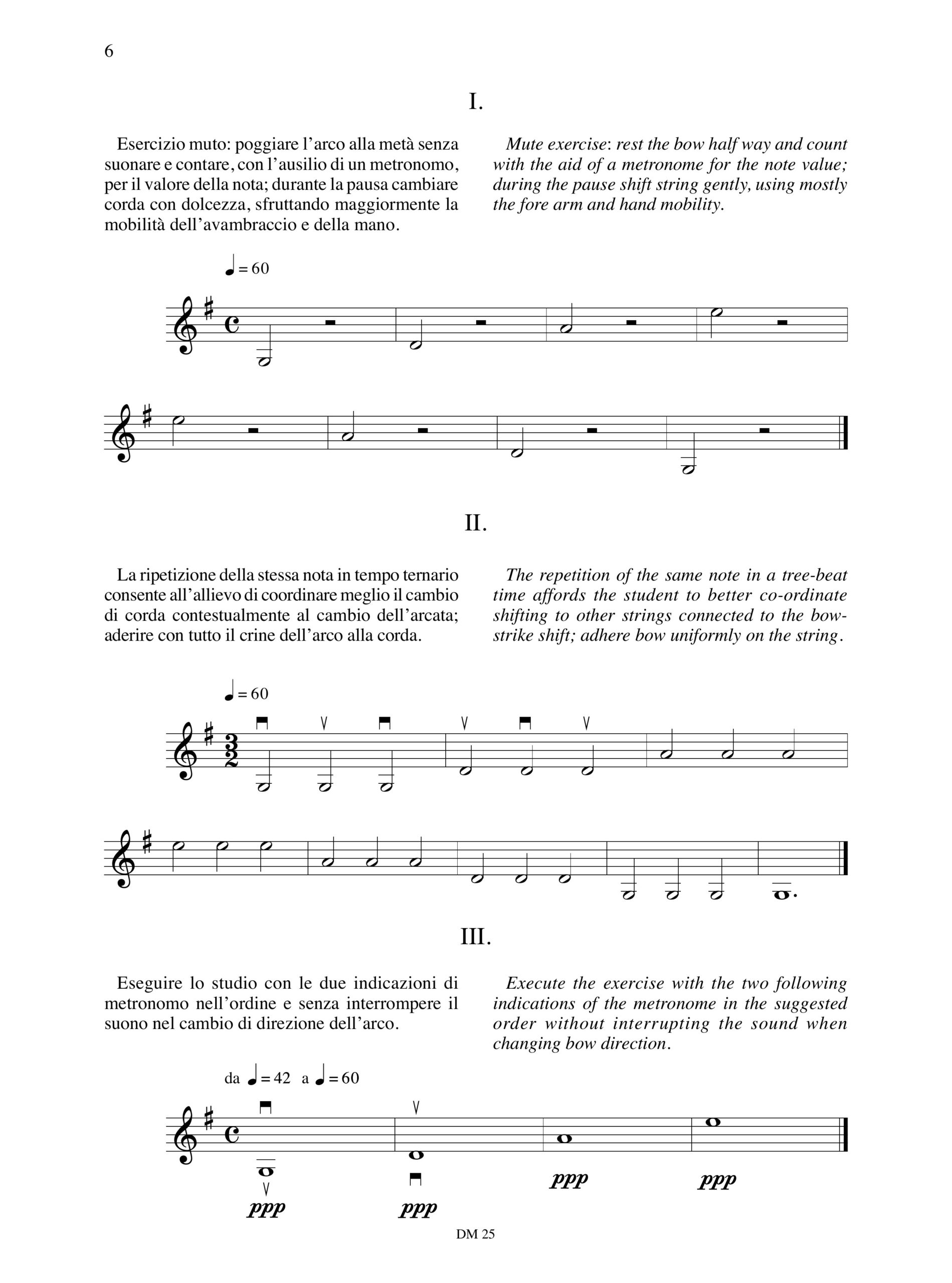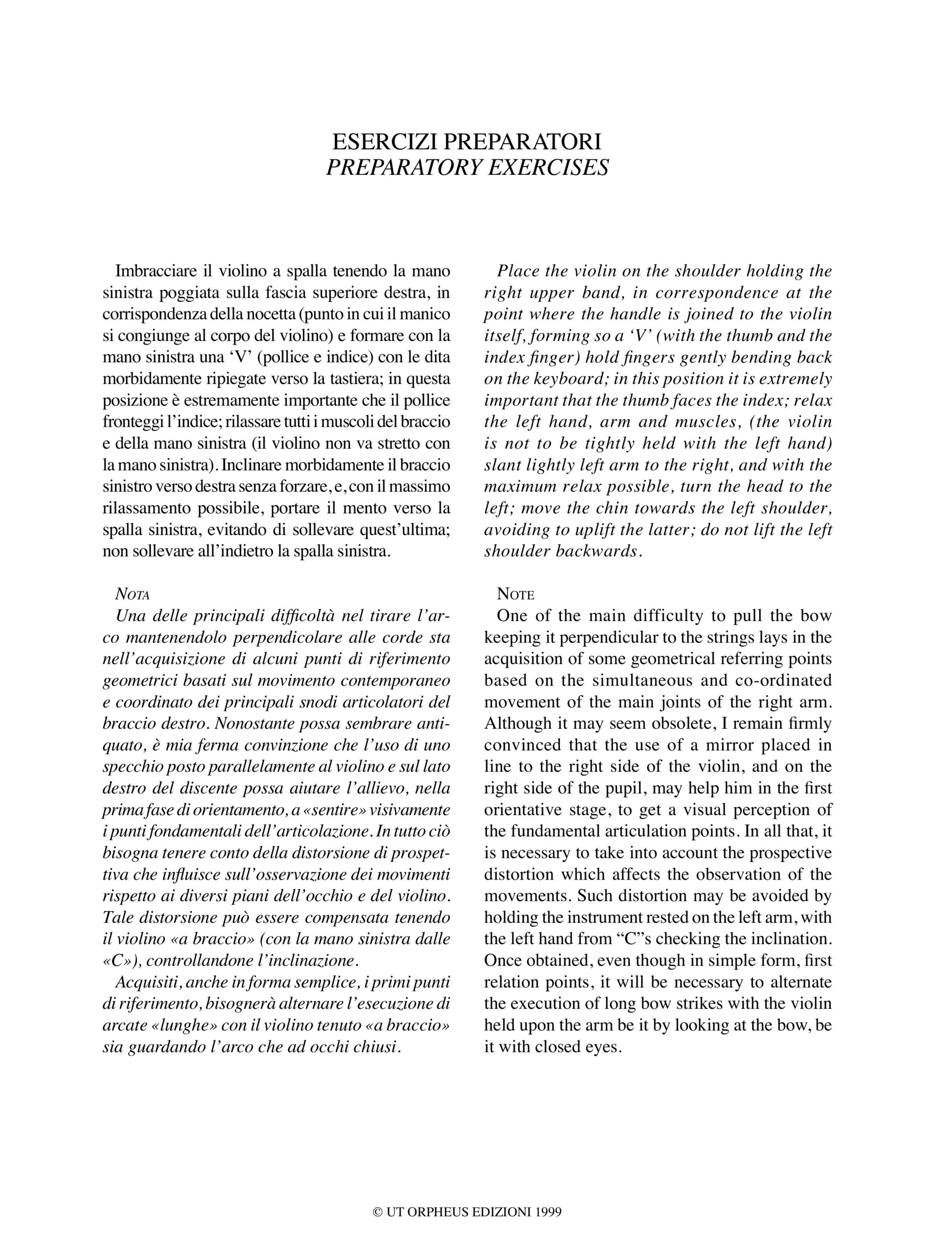 Contenuto e Descrizione: Il metodo in questione affronta le problematiche della coordinazione dell’arco nella fase di approccio allo studio dello strumento, proponendo una serie di esercizi (o moduli) sviluppati per esteso. Questa strategia viene suggerita per abituare il discente alla concentrazione visiva costante sullo scritto e non sullo strumento. Durante lo sviluppo delle unità didattiche viene succintamente affrontato il tema della «memoria muscolare» che riveste un ruolo fondamentale nella prima fase di impostazione metodologica dello studio necessaria per un corretto sviluppo delle capacità di apprendimento del discente. Quasi ogni esercizio è supportato da note introduttive e conclusive che ne spiegano la validità specifica e/o le modalità di esecuzione; va detto che lo sviluppo, sulla base dei moduli fondamentali, dell’ elaborato agli arpeggi è riassunto in forma di estratto negli esempi posti in appendice. Le indicazioni di metronomo sono indicative, e sarà il docente che caso per caso adotterà i tempi più consoni alle capacità dell’allievo. Nella nota finale si suggerisce l’applicazione dei moduli anche alle scale con massima estensione per gli allievi dei corsi superiori. Va detto che la motivazione di fondo del metodo in questione è il desiderio di mettere a disposizione di tutti la possibilità di conoscere da vicino la pratica del violino, abbracciando un settore di fruizione rappresentato dagli allievi che presentano problemi di approccio allo studio dello strumento pur essendone molto attratti.