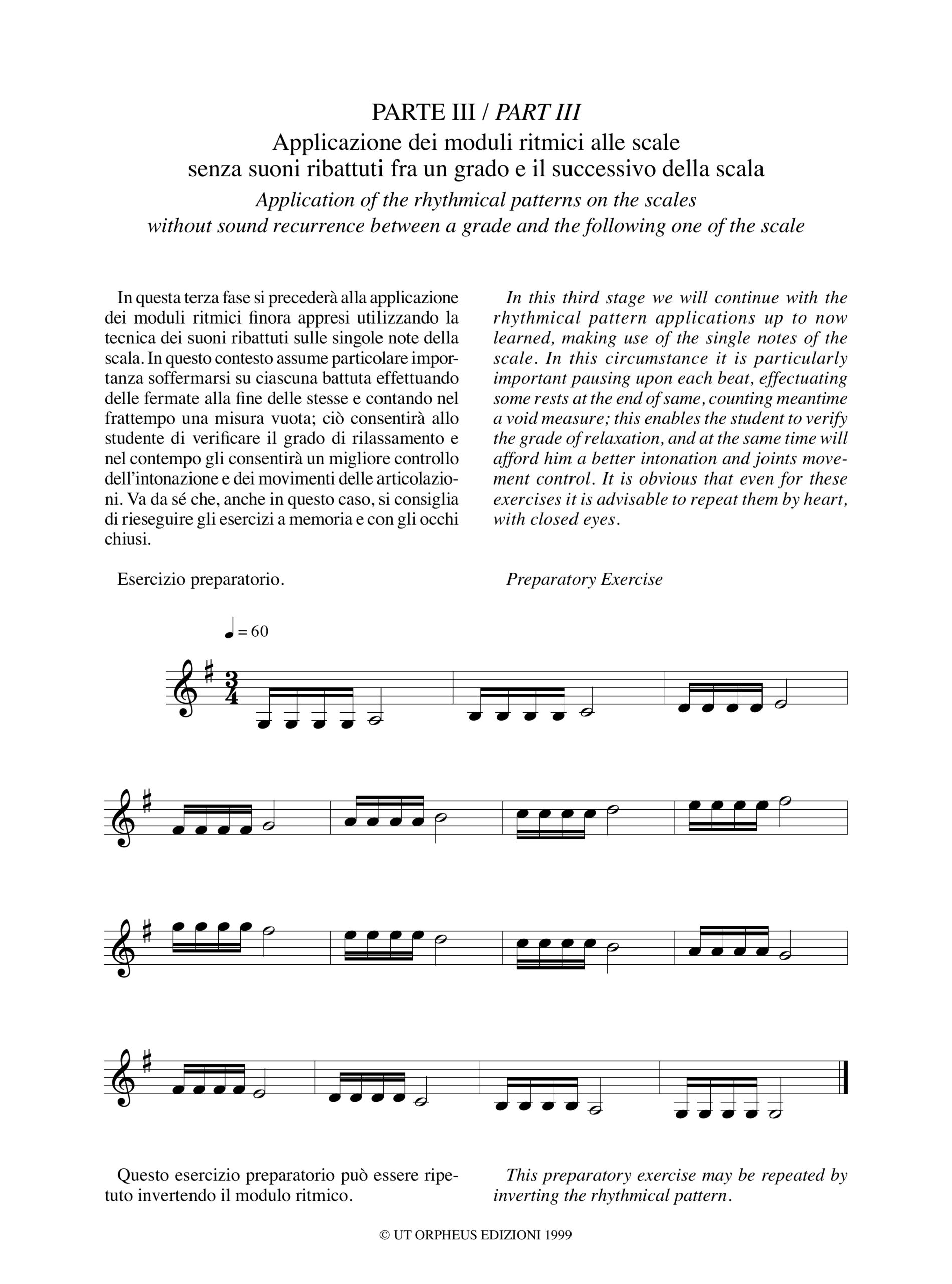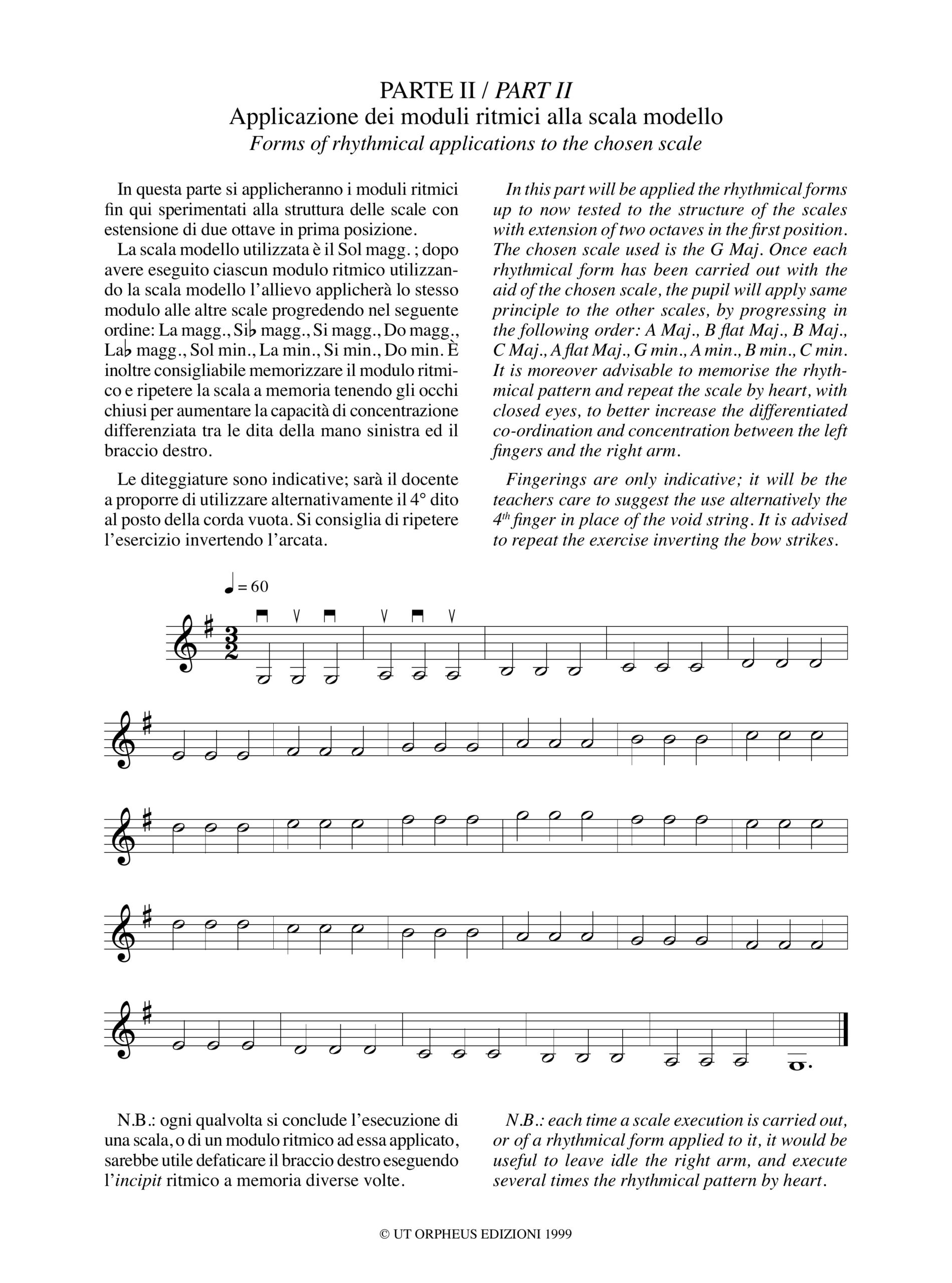 Il seguente breviario si propone di migliorare la capacità dell’allievo alle prime armi a coordinare, in modo progressivo, i movimenti del braccio destro, iniziando dalla applicazione di alcuni moduli ritmici basilari alle corde vuote e gradualmente aggiungendo le scale in prima posizione, e relativi arpeggi, con estensione di due ottave. Ogni modulo ritmico ha una sua peculiarità ed importanza per la distribuzione dell’arco, per l’uso di differenti porzioni d’arco e, di conseguenza, per la corretta sollecitazione dei vari snodi articolatori del braccio destro; per questo motivo è preferibile, nella prima fase (utilizzo delle corde vuote), che l’allievo memorizzi il modulo ritmico per rieseguirlo tenendo gli occhi chiusi, concentrando la propria attenzione sui movimenti che ogni parte del braccio destro sta compiendo, per calibrare correttamente la flessione dei punti fondamentali delle articolazioni interessate (polso, dita, gomito); in tal modo, oltre ad avere minori possibilità di distrazioni visive, si favorirà lo sfruttamento della memoria muscolare, che a mio avviso è una delle componenti fondamentali della tecnica violinistica, inoltre, per mezzo del costante esercizio di questa capacità si incrementa notevolmente la capacità attentiva della vista nella lettura estemporanea.