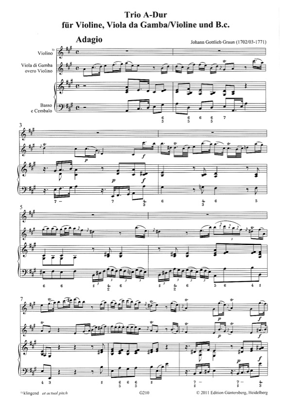 für Violine, Viola da Gamba (Violine) & B. c., GraunWV Av:XV:41, herausgegeben von Michael O“Loghlin. Ein spannendes und anspruchsvolles Werk. Erstausgabe. Edition Güntersberg