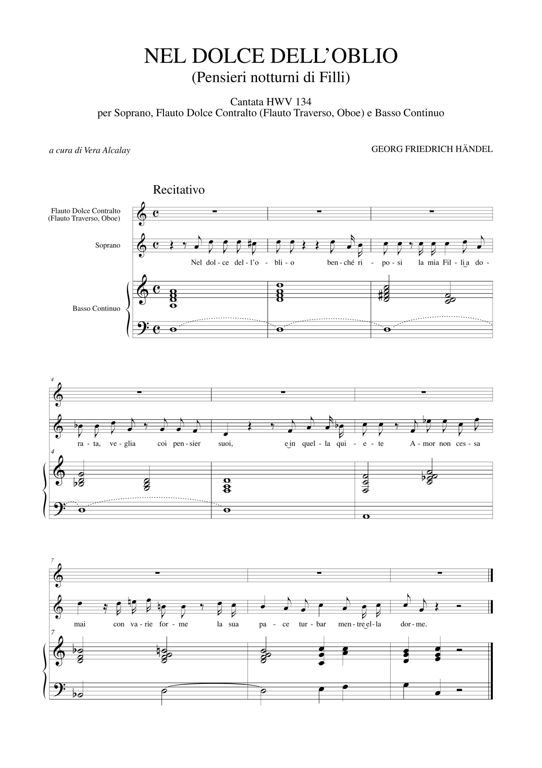 Händel, Georg Friedrich: Nel dolce dell’oblio (Pensieri notturni di Filli). Cantata HWV 134 per Soprano, Flauto Dolce Contralto (Flauto Traverso, Oboe) e Basso Continuo
