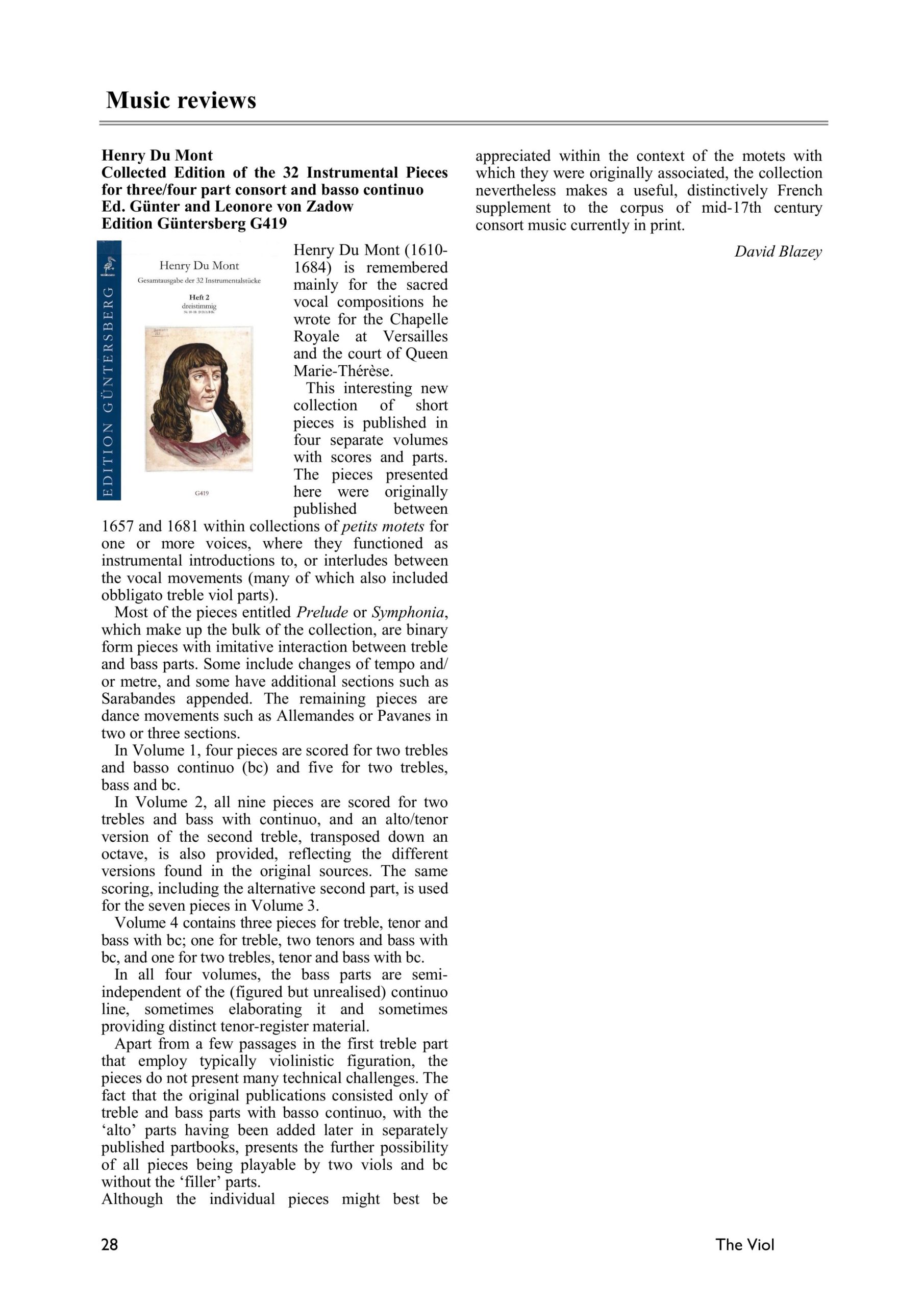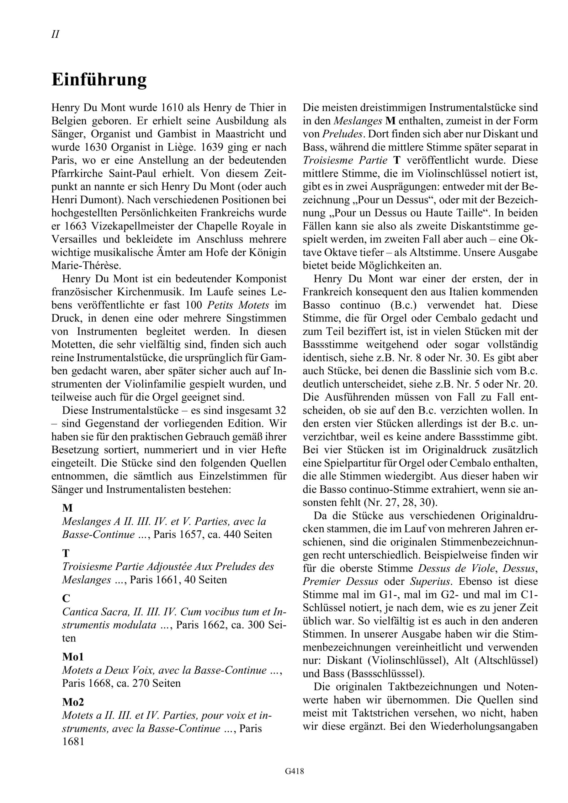 , in denen Singstimmen von Instrumenten begleitet werden. In diesen Motetten, die sehr vielfältig sind, finden sich auch reine Instrumentalstücke, die ursprünglich für Gamben gedacht waren, aber später sicher auch auf Instrumenten der Violinfamilie gespielt wurden. Diese 32 Instrumentalstücke sind Gegenstand unserer auf vier Hefte verteilten Edition. Die Stücke sind zumeist dreistimmig, in Heft 4 zum Teil auch vierstimmig. Ein Basso continuo, der sich stellenweise von der Bassstimme deutlich unterscheidet, kommt hinzu. Die polyphone Musik Henry Du Monts kommt aus der französischen Tradition, weist aber auch deutliche italienische Einflüsse auf.