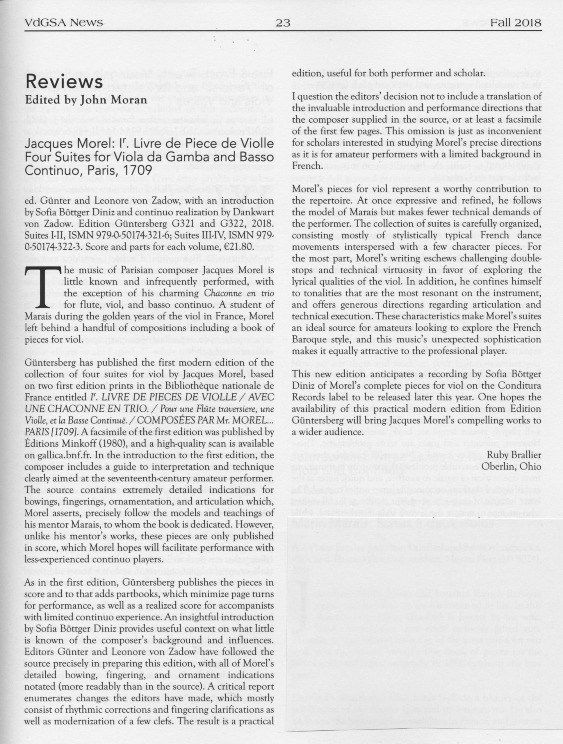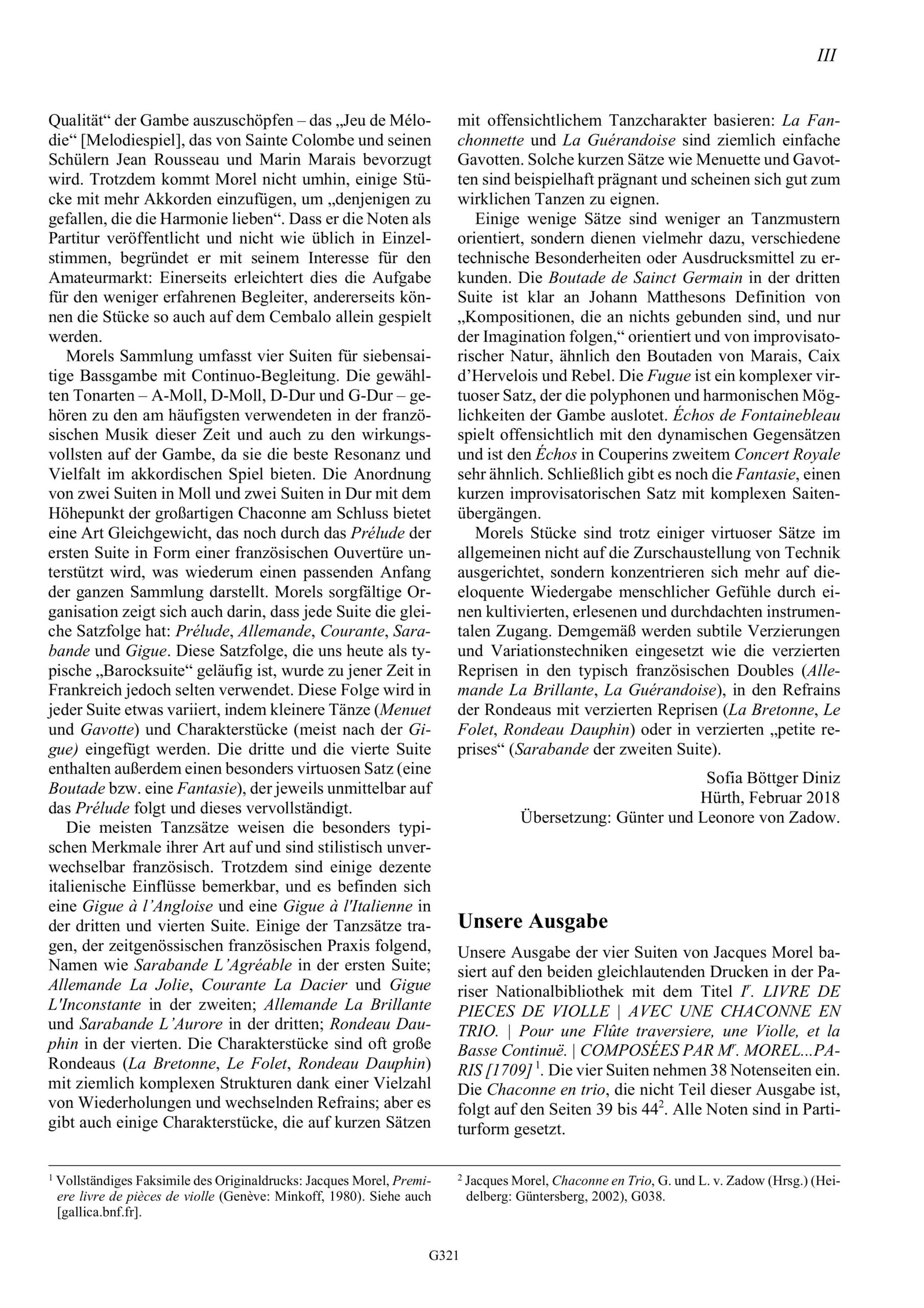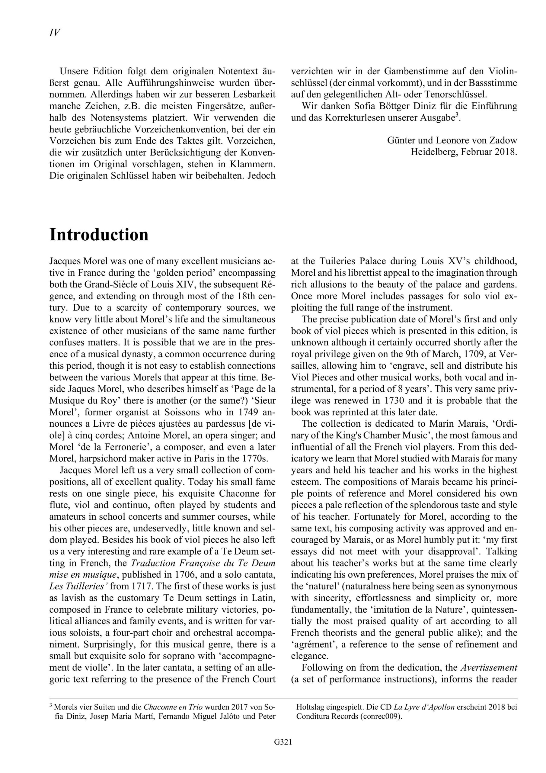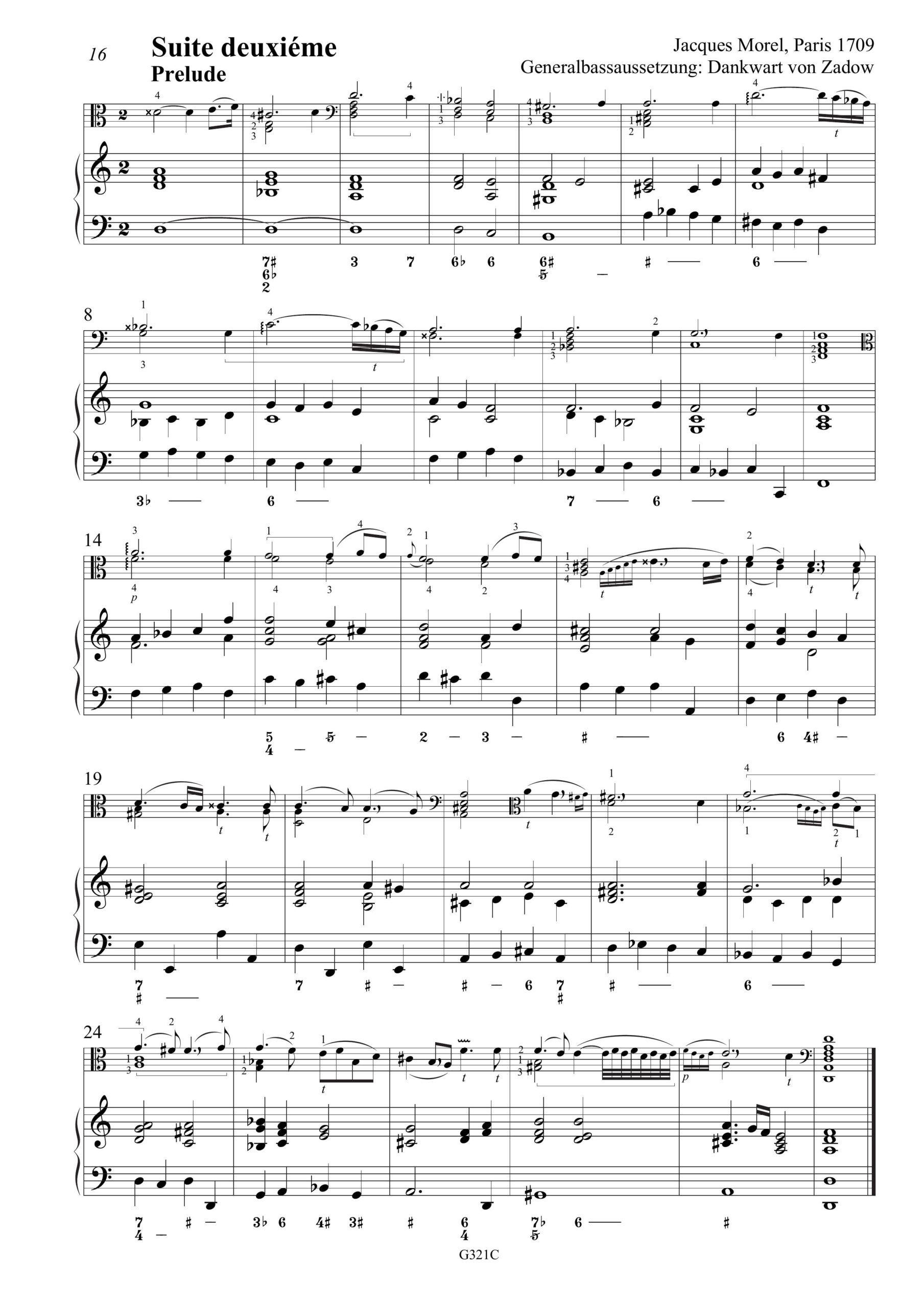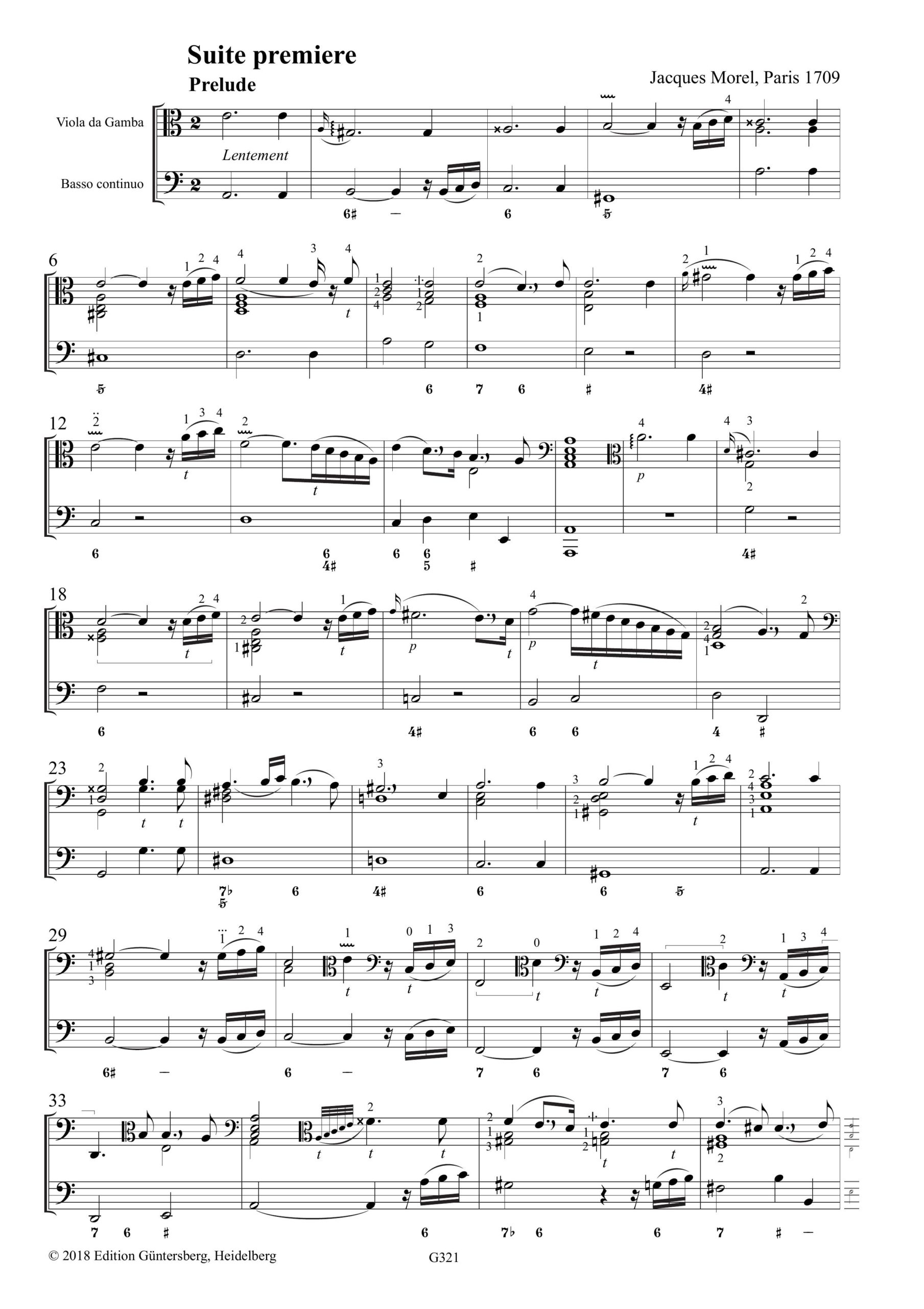 Der französische Komponist und Schüler von Marin Marais, Jacques Morel, ist vor allem durch seine erlesene Chaconne für Traversflöte, Viola da Gamba und Basso continuo bekannt, und diese gehört auch schon seit langem zu dem Programm von Edition Güntersberg (G038). Seine vier großartigen Gambensuiten sind jedoch unverdientermaßen weniger bekannt, obwohl sie zu den Perlen französischer Kompositionen für dieses Instrument gehören. Morel orientiert sich stilistisch an Marais, aber er wendet sich ausdrücklich an Liebhaber, weshalb seine Stücke größtenteils einen geringeren Schwierigkeitsgrad aufweisen. Unsere Neuausgabe folgt dem originalen Notentext äußerst genau und enthält die mannigfachen Aufführungshinweise des Originaldrucks von 1709. Die Ausgabe enthält auch Einzelstimmen sowie eine separate Partitur mit Generalbassaussetzung. Eine ausführliche Einführung der Gambistin Sofia Böttger Diniz rundet unsere Ausgabe ab.