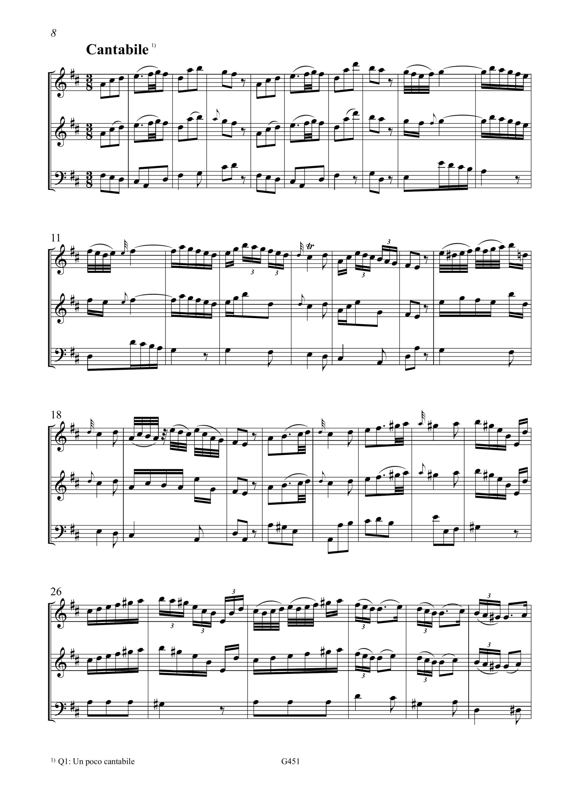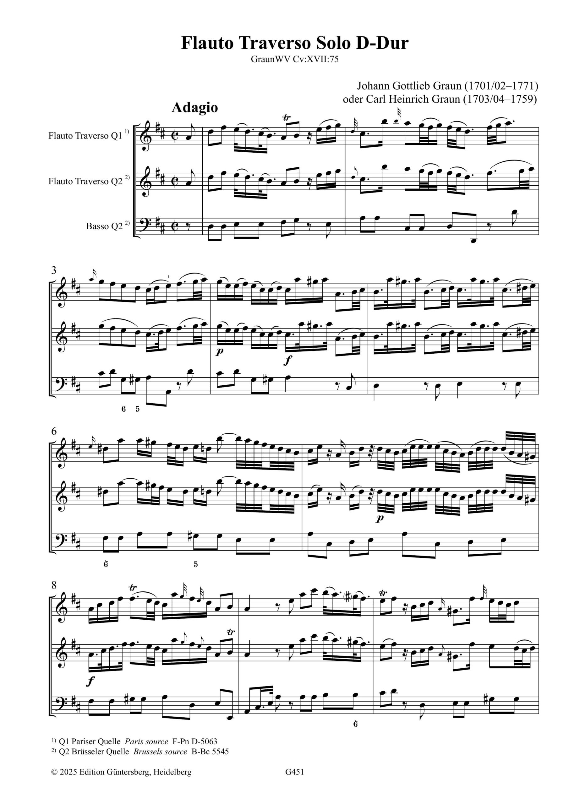 Johann Gottlieb Graun oder Carl Heinrich Graun, Solo für Traversflöte und Basso continuo in D-Dur, GraunWV Cv:XVII:75, Fl+Bc, Partitur, 2. Partitur mit Aussetzung, 2 Stimmen, 48 S., ISMN 979-0-50174-451-0