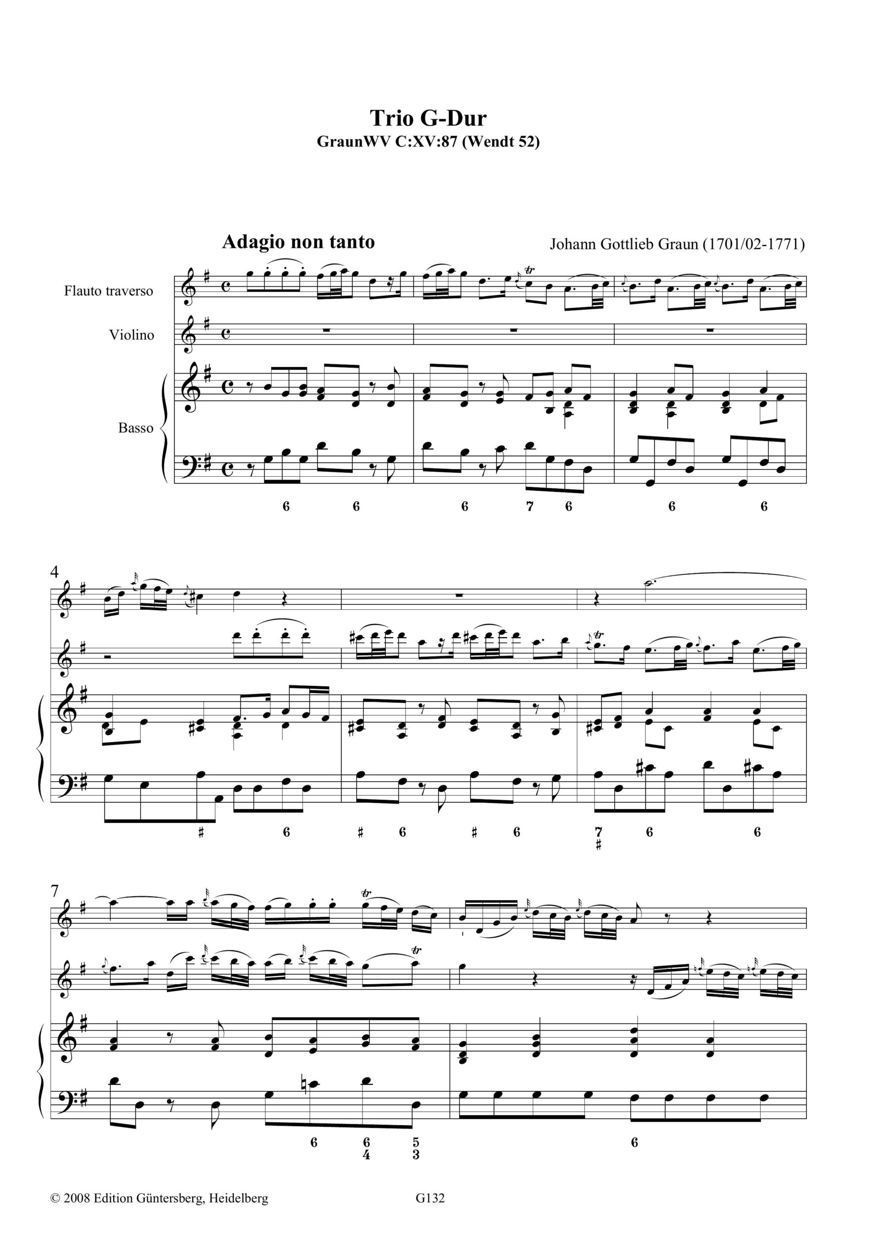 J.G. Graun, Trio G-Dur für Traversflöte, Violine und Basso continuo, Graun WV C:XV:87 (Wendt 52), Erstausgabe, Fl+V+Bc, Partitur mit Aussetzung, 3 Stimmen, 36 S., ISMN 979-0-50174-132-8