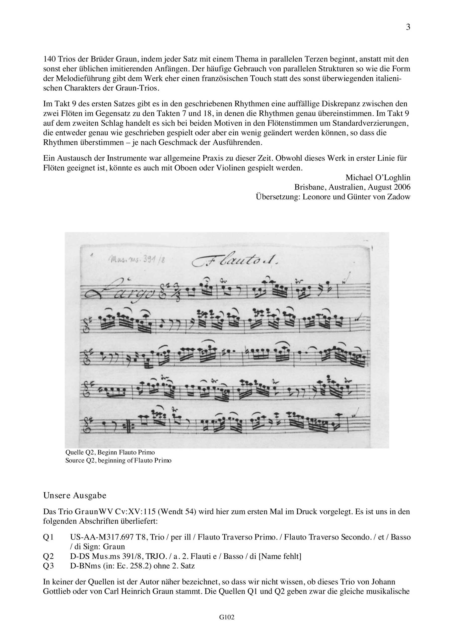Graun, Trio G-Dur, für 2 Flöten und B.c., Erstausgabe, 2Fl+Bc, Partitur mit Aussetzung, 3 Stimmen, 24 S., ISMN 979-0-50174-102-1