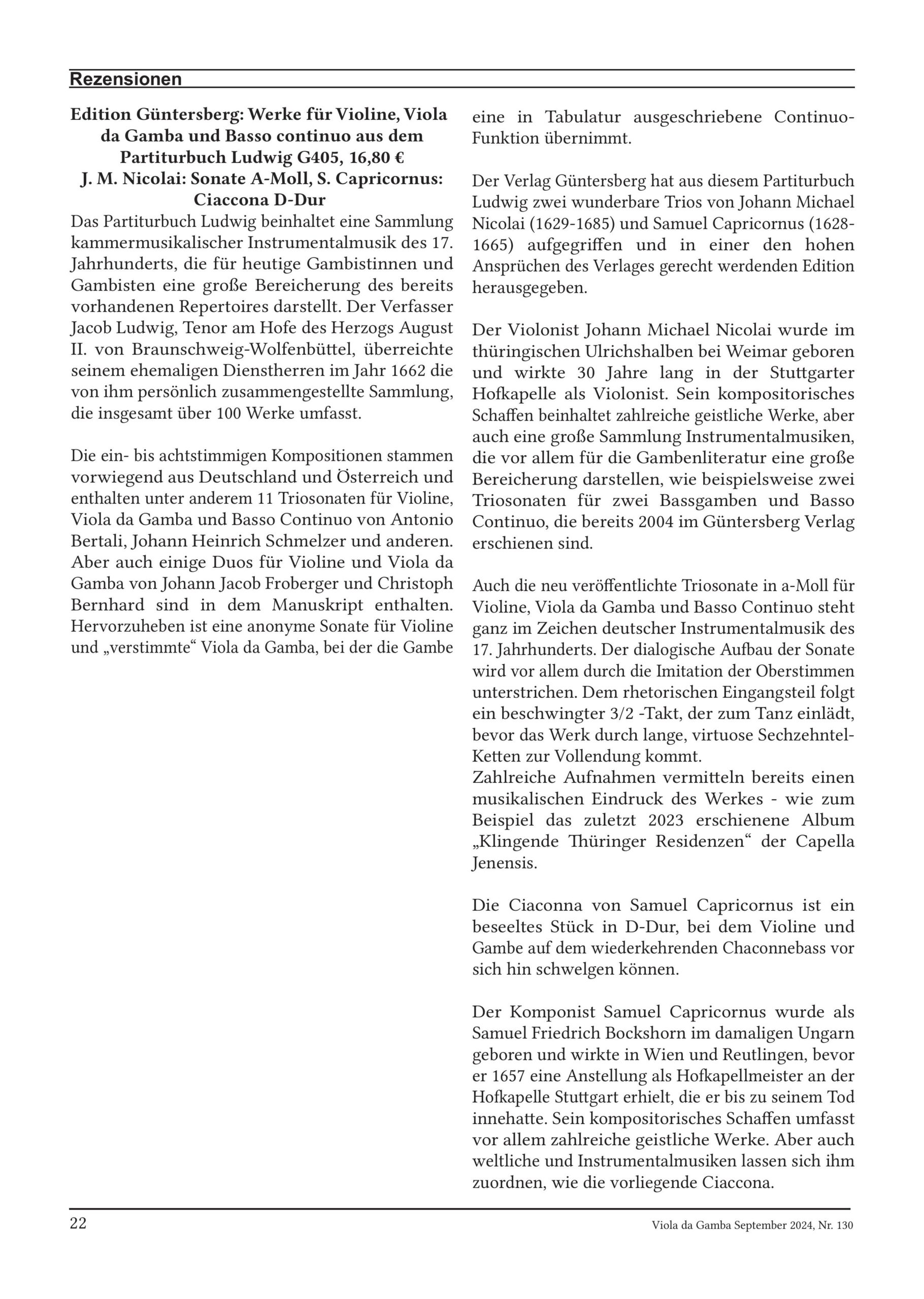 Johann Michael Nicolai, Samuel Capricornus (1629–1685, 1628–1665) Sonata A-Moll, Ciaccona D-Dur – für Violine, Viola da Gamba und Basso continuo