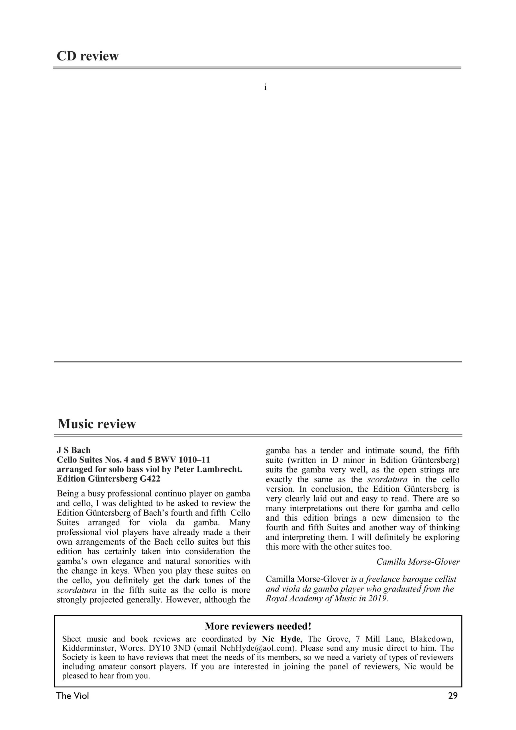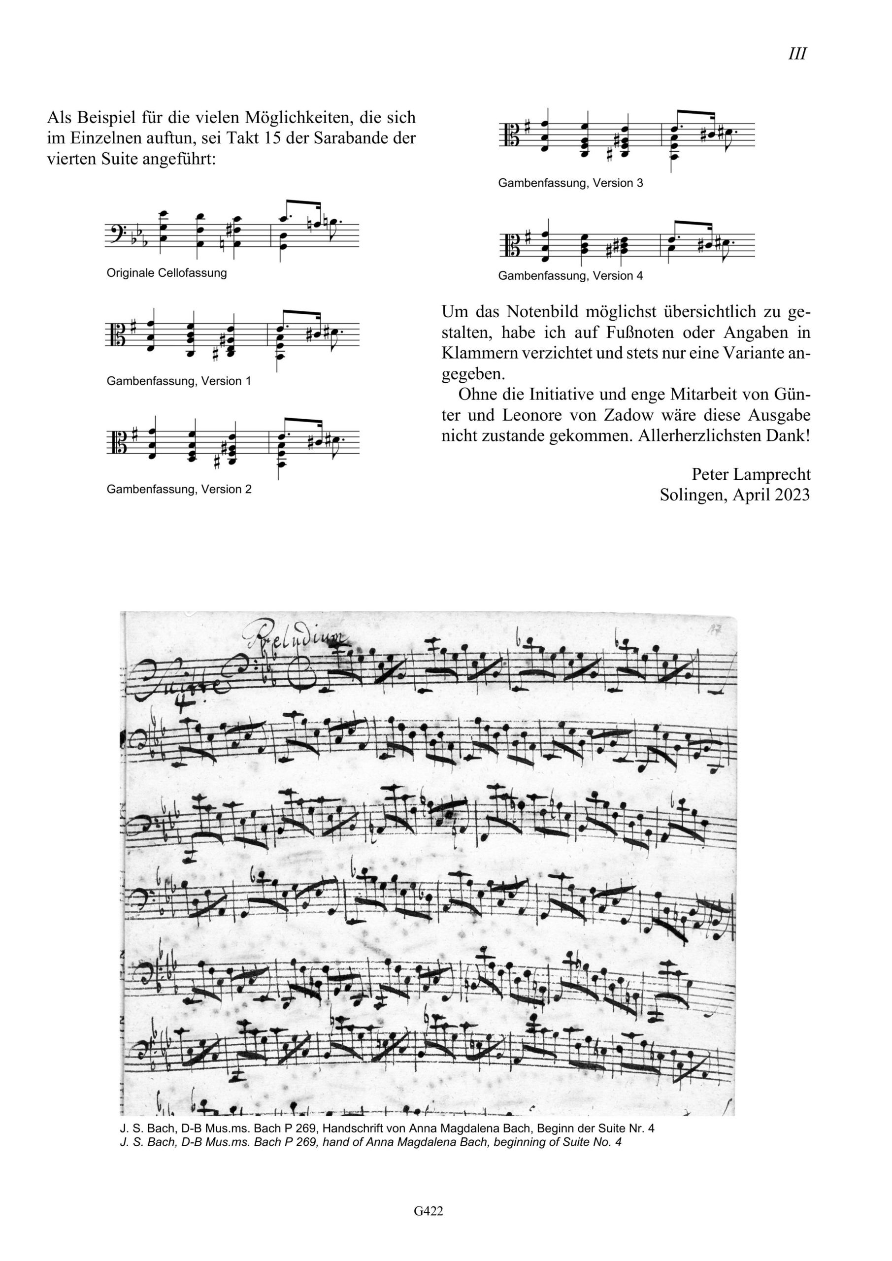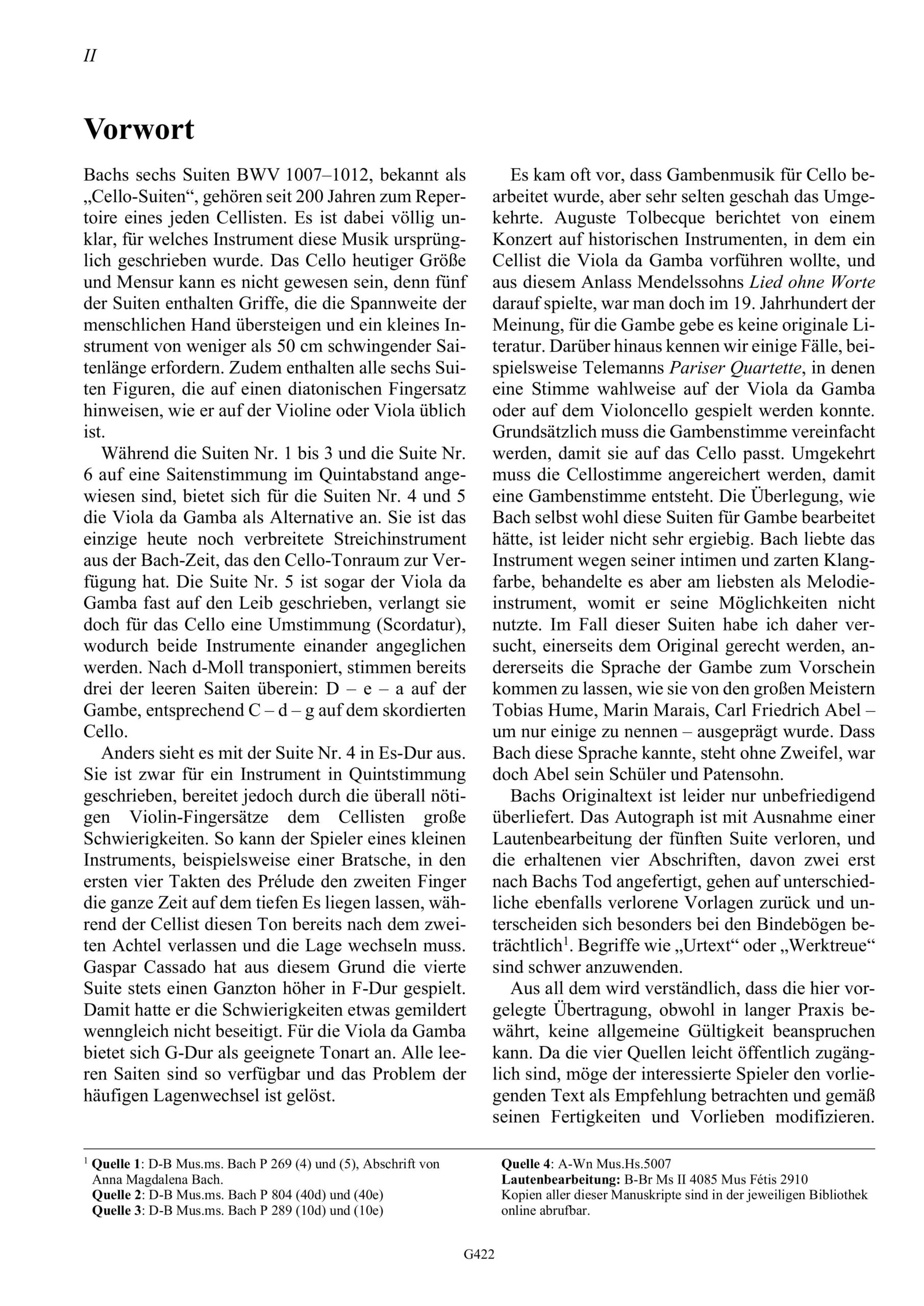 Obwohl Bachs Cellosuiten zum Repertoire eines jeden Cellisten gehören, ist bis heute unklar, für welches Instrument sie eigentlich komponiert wurden. Das heutige Cello eignet sich dafür nur bedingt, was besonders für die Suiten Nr. 4 und 5 gilt. Der Cellist und Gambist Peter Lamprecht hat für uns diese beiden Suiten für die Viola da Gamba bearbeitet. Dabei hat er die Suite Nr. 5, die auf dem Cello eine Skordatur erfordert, nach d-Moll transponiert, wodurch auf der Gambe vieles wie von selbst in der Hand liegt. Seine Edition ist für die Praxis gedacht und enthält gelegentlich auch Fingersätze und Strichbezeichnungen. Ohne die Frage beantworten zu wollen, ob die Gambe womöglich das Instrument ist, das Bach für diese Suiten im Sinne hatte, bietet diese Ausgabe den Gambisten die Möglichkeit, diese wundervolle und einmalige Musik selbst zu erfahren.