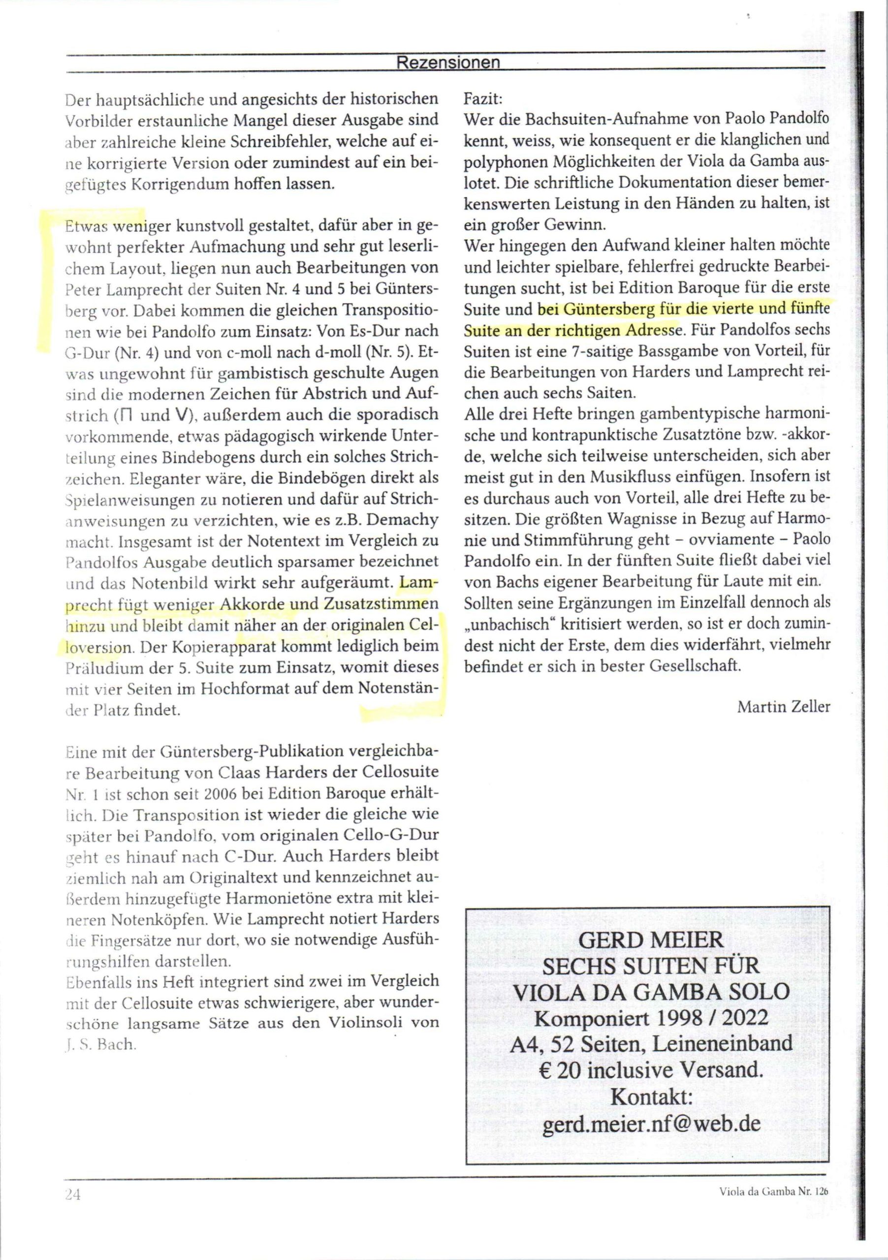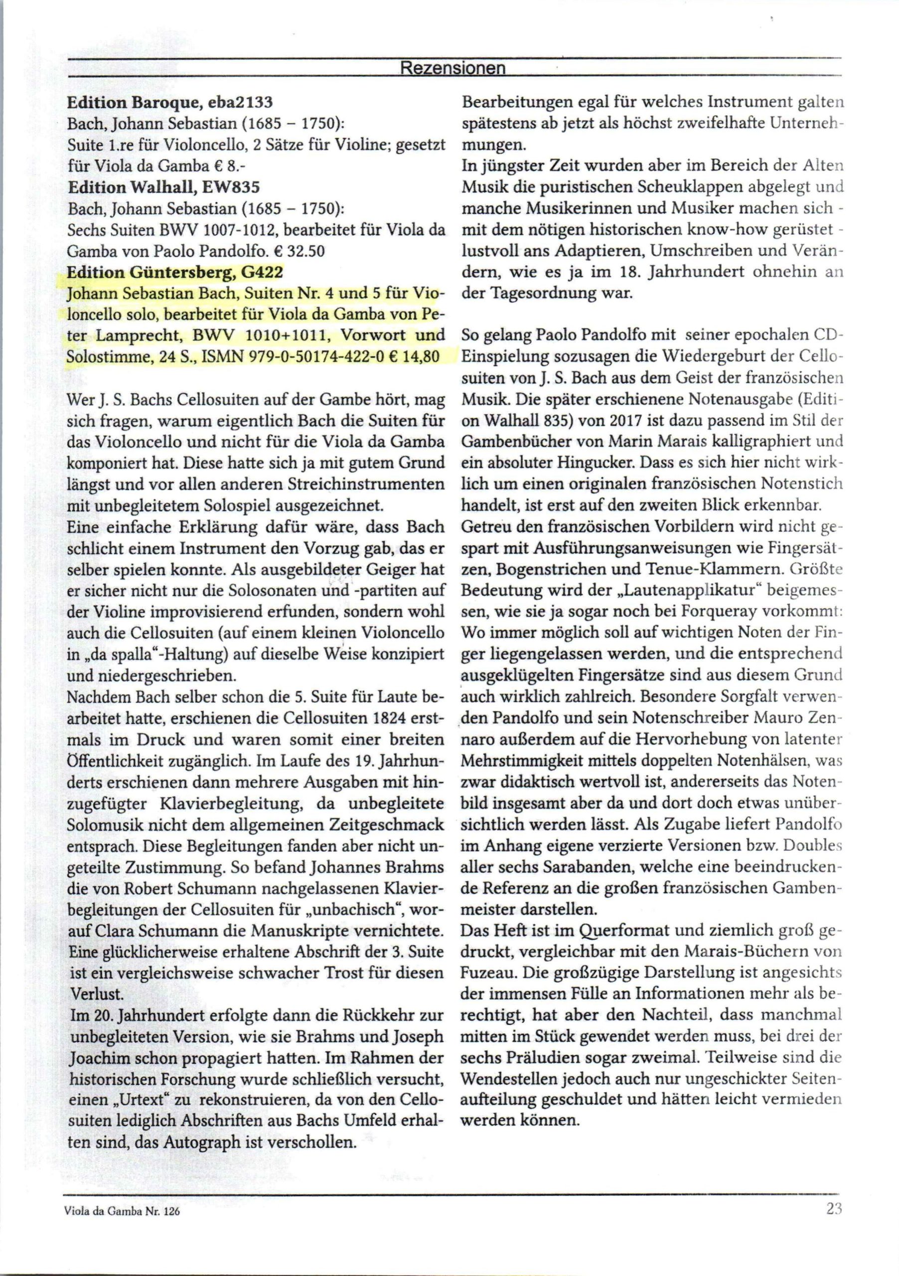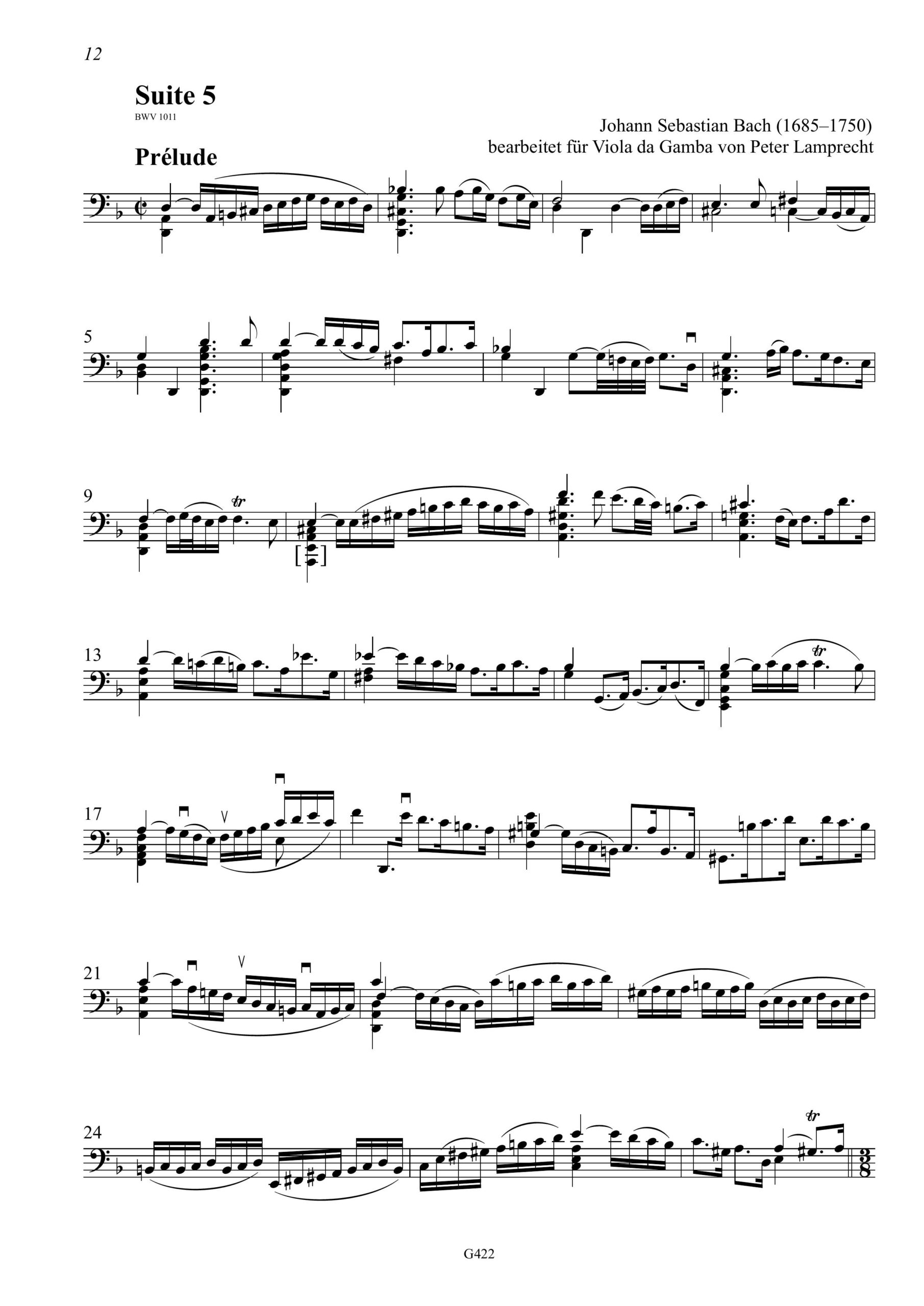 Johann Sebastian Bach, Suiten Nr. 4 und 5 für Violoncello solo, bearbeitet für Viola da Gamba von Peter Lamprecht, BWV 1010+1011, VdG, Vorwort und Solostimme, 24 S., ISMN 979-0-50174-422-0