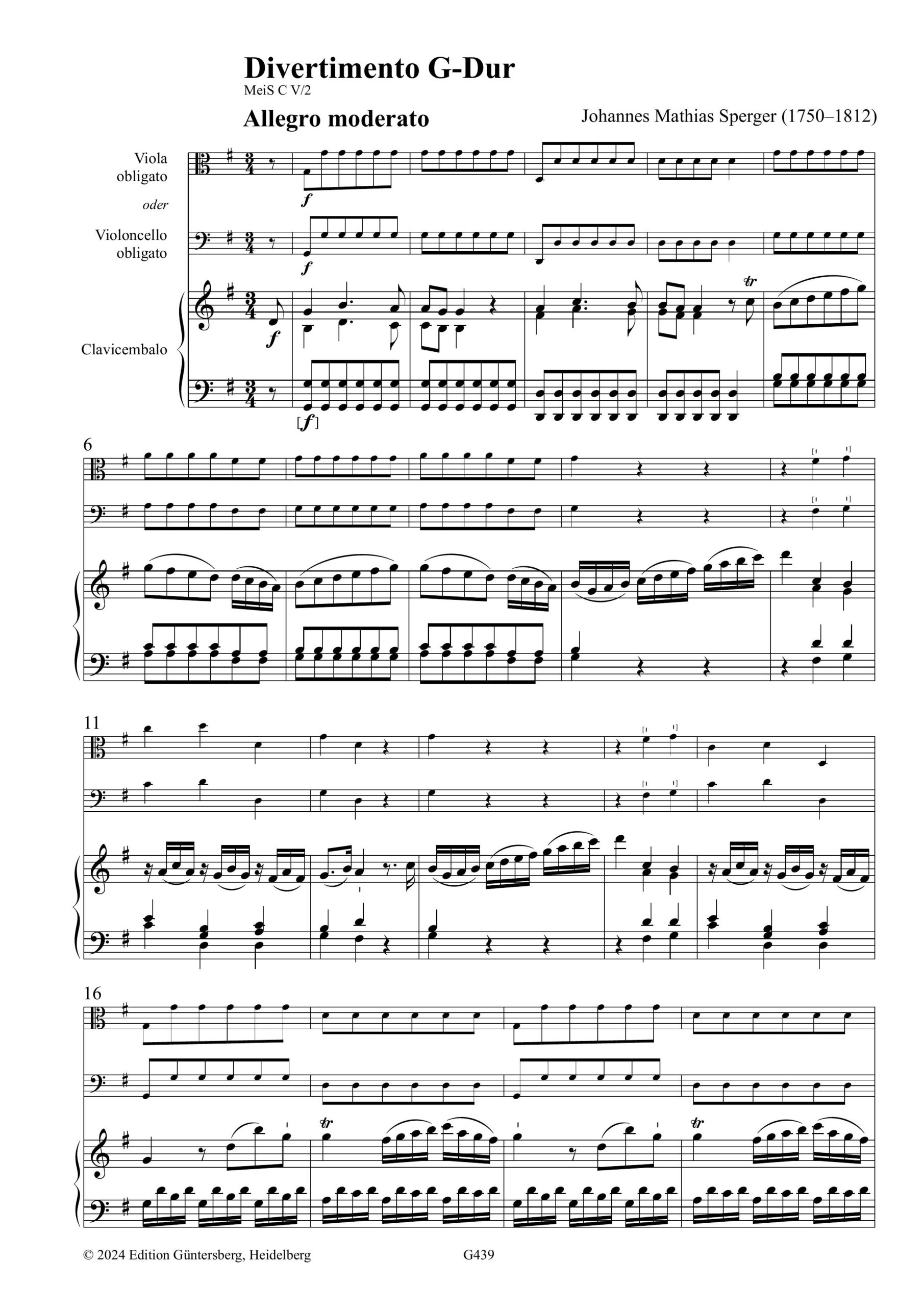 Johannes Mathias Sperger, Vier Divertimenti, MeiS C V/2, Heft 1 – Divertimento G-Dur, Erstausgabe, Cemb/Piano+Vc/Va, Partitur und 3 Einzelstimmen, 44 S., ISMN 979-0-50174-439-8