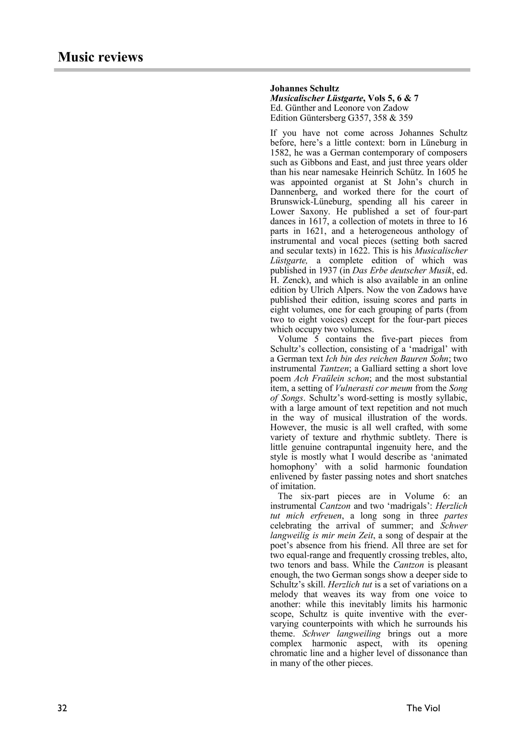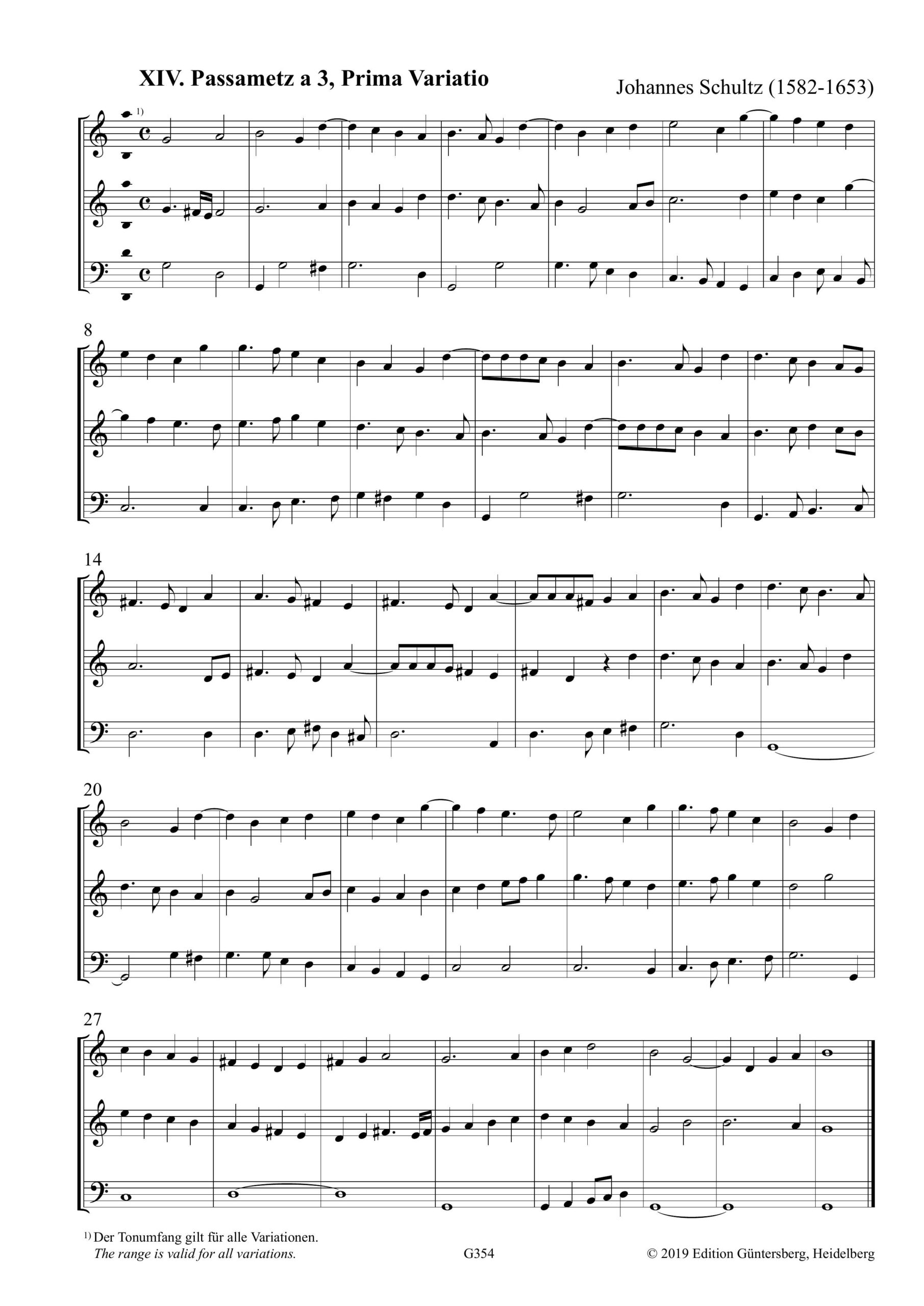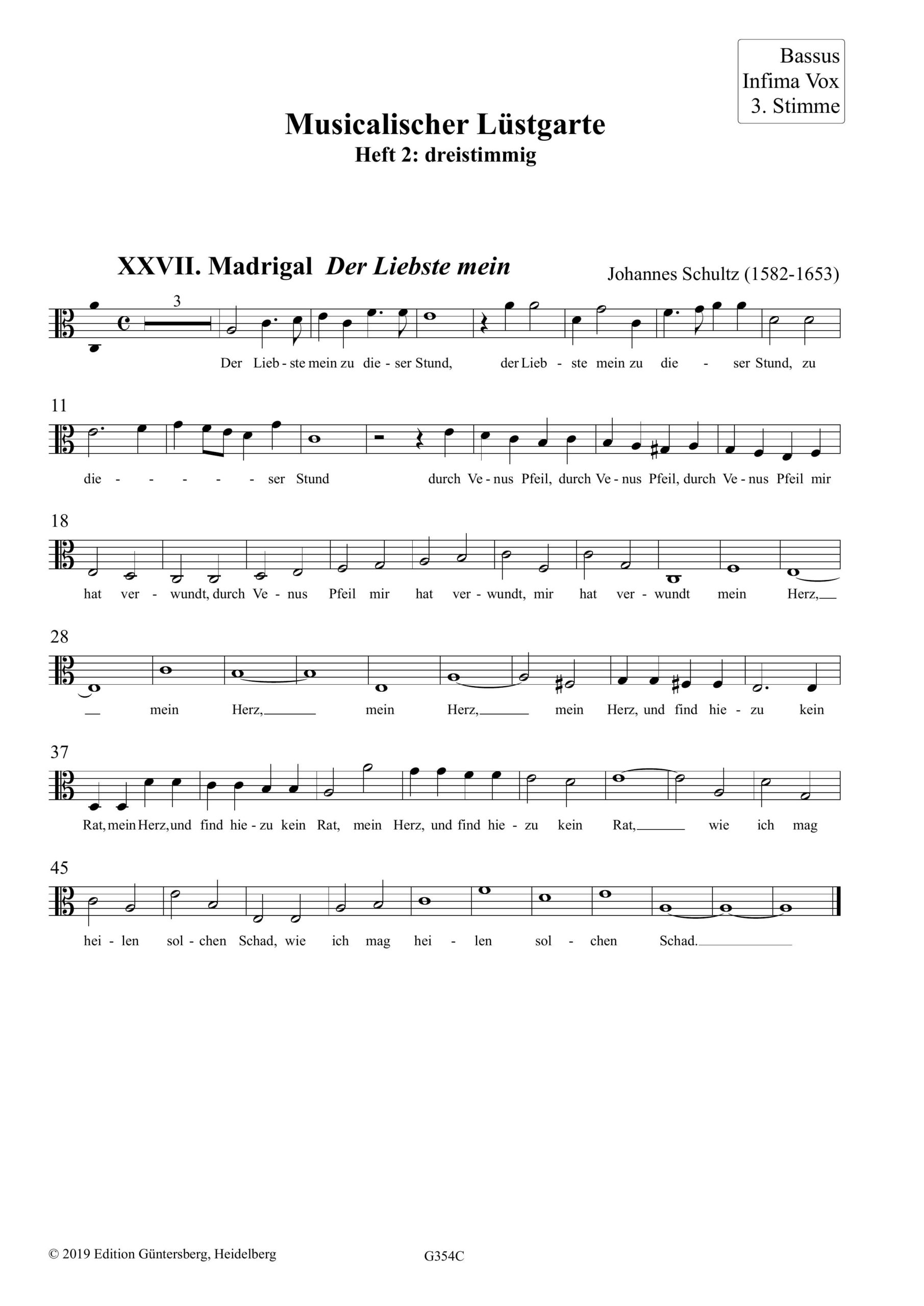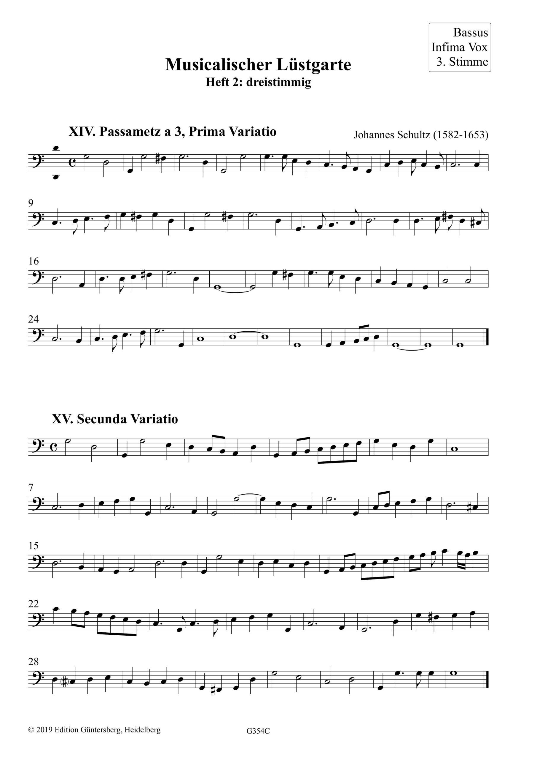 Schultz, Musicalischer Lüstgarte, Heft 2: dreistimmig, 3Cons, Partitur und drei Stimmen, 60 S., ISMN 979-0-50174-354-4